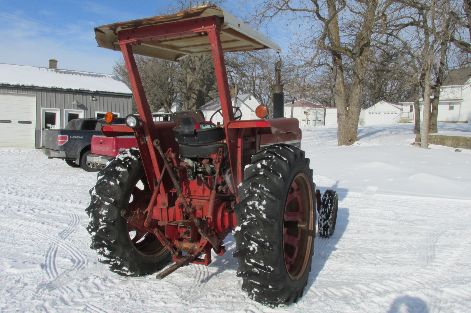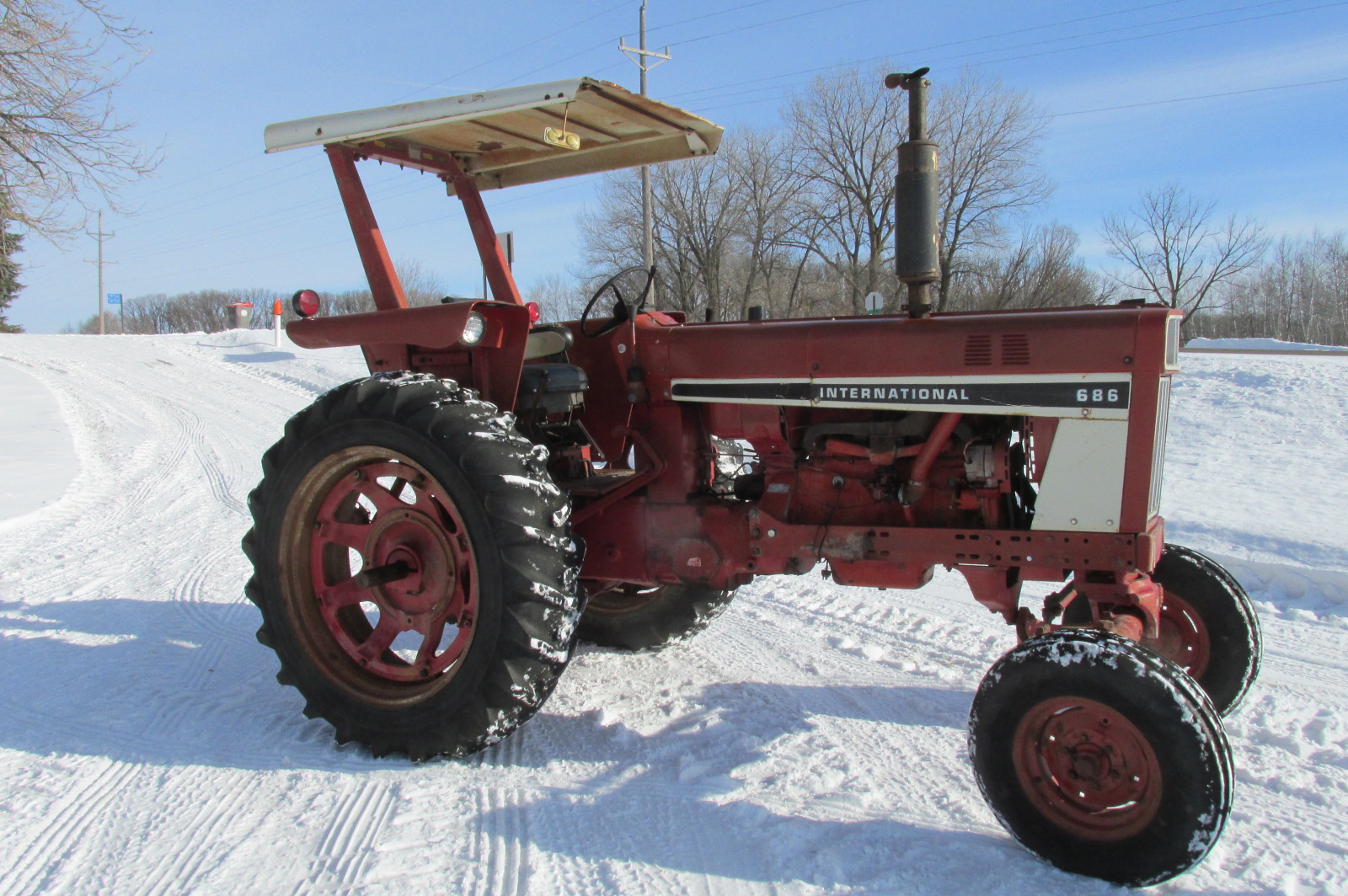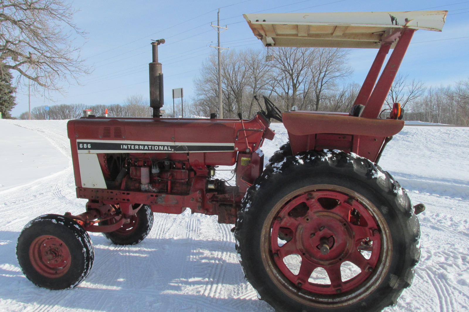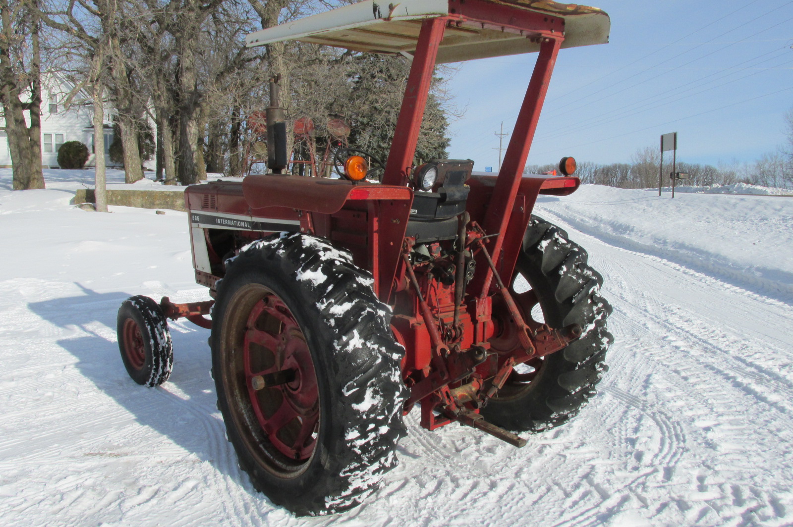 International model 686 gas tractor with 3 point hitch, dual hydraulics, wide front and factory roll bar.