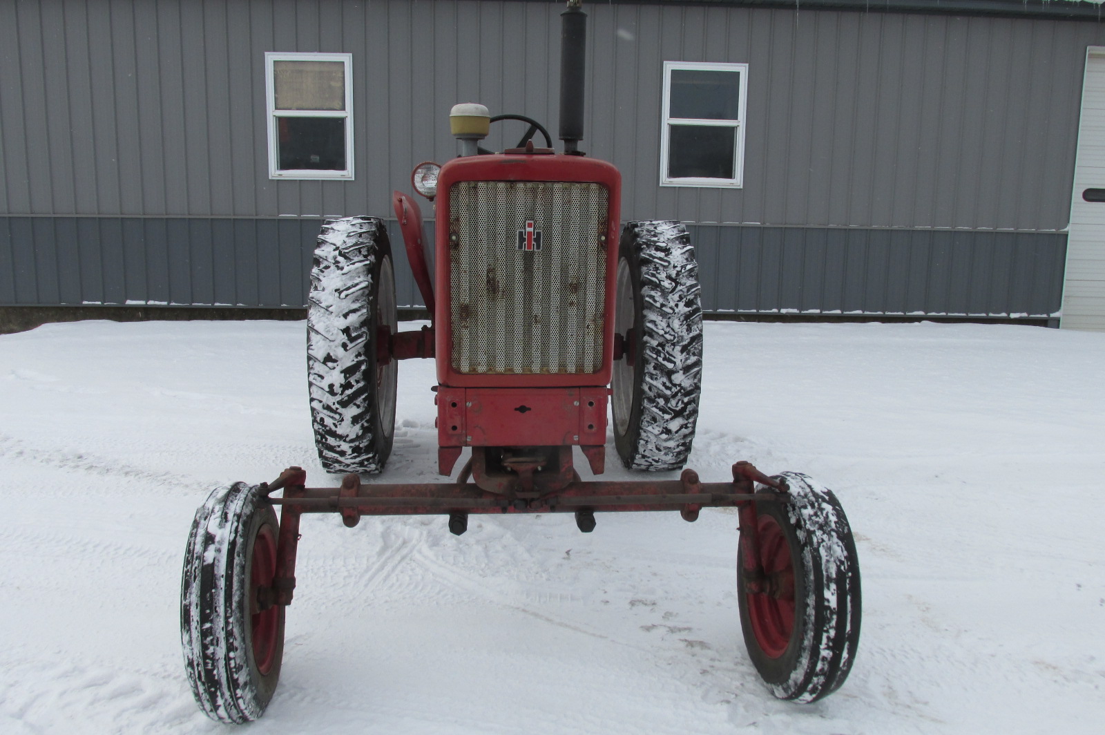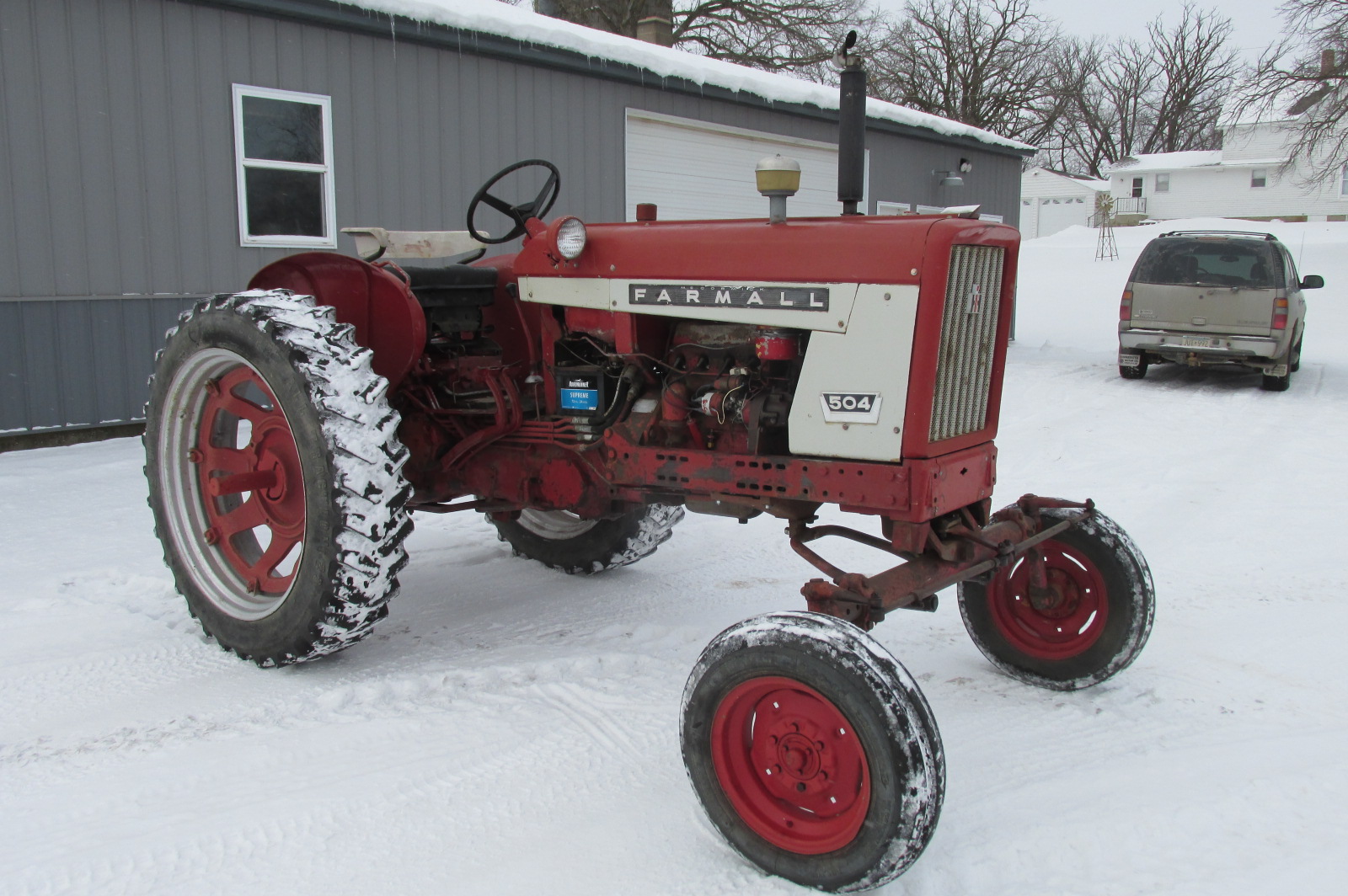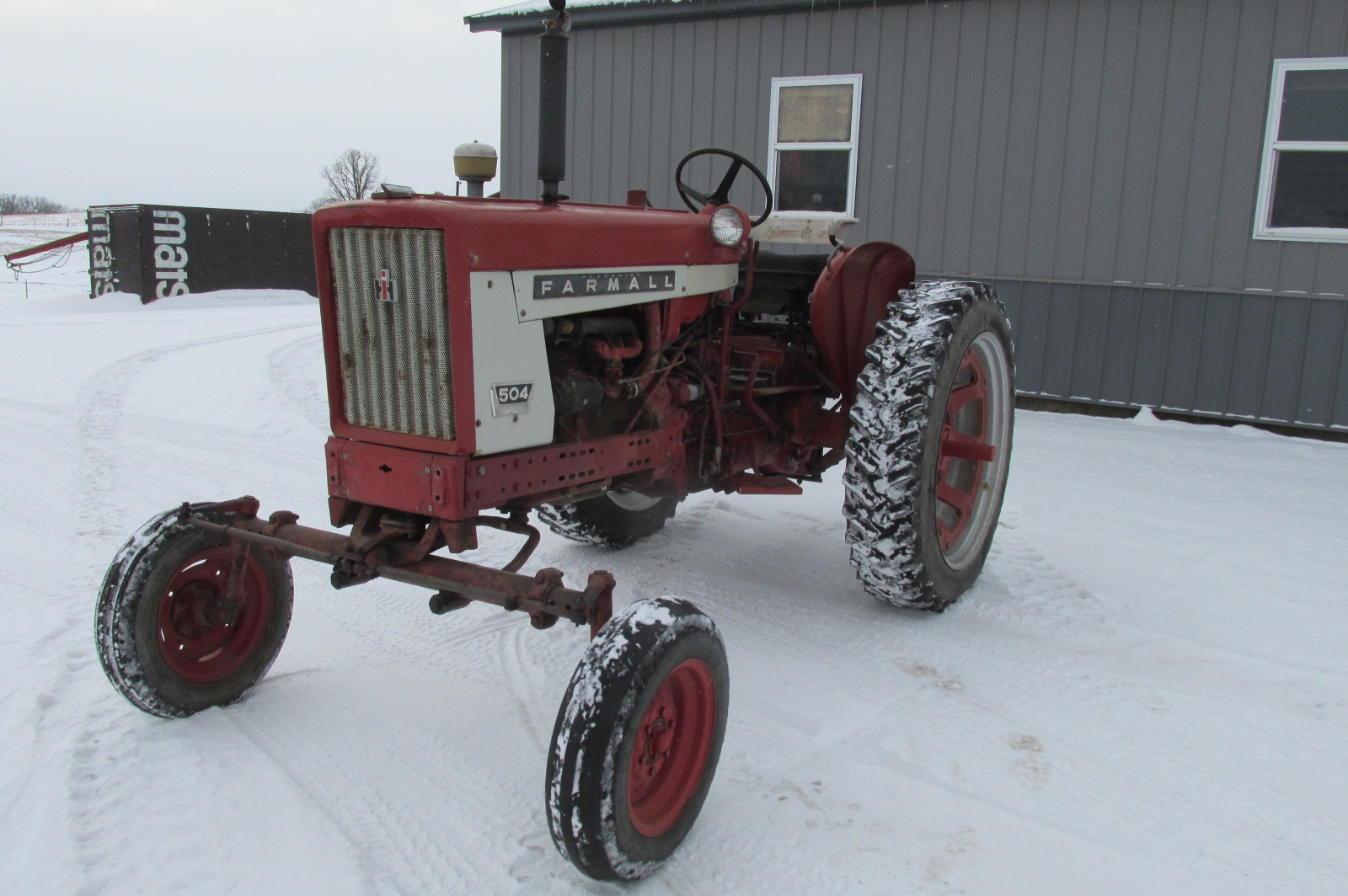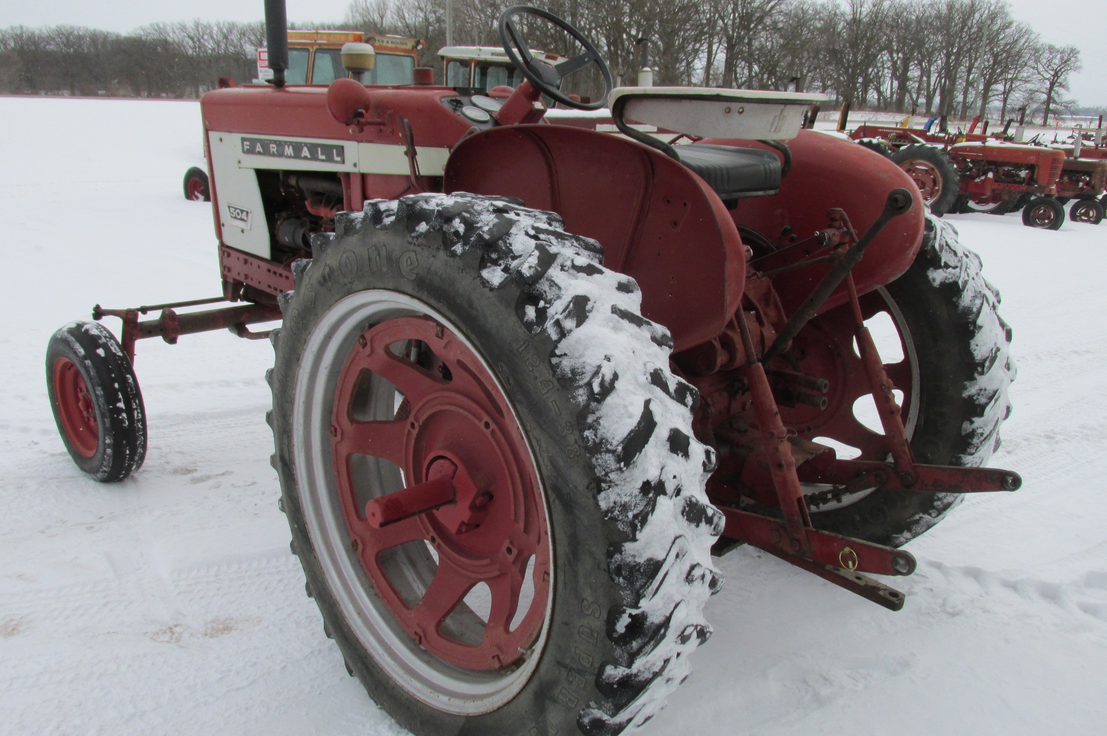 International 504 gas tractor with 3 point hitch, factory wide front and factory fenders.