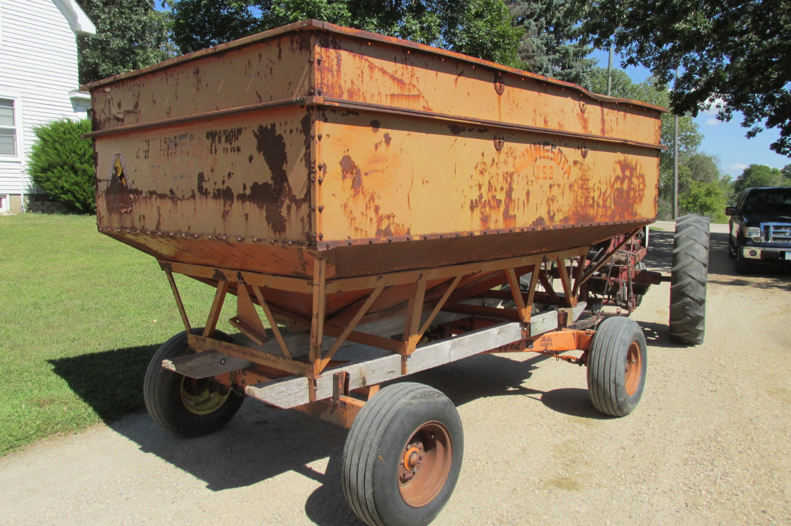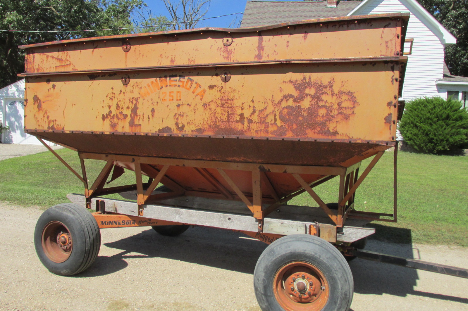 Minnesota model 250 gravity box and Minnesota 8 ton wagon with telescopic hitch and flotation tires.