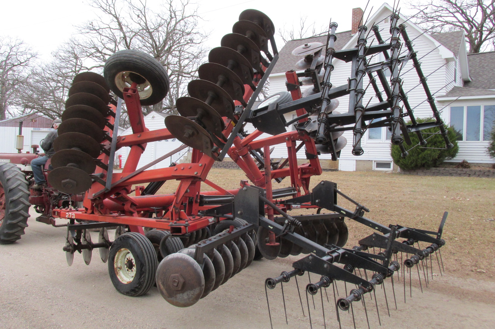 White model 273 21.6 foot rock cushion disc with 3 bar mounted mulcher harrow.
