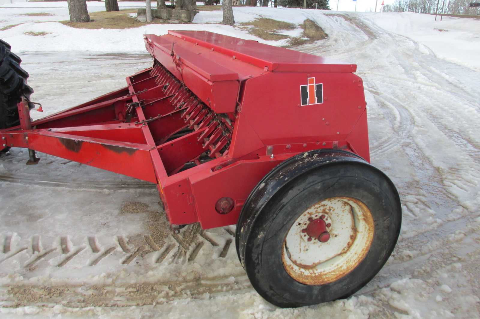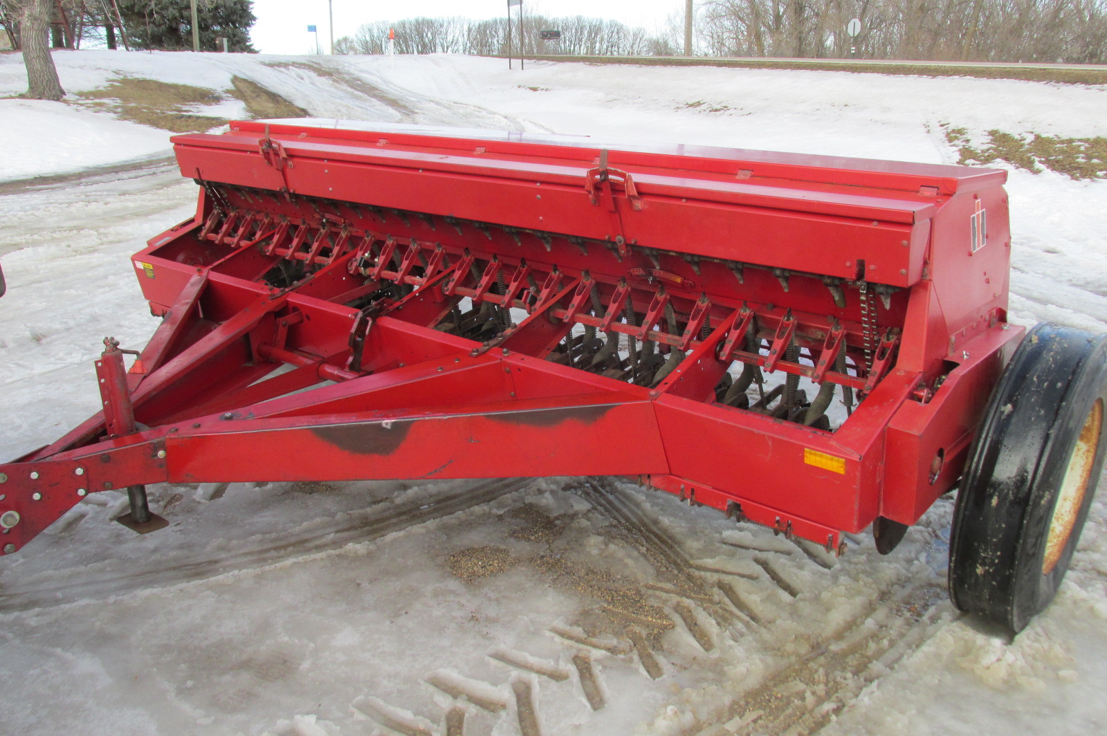 International 5100 12 foot (24x6") end wheel grain drill with grass seeder attachment. Greased up and ready for the field.
