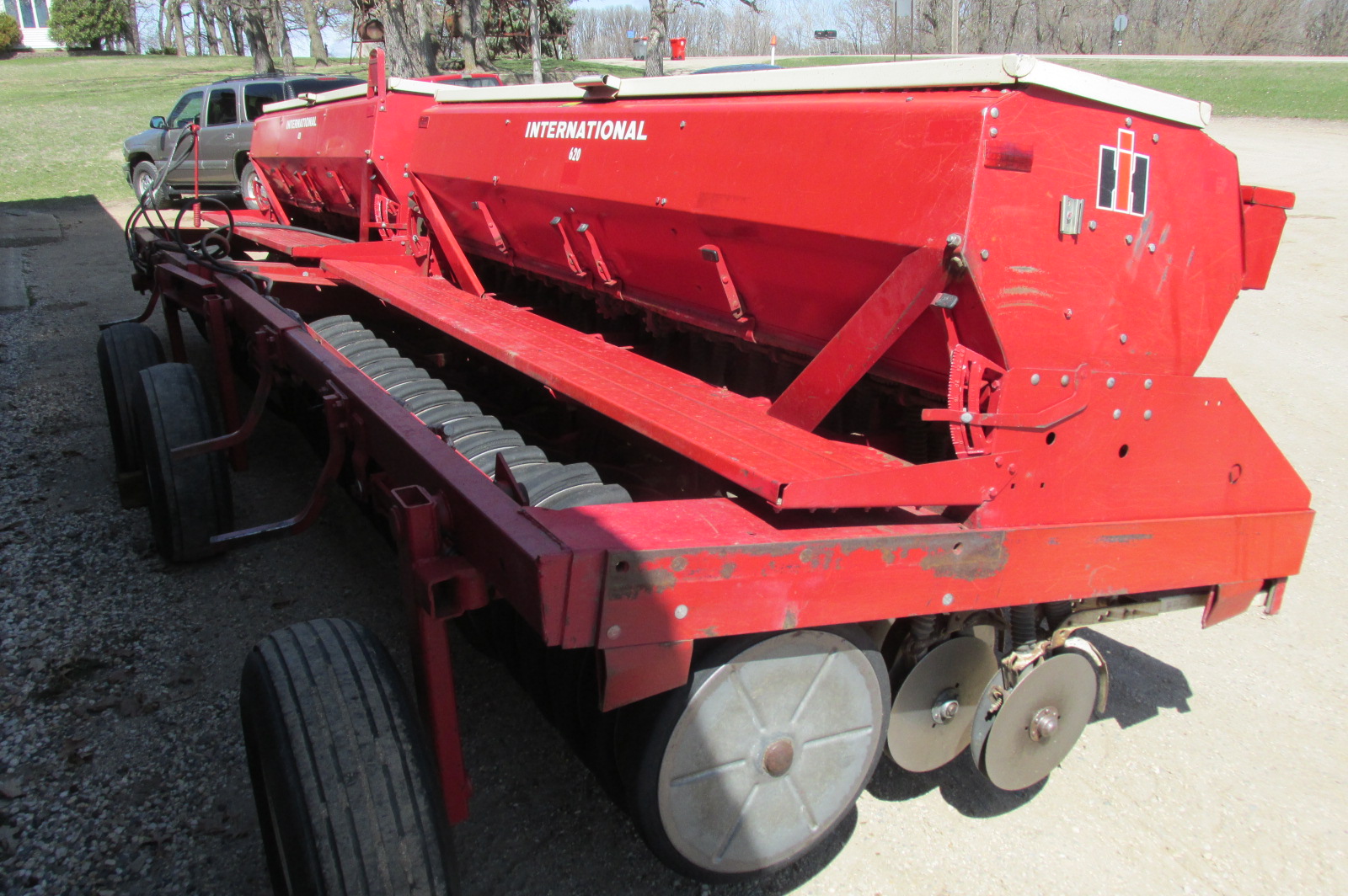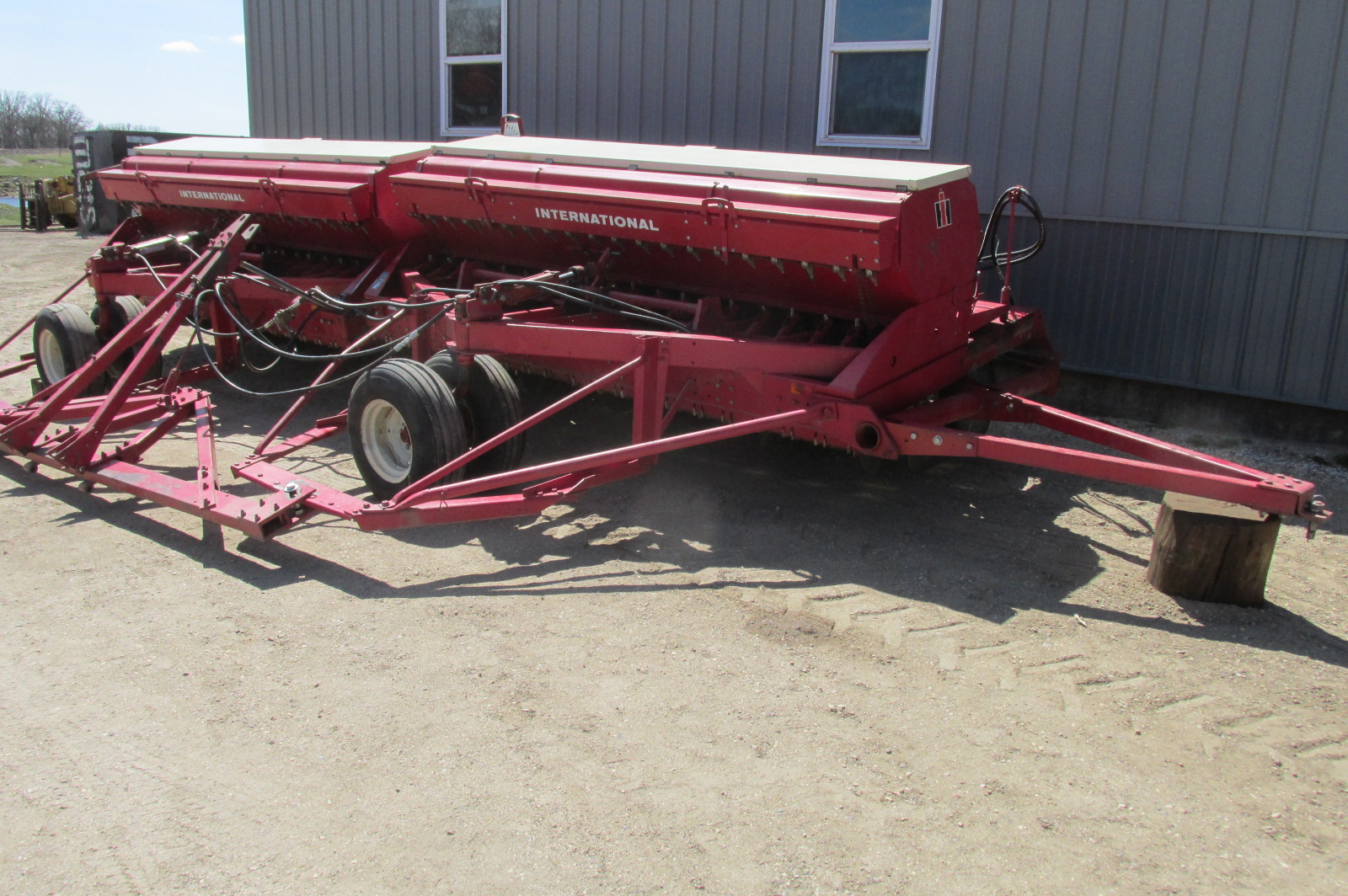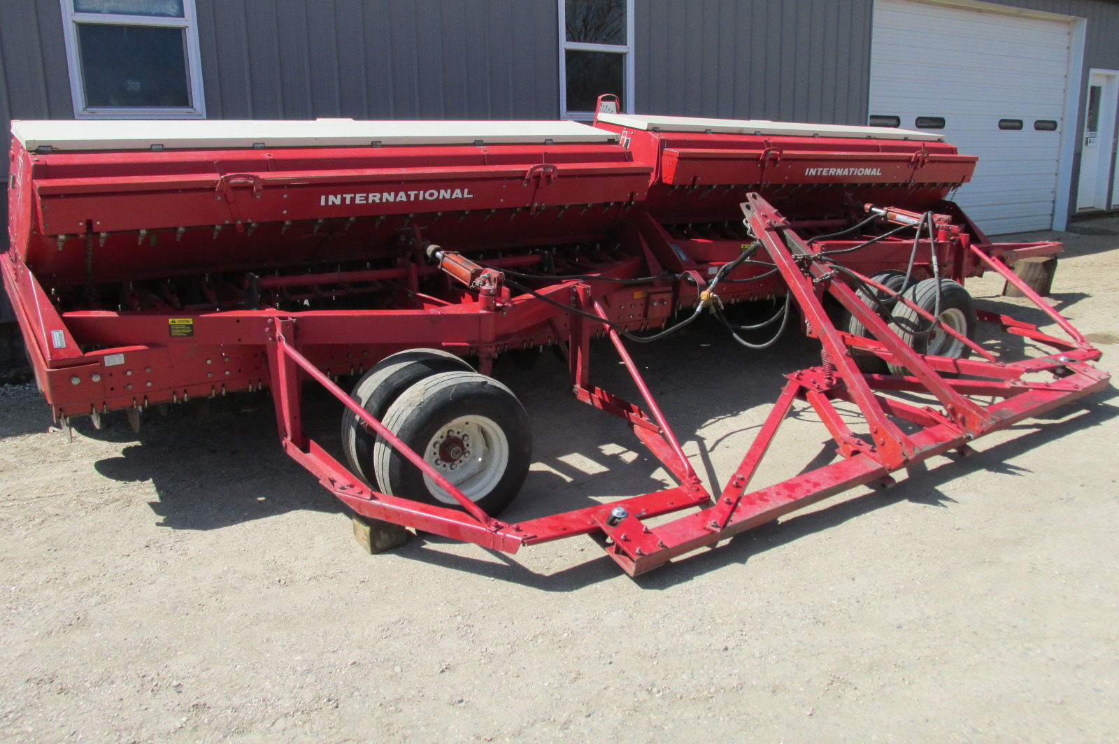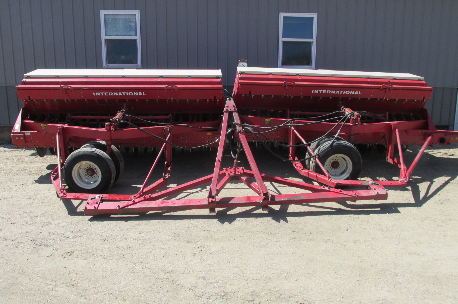 International model 620 20 foot (2-10fts) with rubber press wheels, six inch spacing, grass seeder attachment and end pull drill transport.