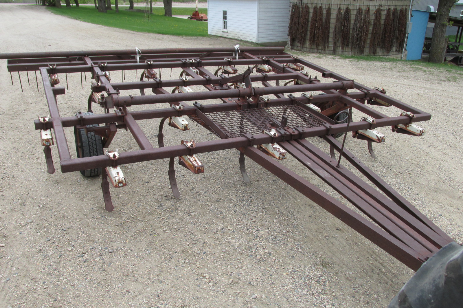 12.5 foot field cultivator with Vibrashank tines and 4 bar spacing. Includes mounted mulcher harrow.
