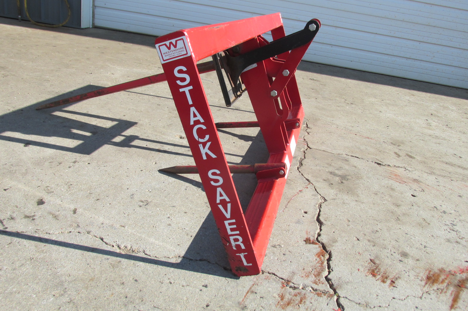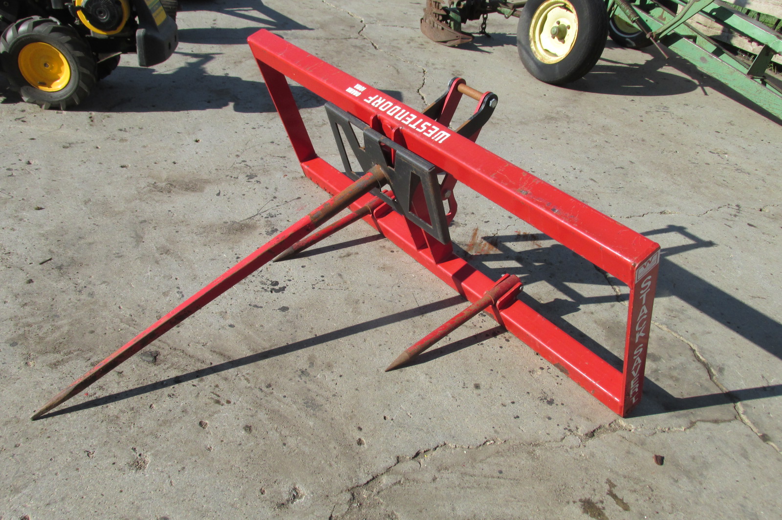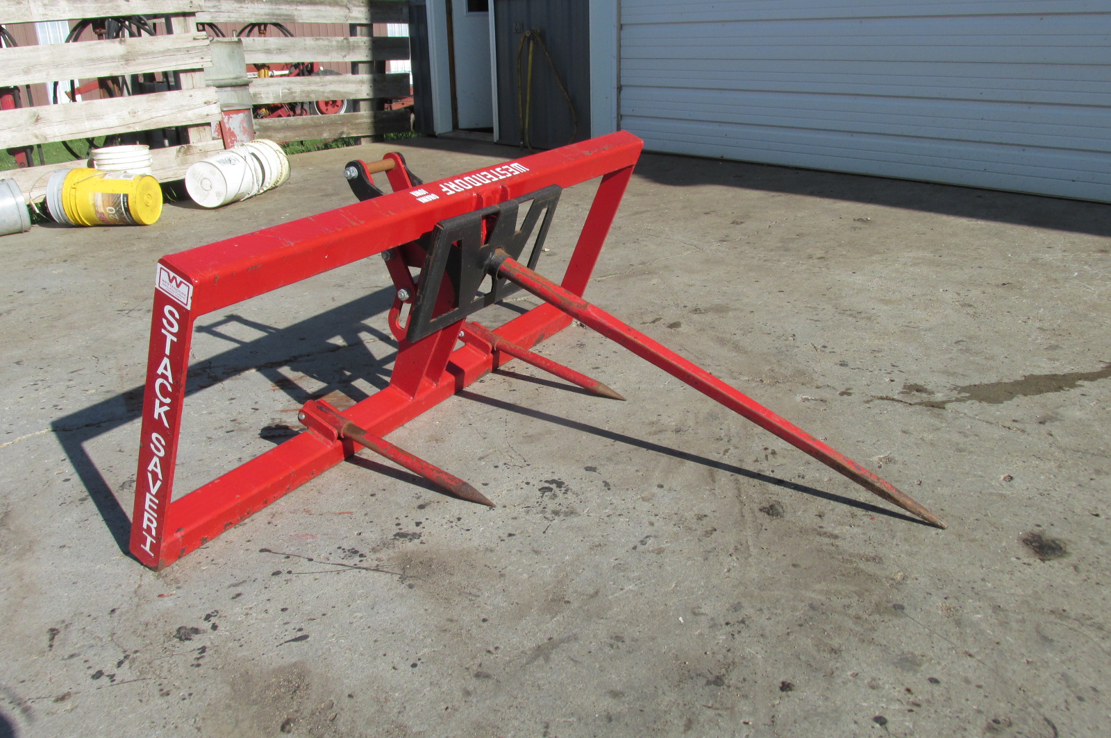 Near new Westendorf StackSaver 1 Bale spear for a loader or skidsteer depending on mounting brackets. Push plate on the Stack Saver 1 holds the bale stationary to push the bale off quickly and easily with out added hydraulics.