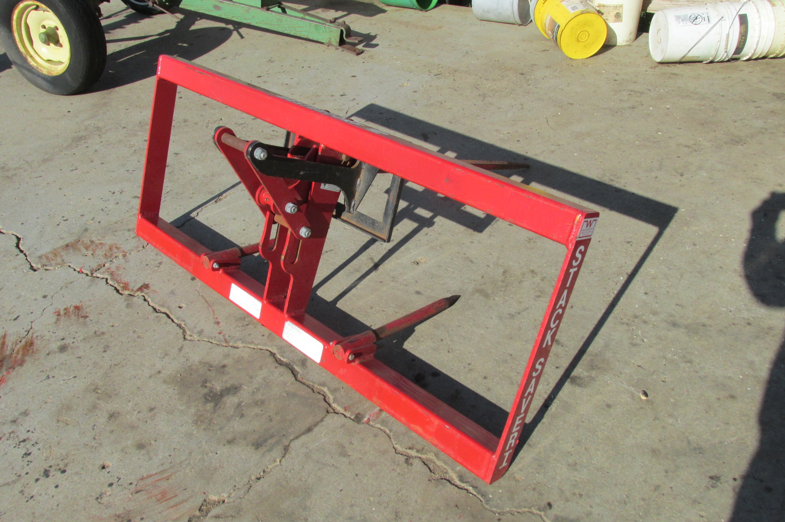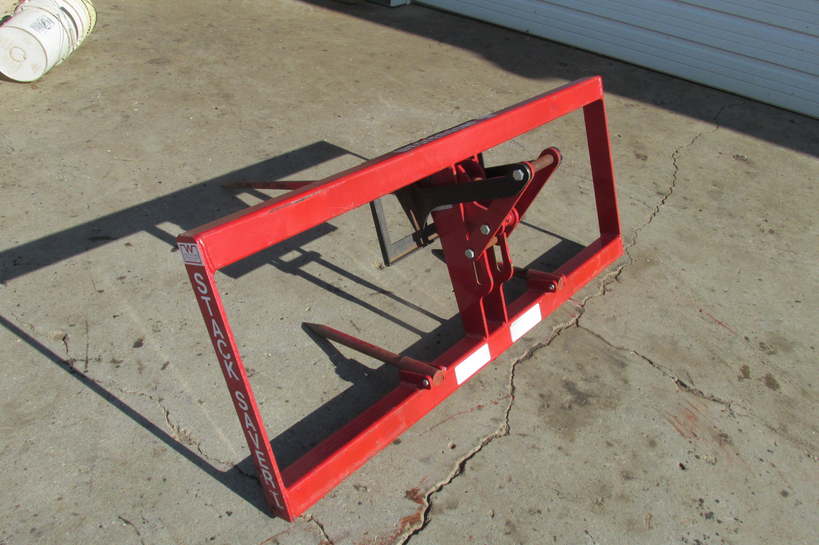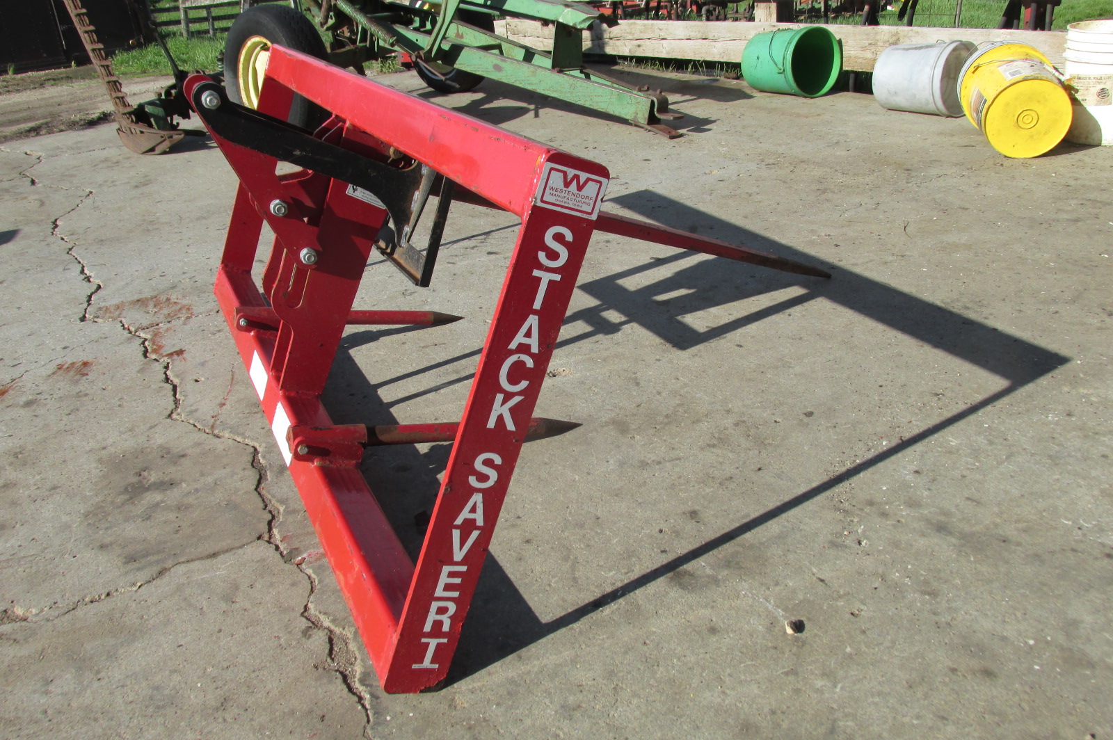 Near new Westendorf StackSaver 1 Bale spear for a loader or skidsteer depending on mounting brackets. Push plate on the Stack Saver 1 holds the bale stationary to push the bale off quickly and easily with out added hydraulics.