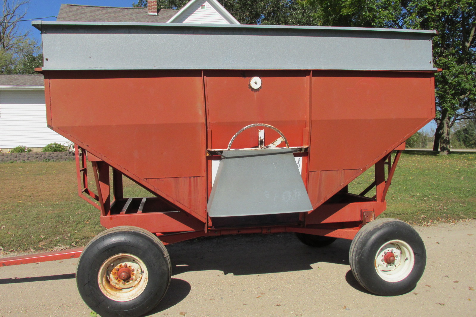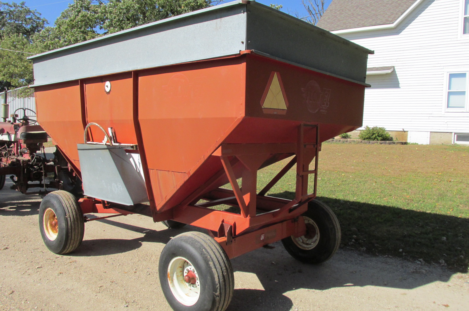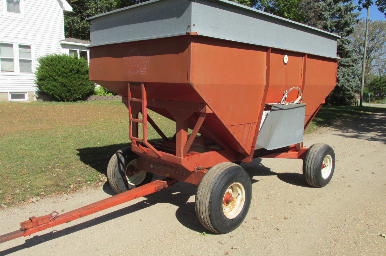 EZ Flow model 300 gravity box with extensions. Attached to a EZ Trail model 1072 10 ton wagon with 12.5Lx15 flotation tires.