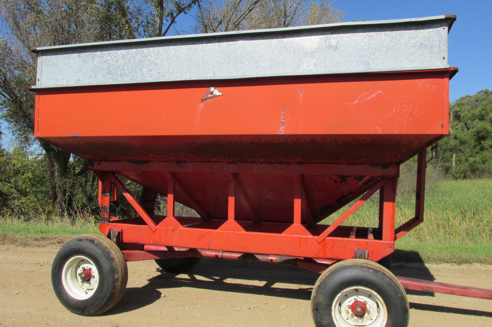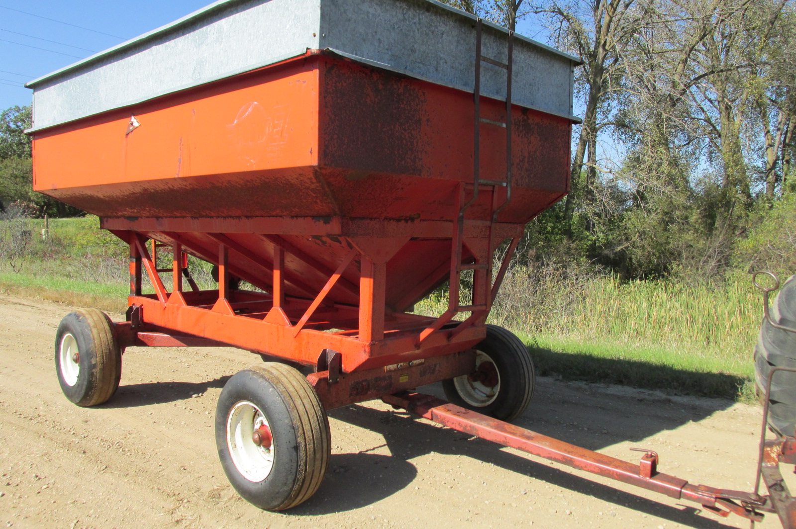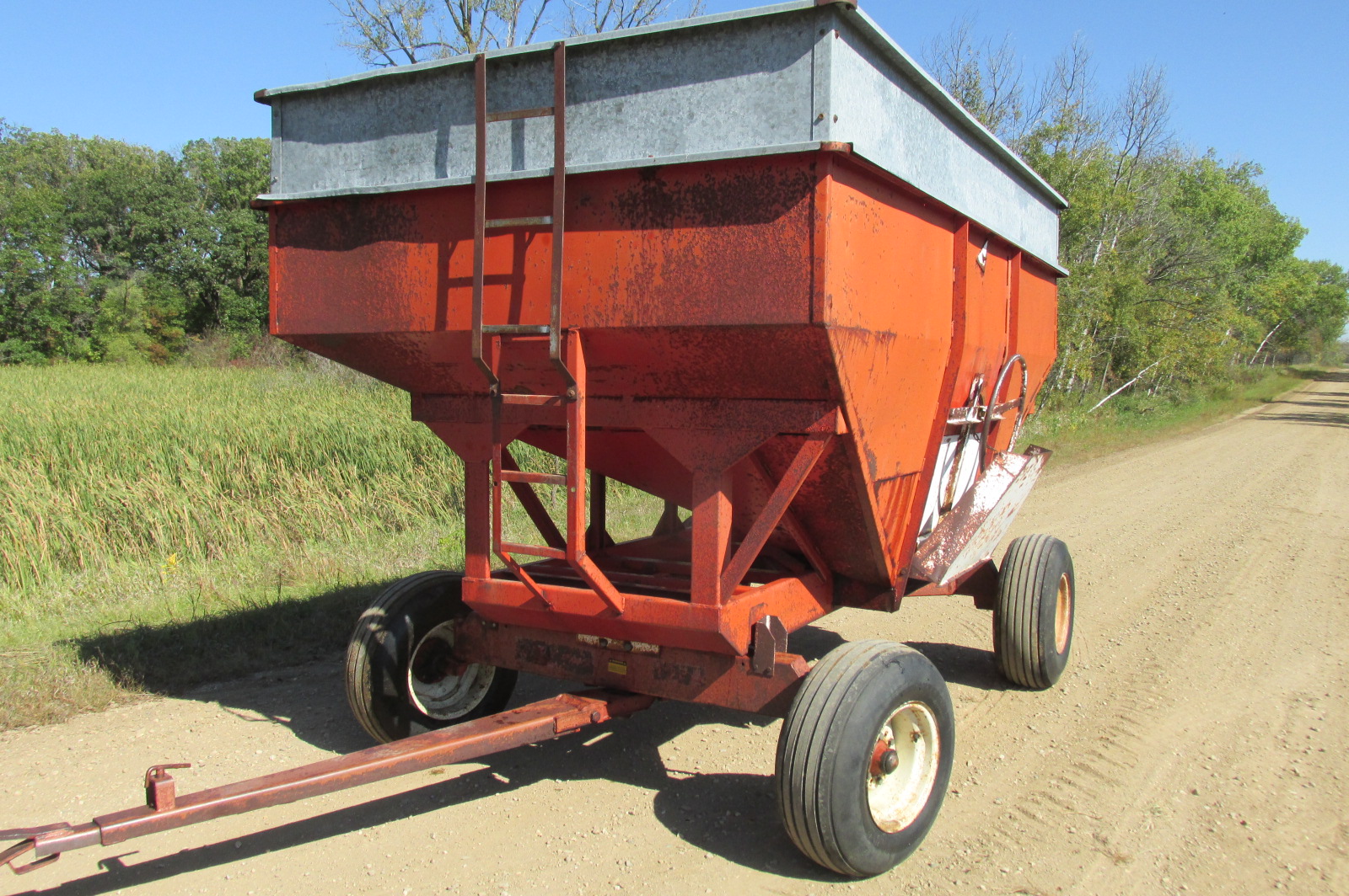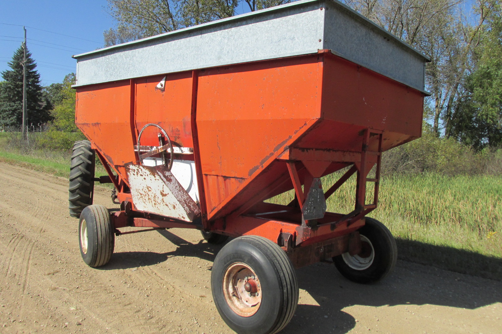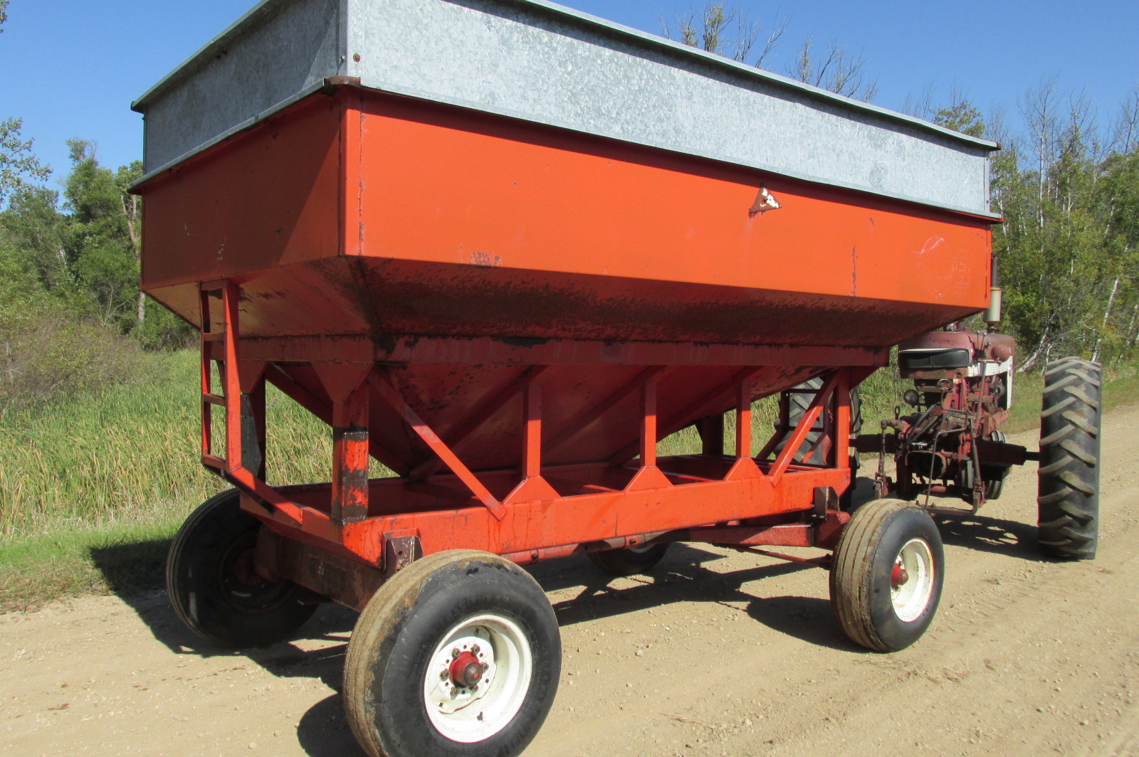 EZ Flow model 300 gravity box with extensions. Attached to a EZ Trail model 1072 10 ton wagon with flotation tires.