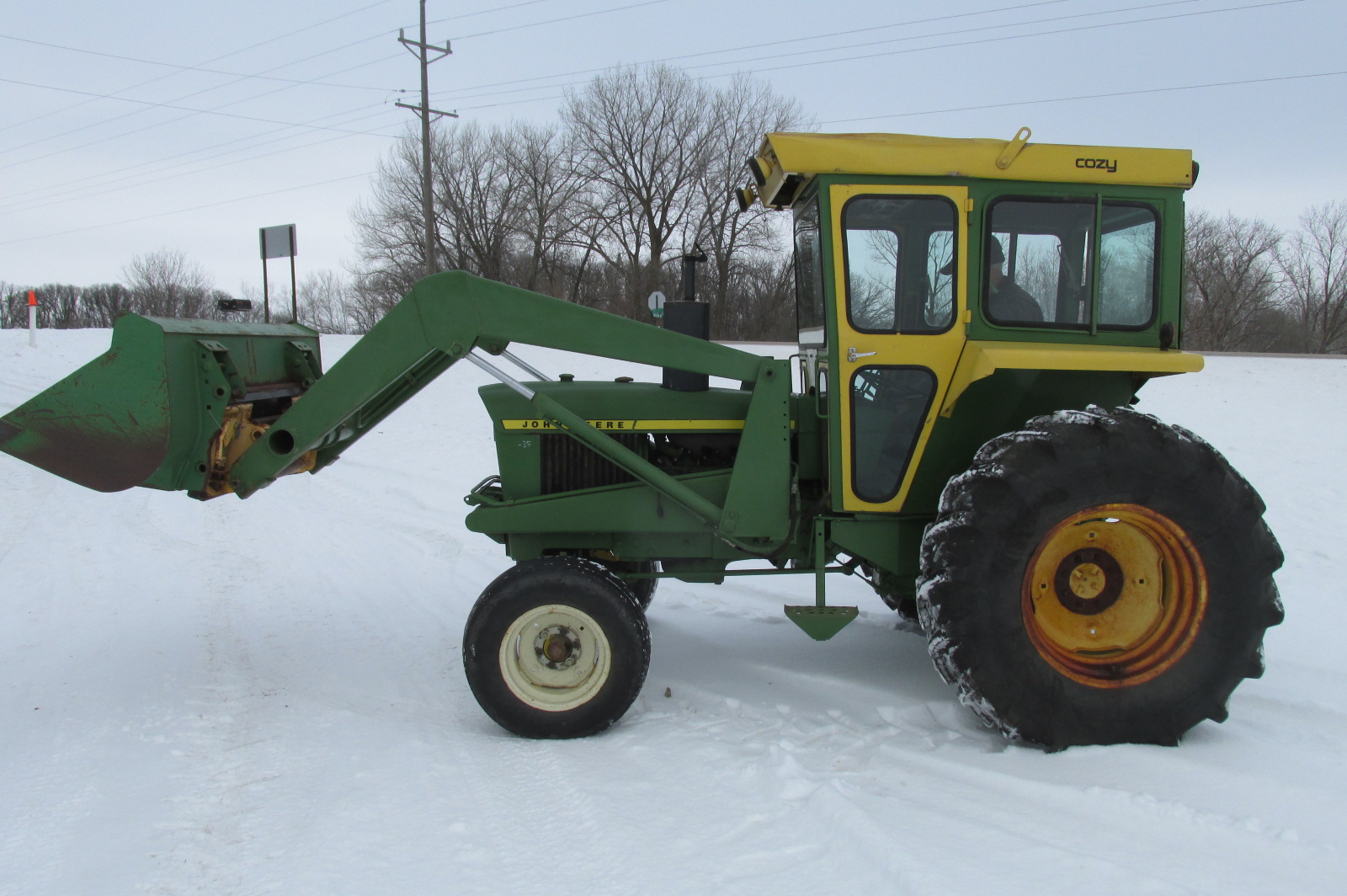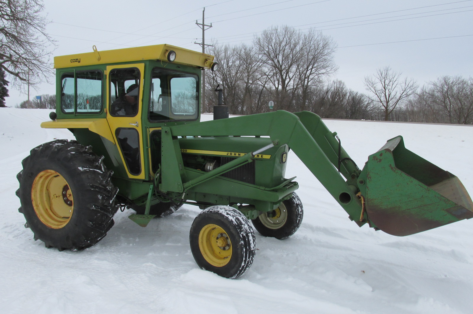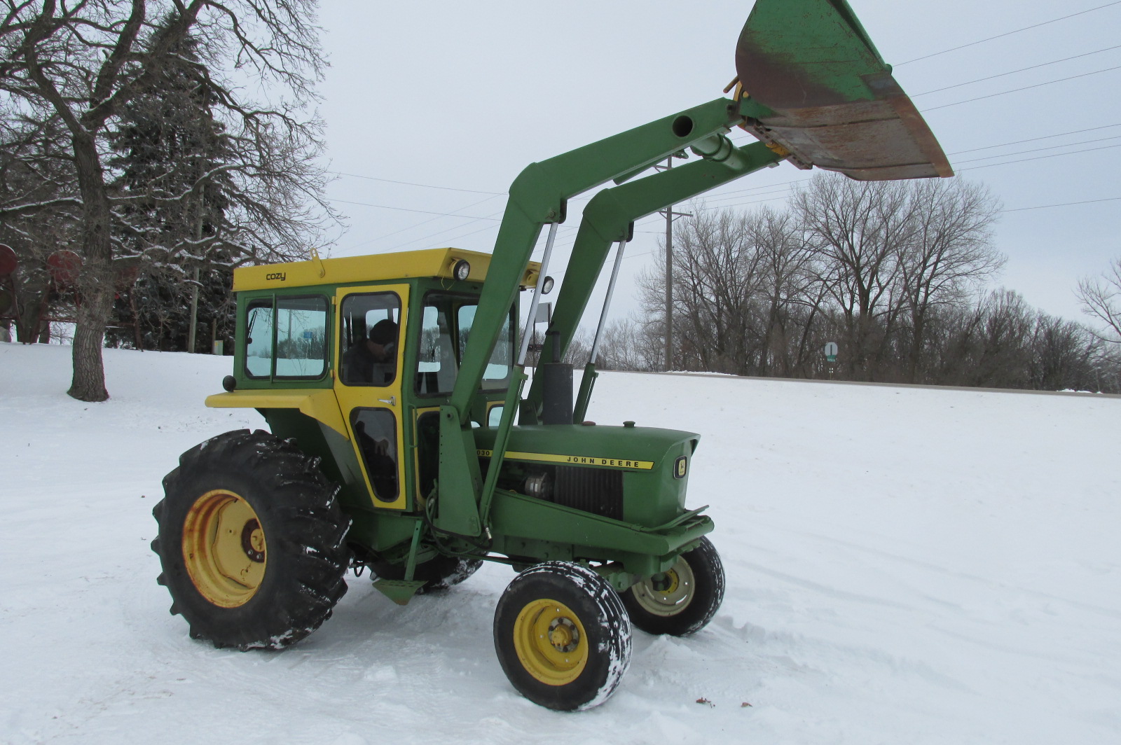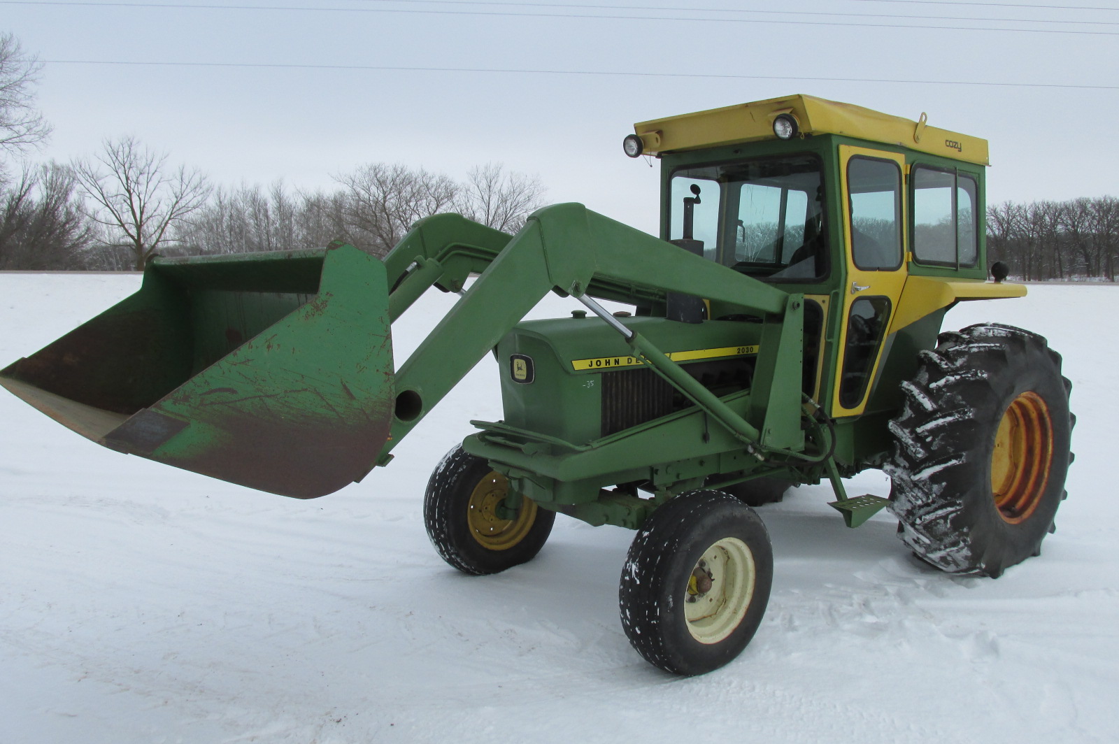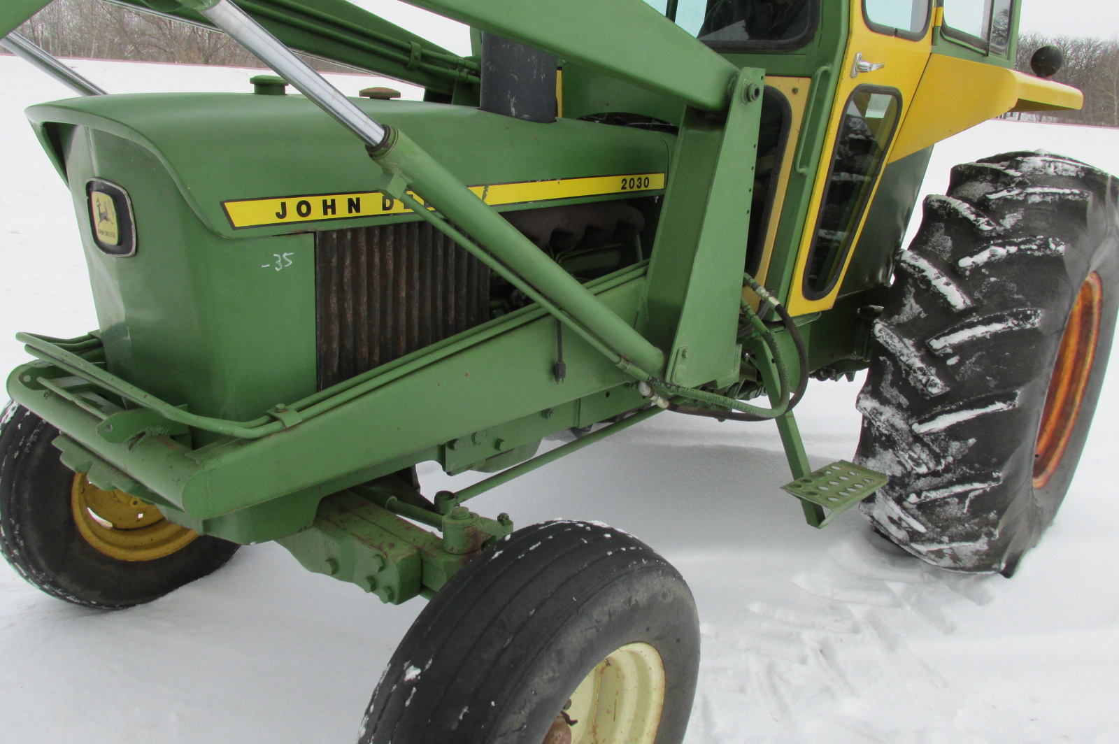 John Deere model 2030 diesel tractor with 3 point hitch, Cozy Cab and John Deere 146 hydraulic bucket loader with quick tach bucket.
