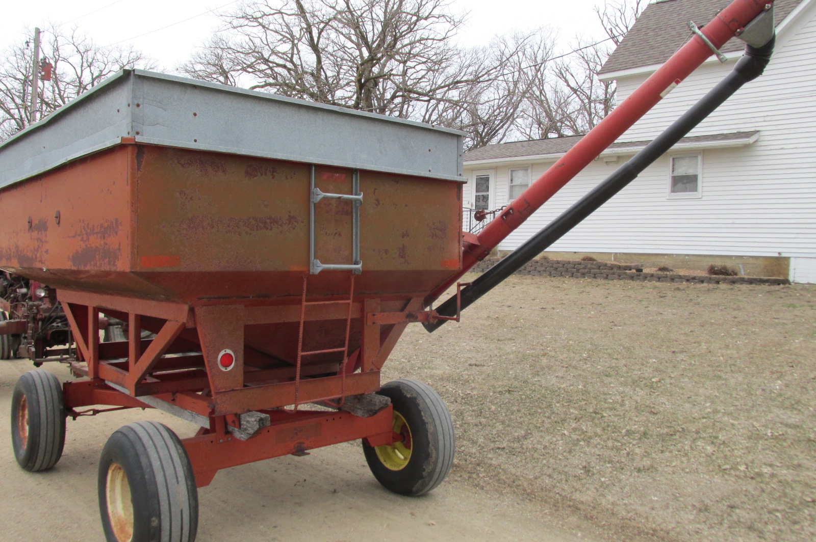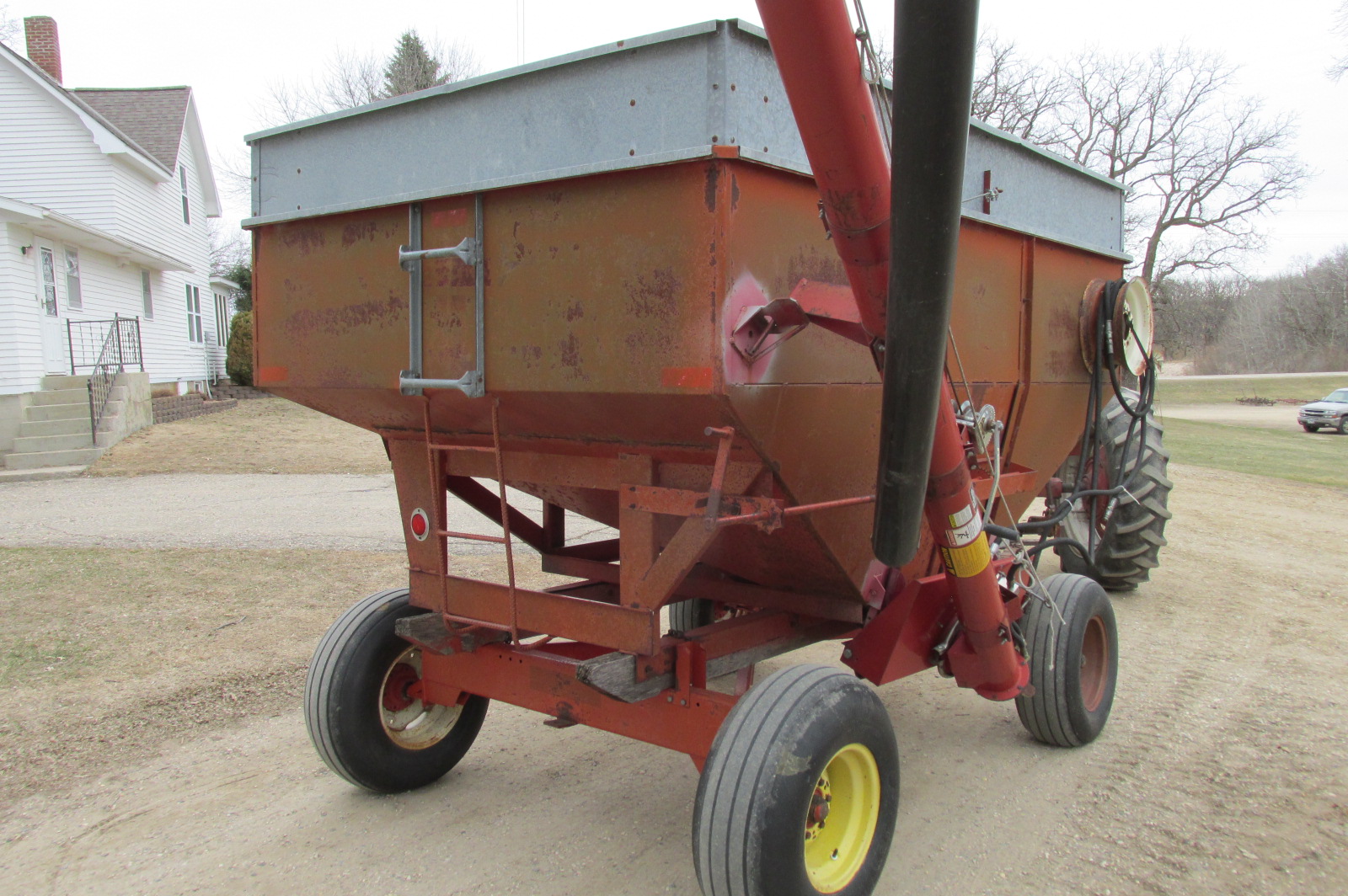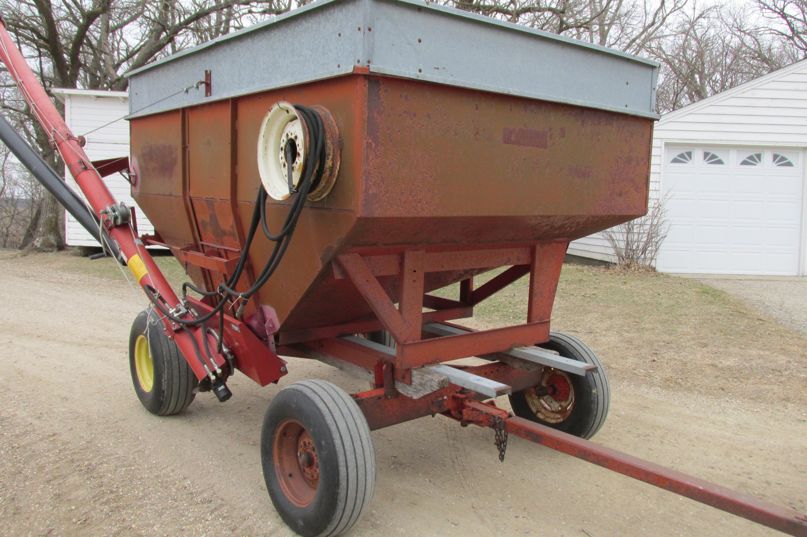 Nubilt Gravity box with 14 foot Sudenga hydraulic brush auger.Box has metal extensions.Wagon has flotation tires.