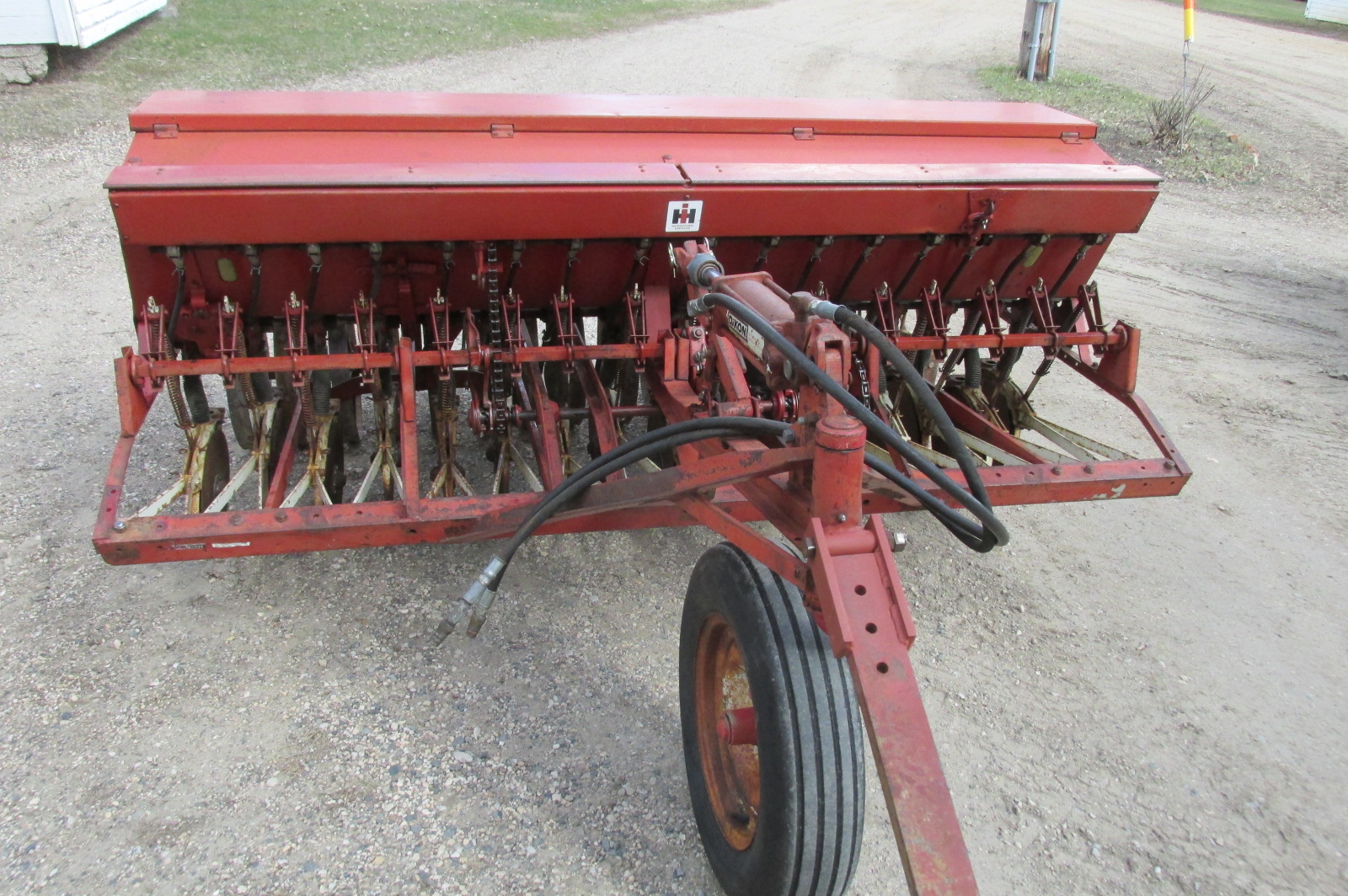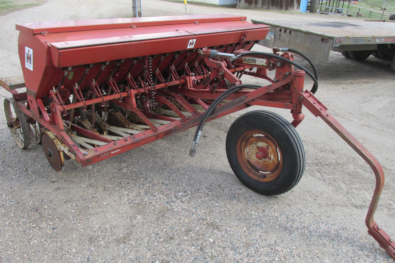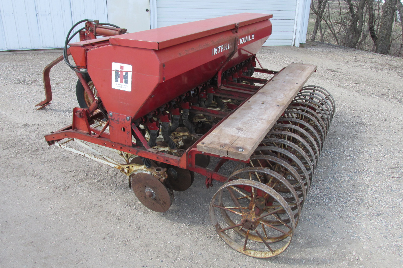 International model 100 8 foot (6"spacing) press grain drill with grass seeder attachment.Good blades, bearings, rock kickers and seed tubes.All rate adjustments move freely.Greased and field ready.Comes complete with hydraulic lift cylinder.Plants small grains, beans , alfalfa, clover and other small grass seeds.Great little drill for small acreage or wildlife plots.