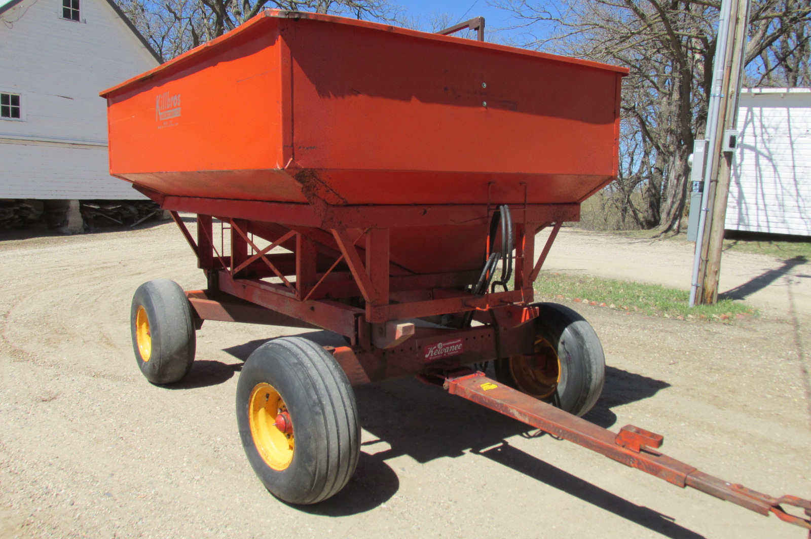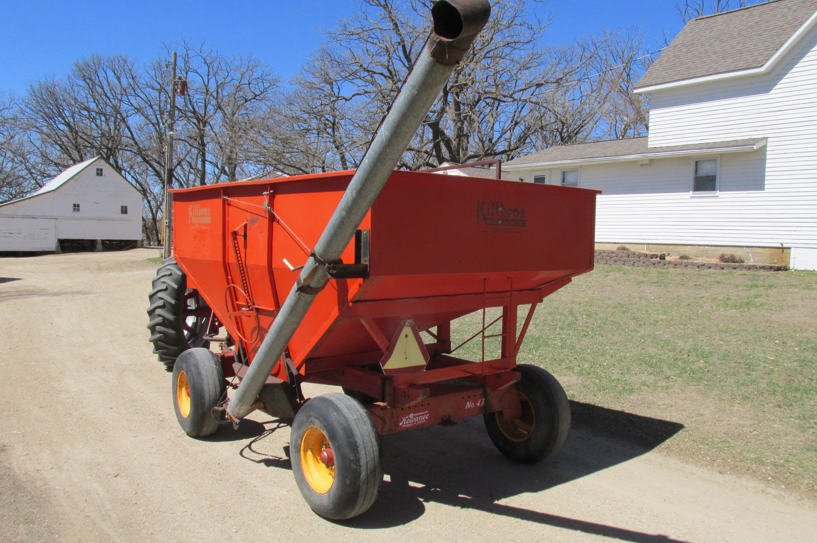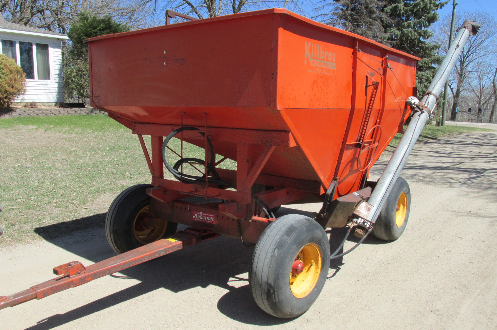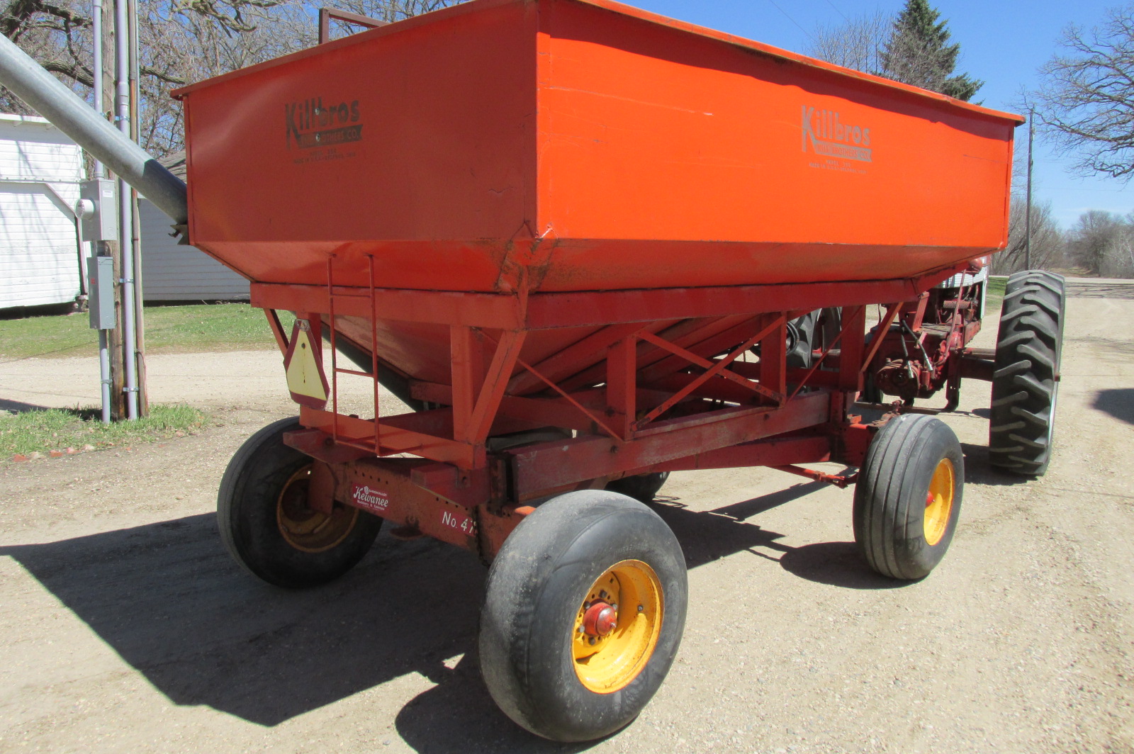 Killbros gravity box with 11ft Ficklin steel flighting hydraulic drill fill auger. Kewanee model 47 wagon with 12.5x15 flotation tires and extension hitch.