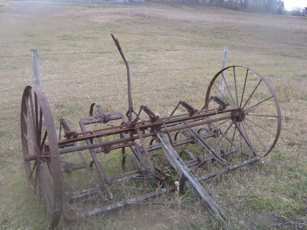 Very old horse drawn field cultivator on steel wheels with hand lift.