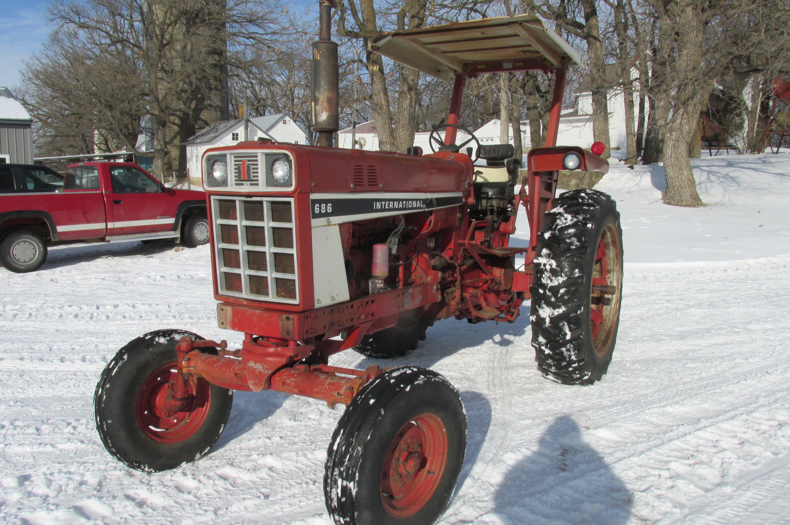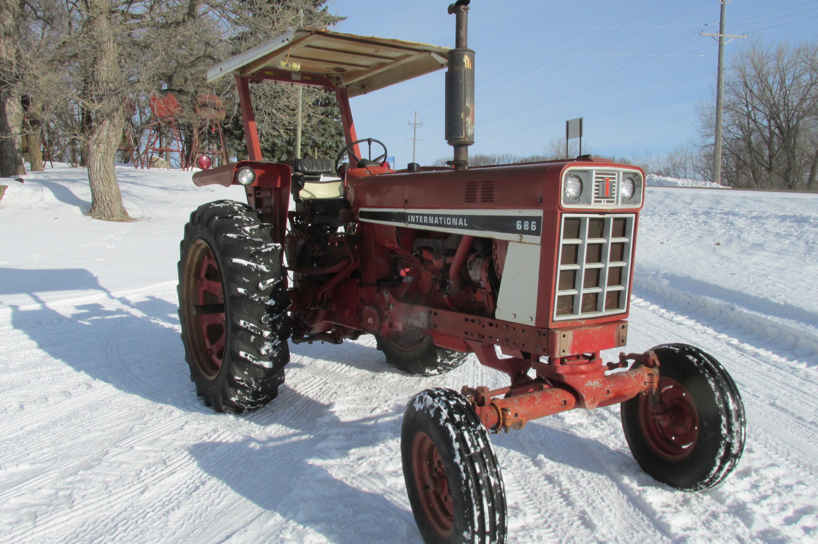 International model 686 gas tractor with 3 point hitch, dual hydraulics, wide front and factory roll bar.
