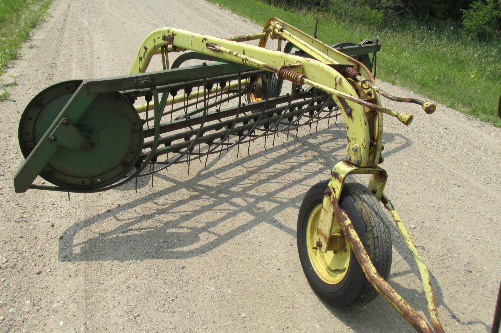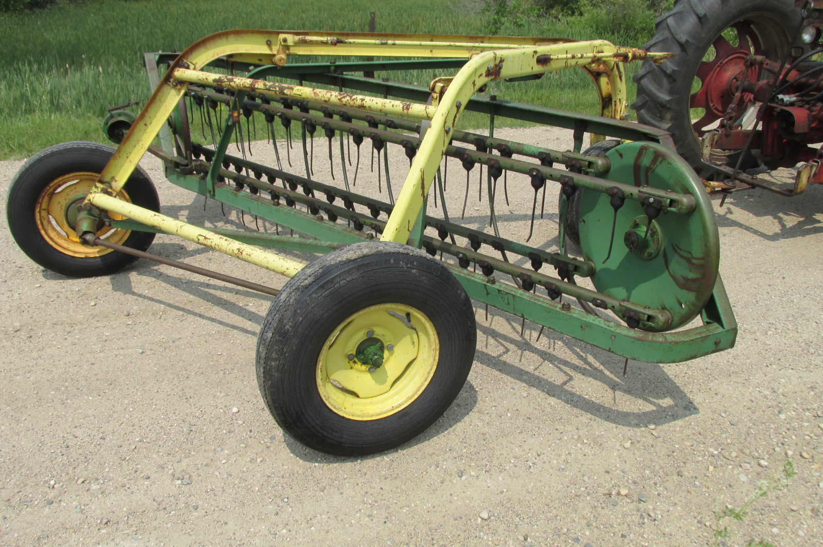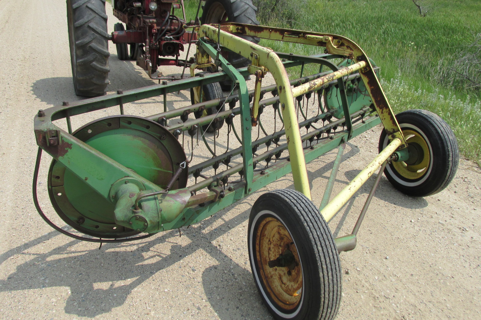 John Deere model 640 4 bar hay rake with front dolly wheel.
