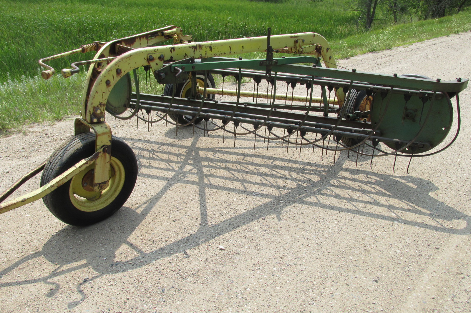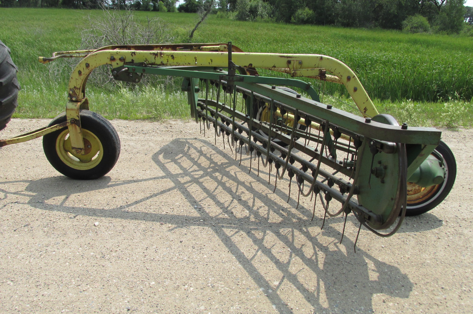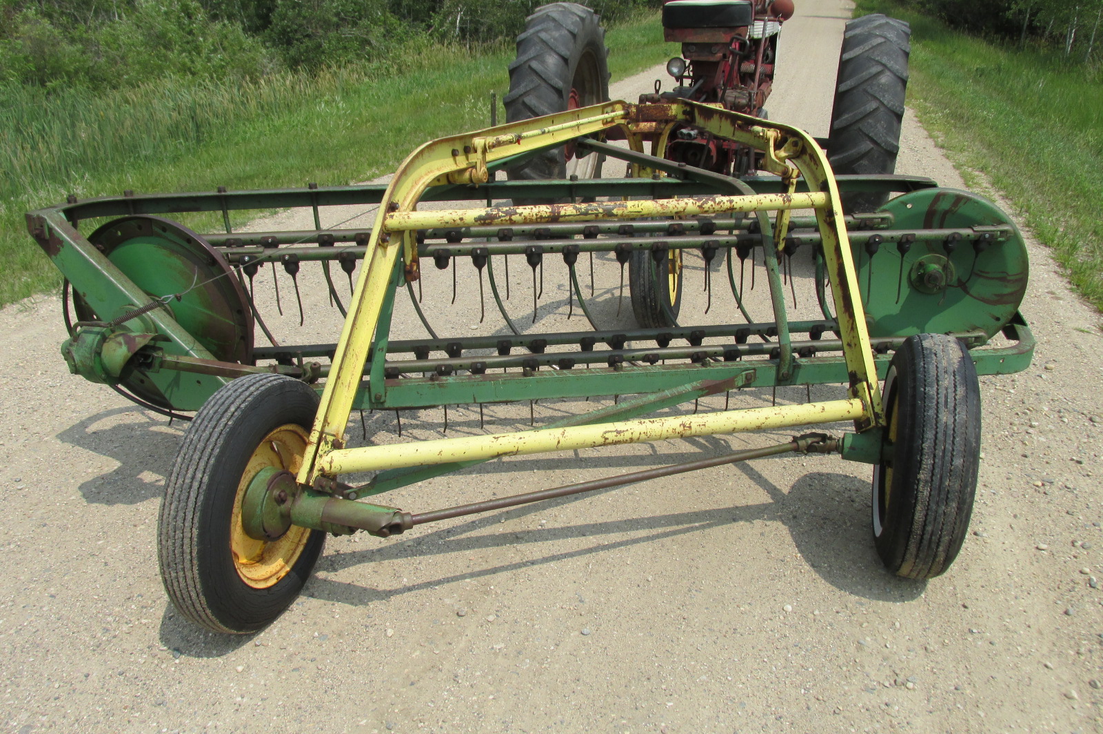 John Deere model 640 4 bar hay rake with front dolly wheel.