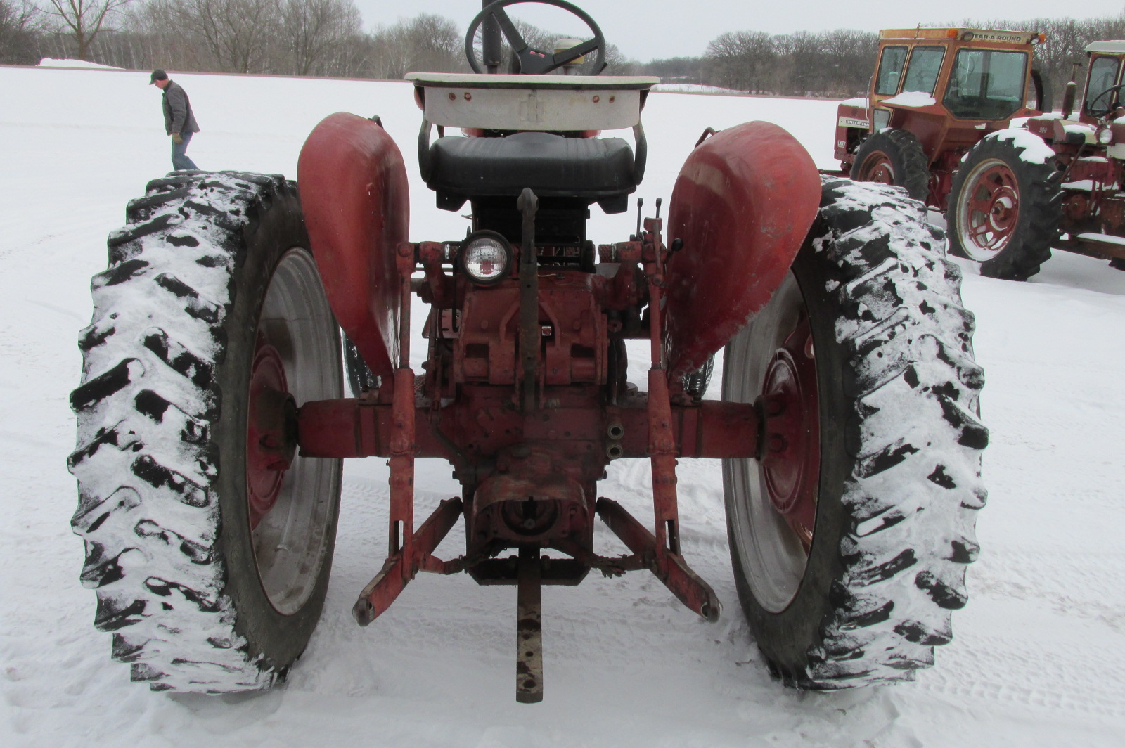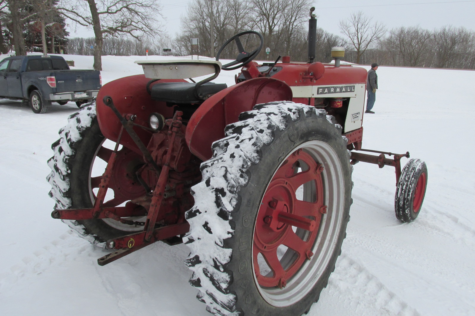 International 504 gas tractor with 3 point hitch, factory wide front and factory fenders.