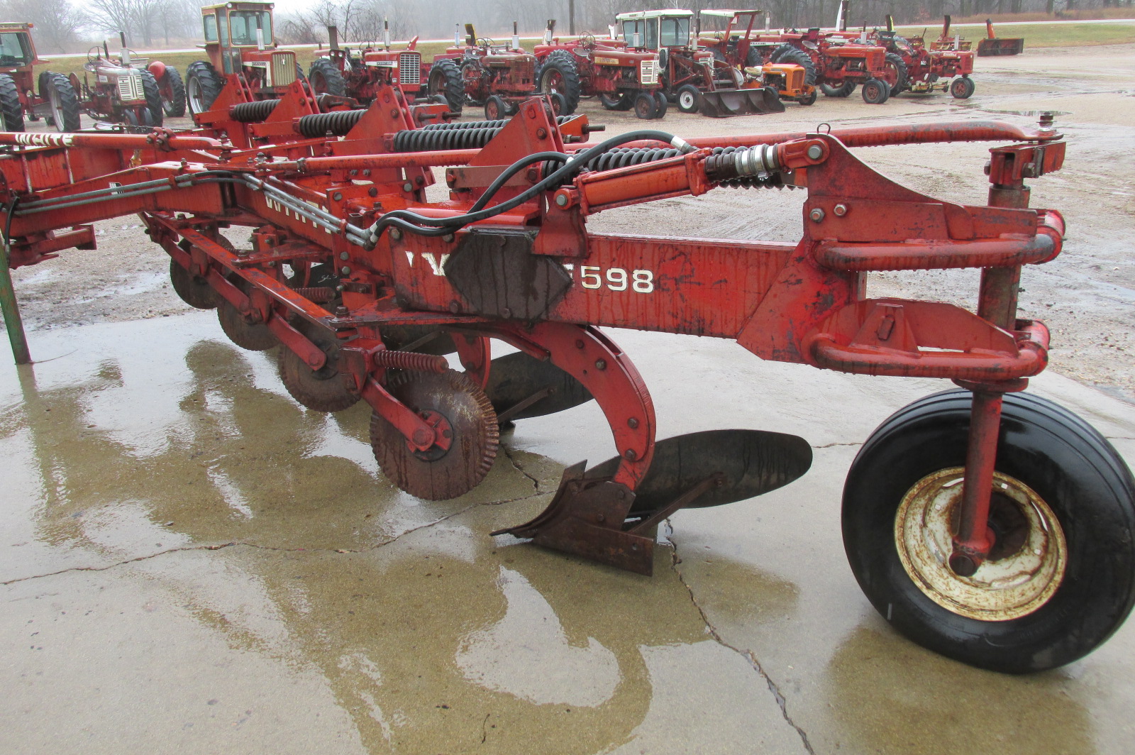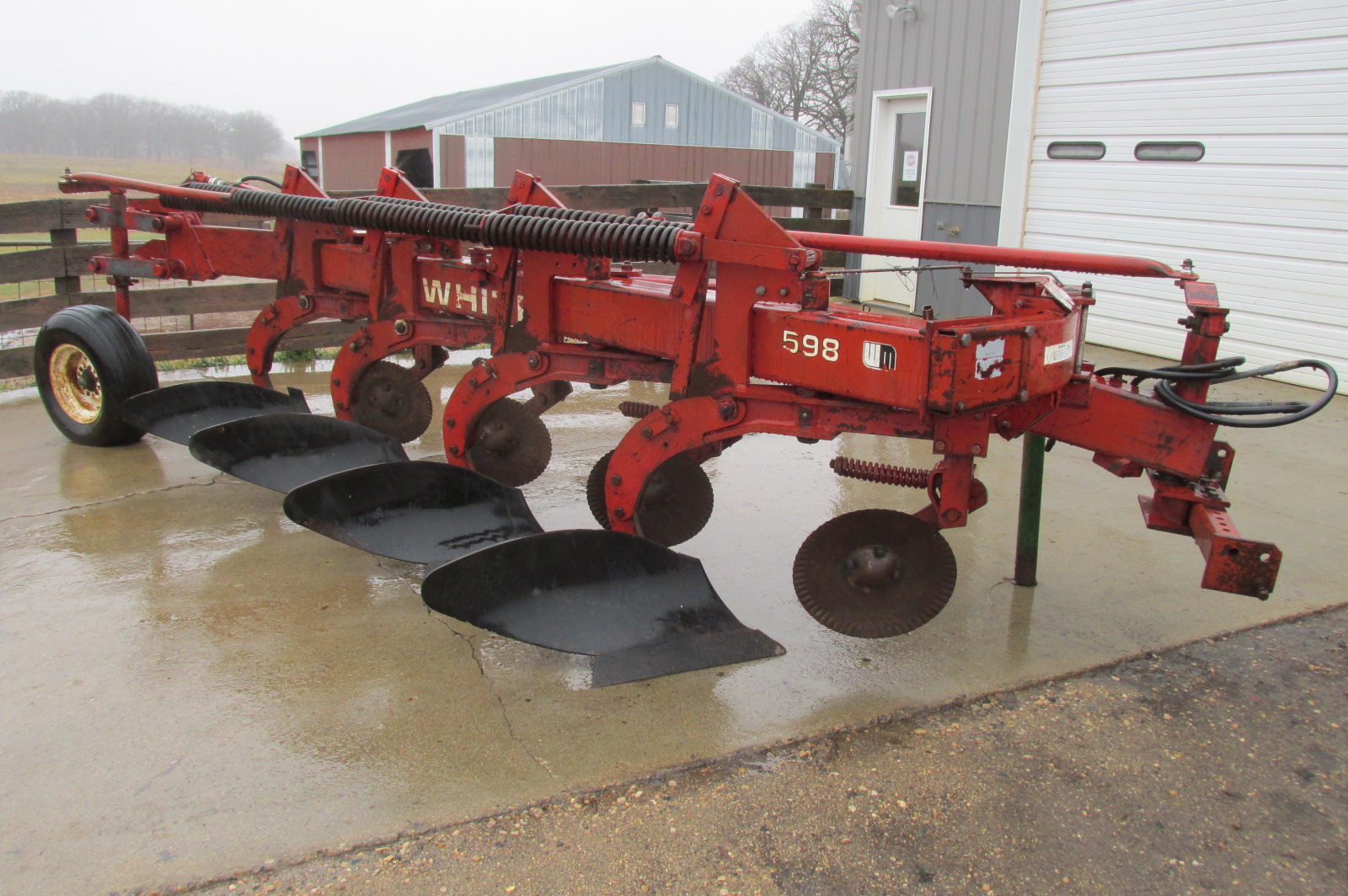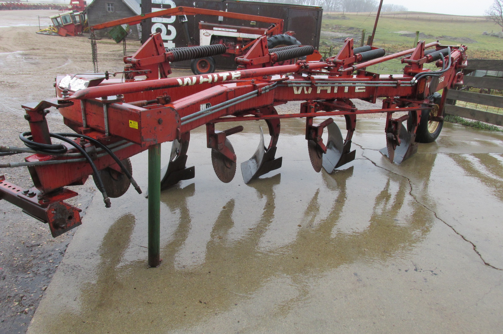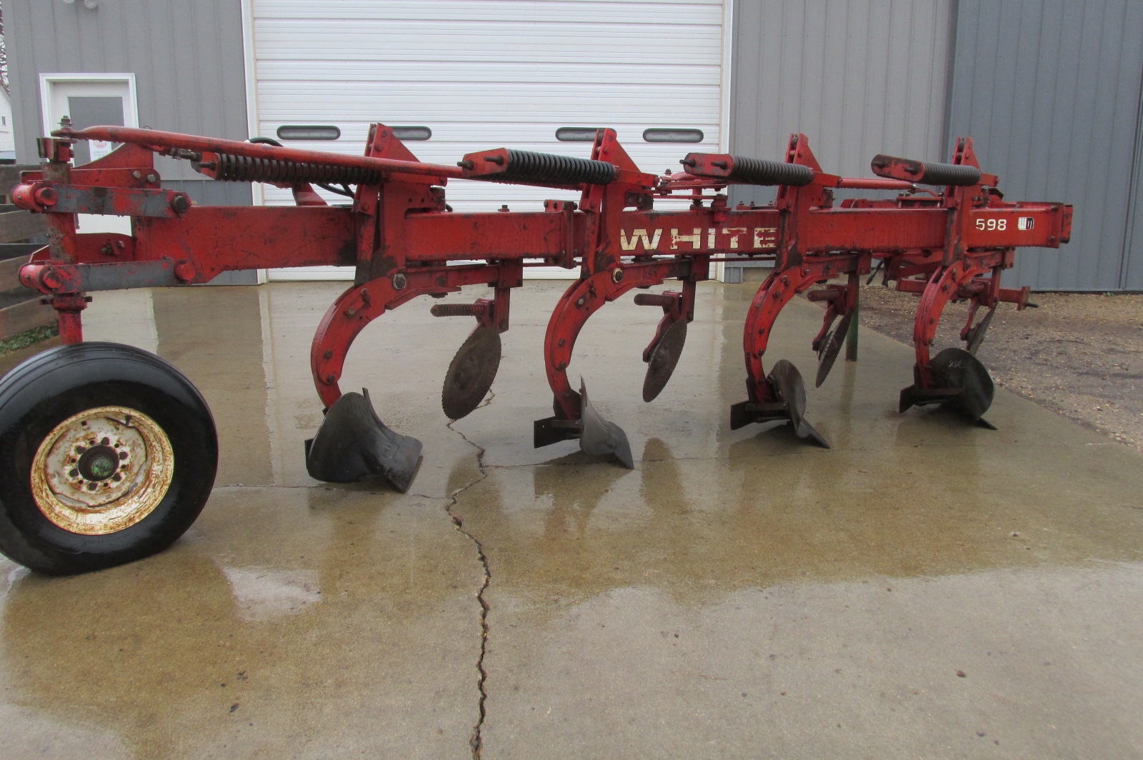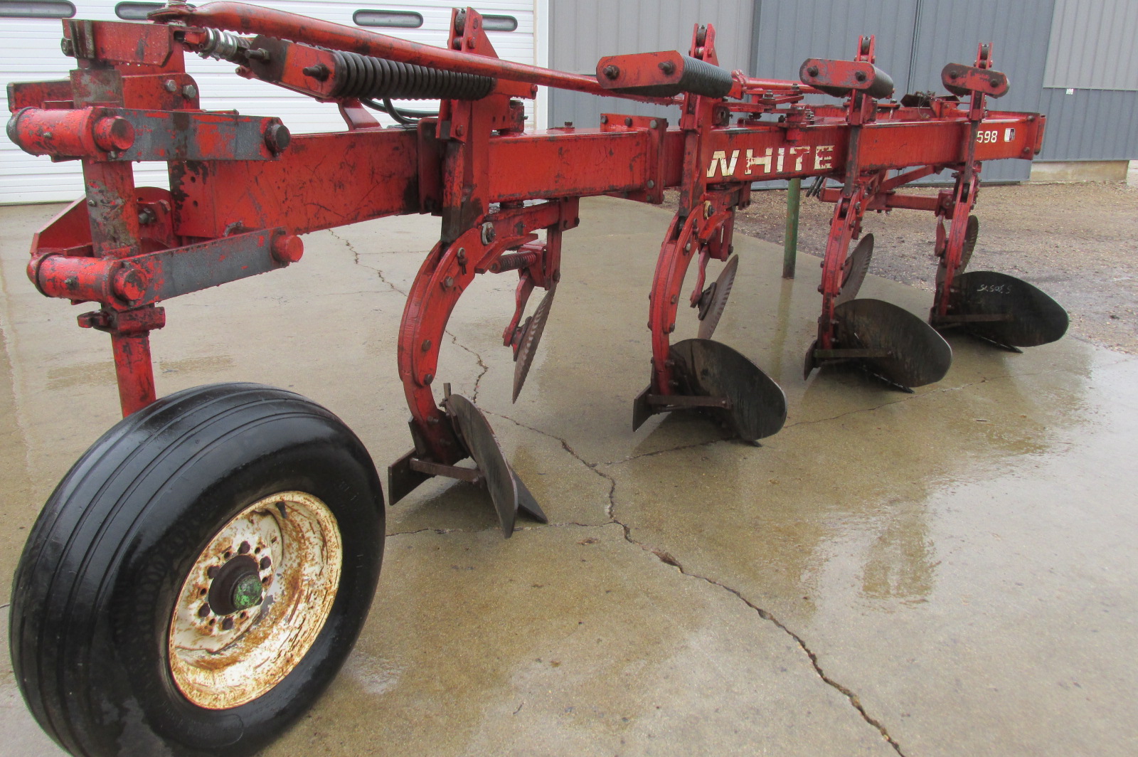 White model 598 4 bottom auto reset plow with coulters. Adjustable variable width from 14 to 22 inch. Perfect for plowing cornstalks. Good moldboards and wear parts.