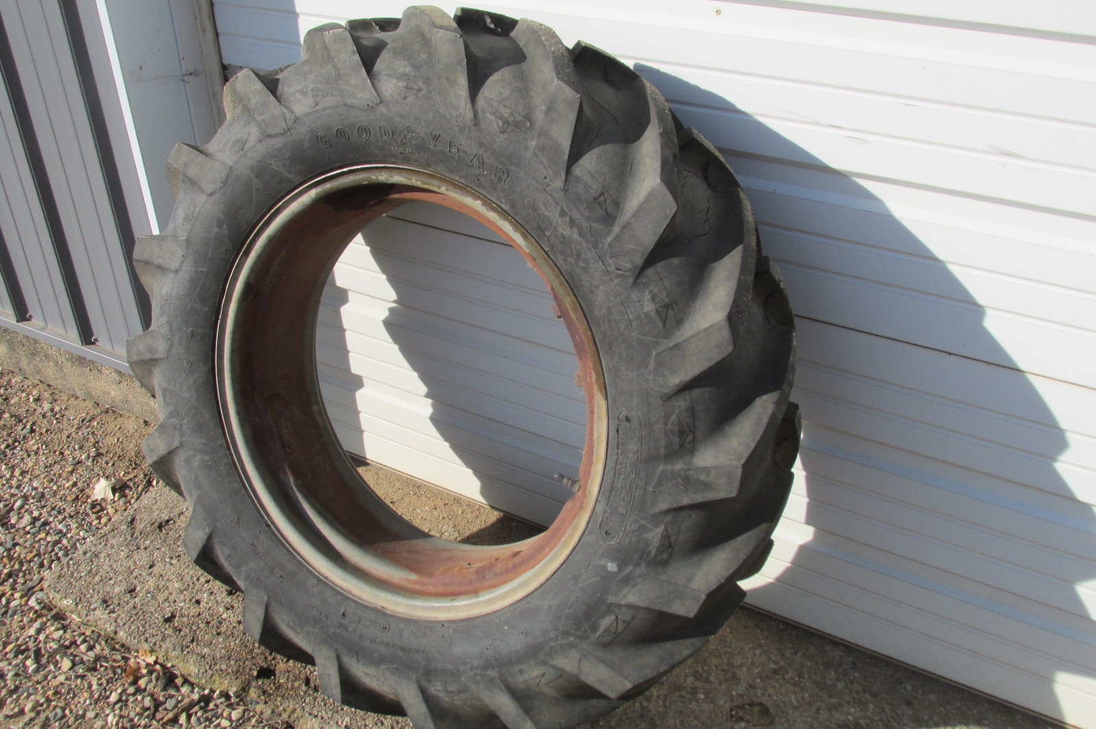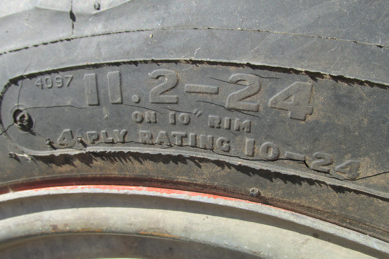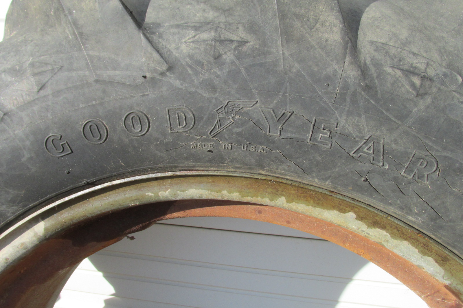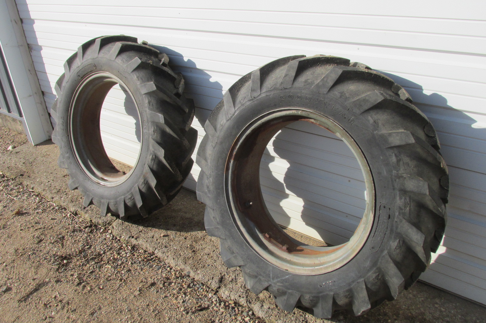Pair of Goodyear 11.2x24 (10x24) tires and rims from an Allis Chalmers C Tractor.