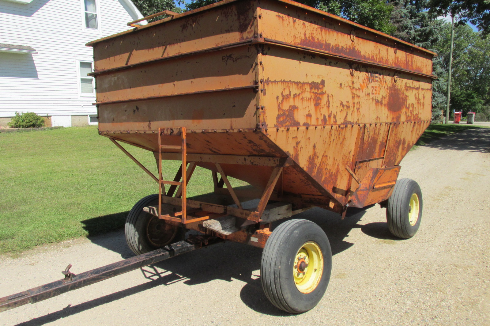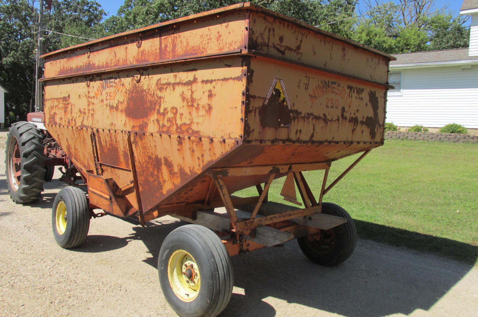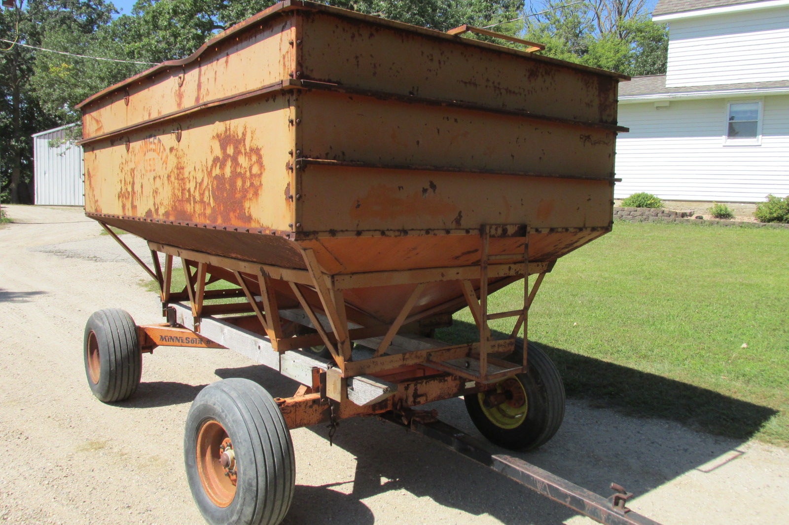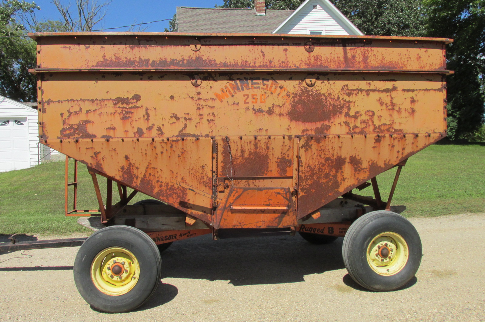 Minnesota model 250 gravity box and Minnesota 8 ton wagon with telescopic hitch and flotation tires.