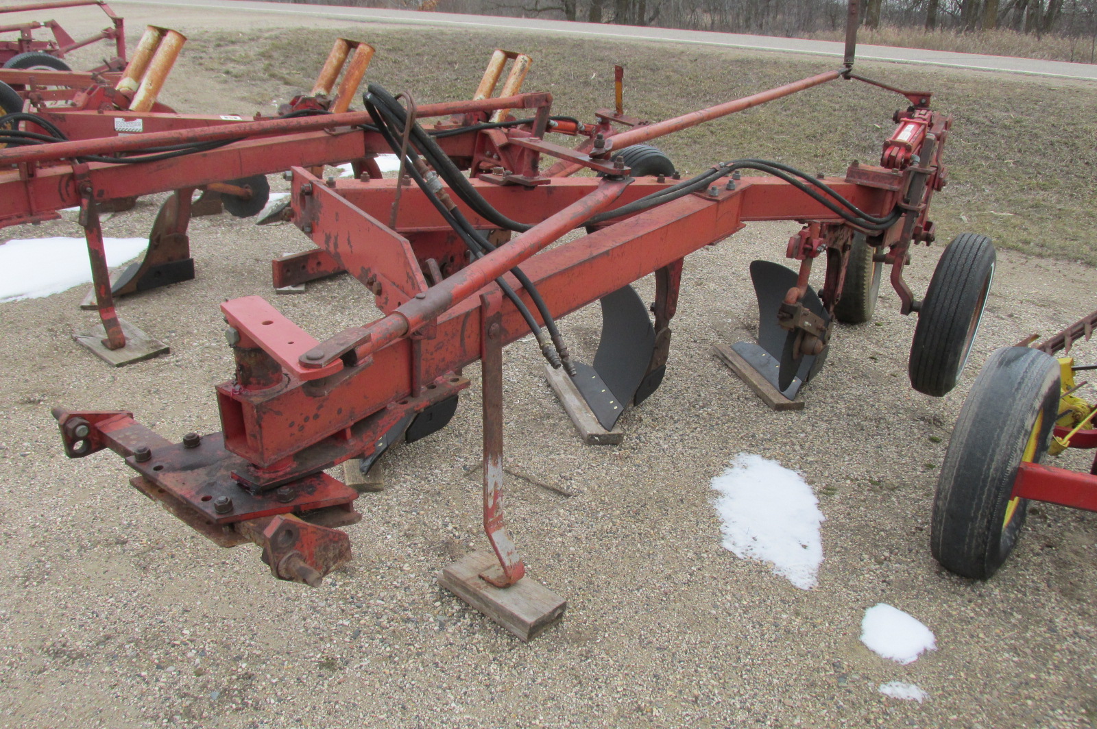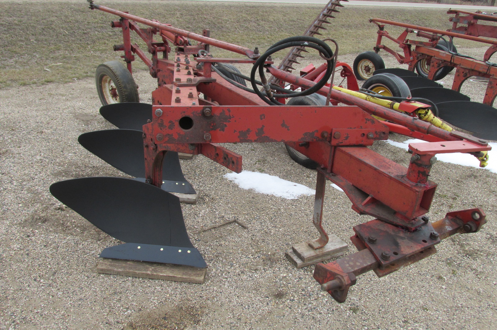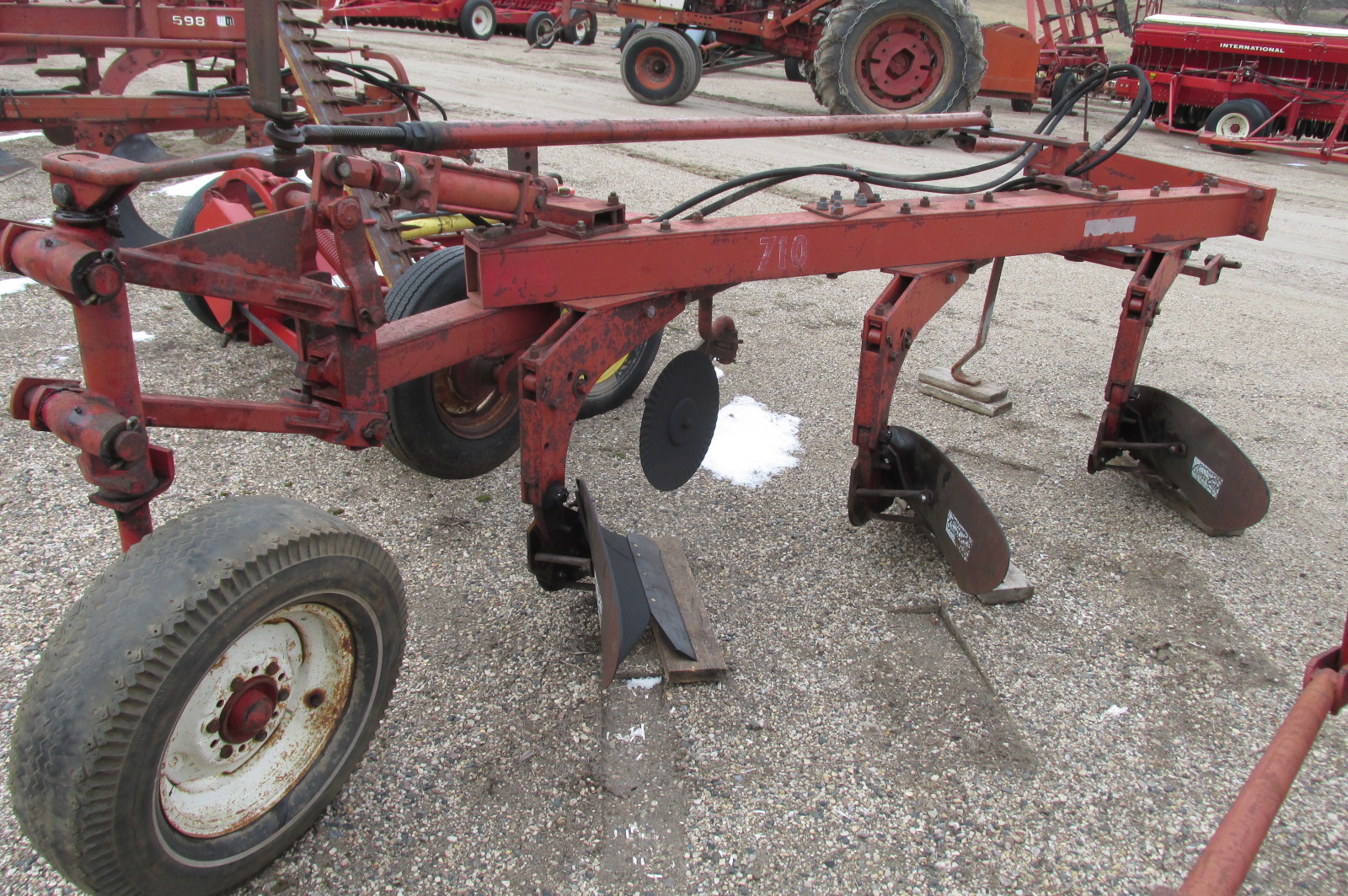 International model 710 3x18 trip bottom semi mounted plow with new shares. Greased and field ready. Hydraulic cylinder included.