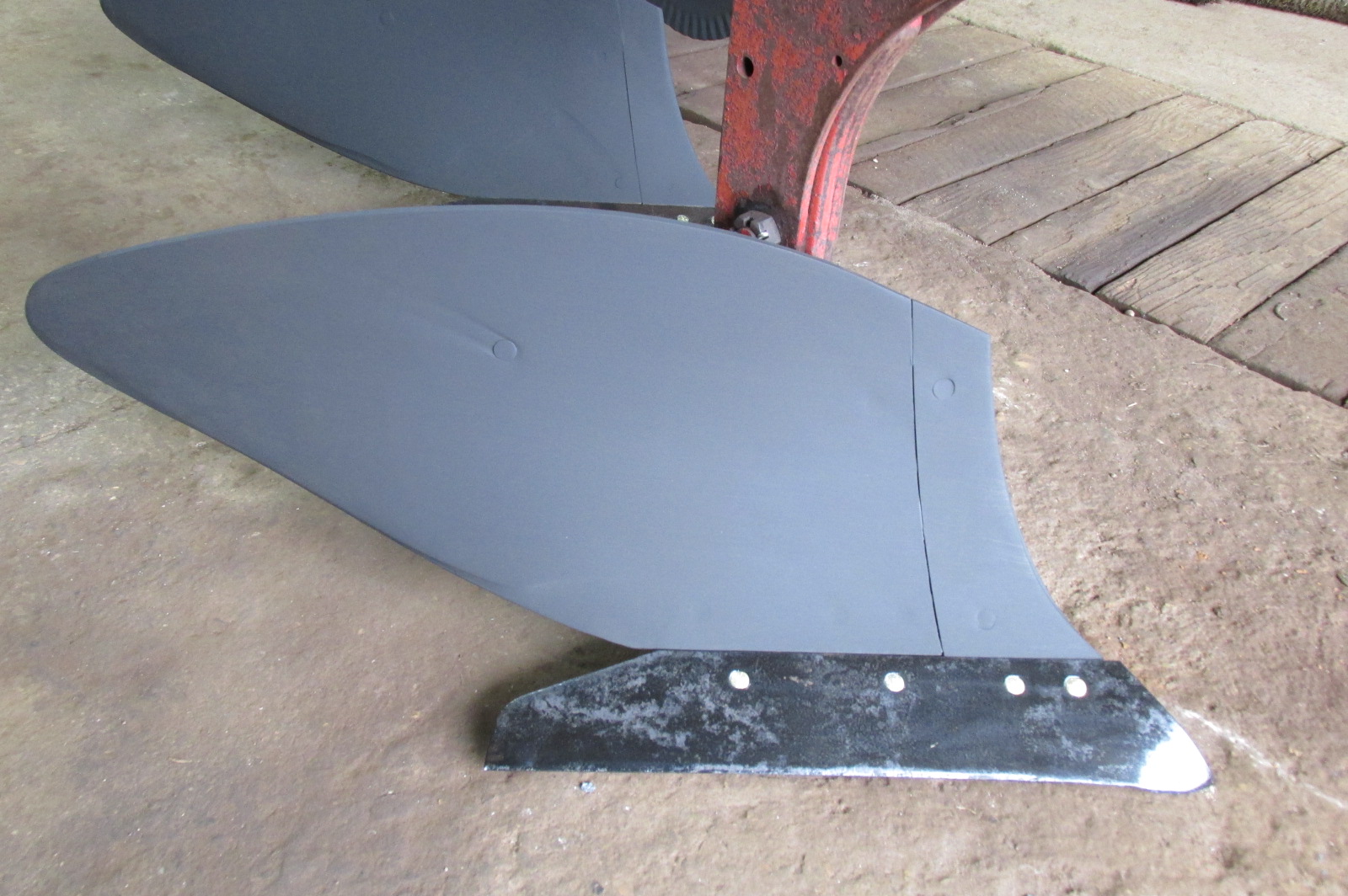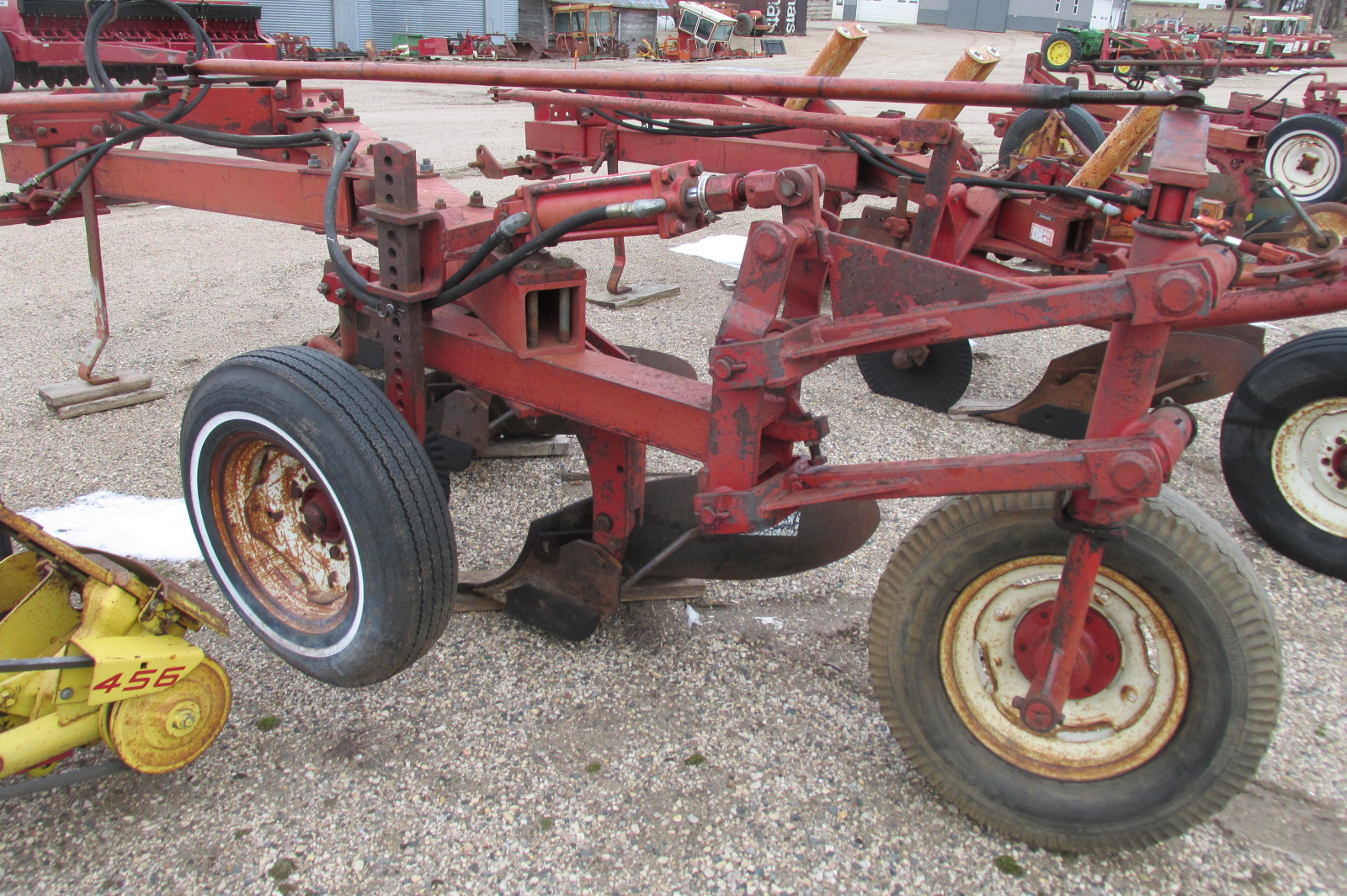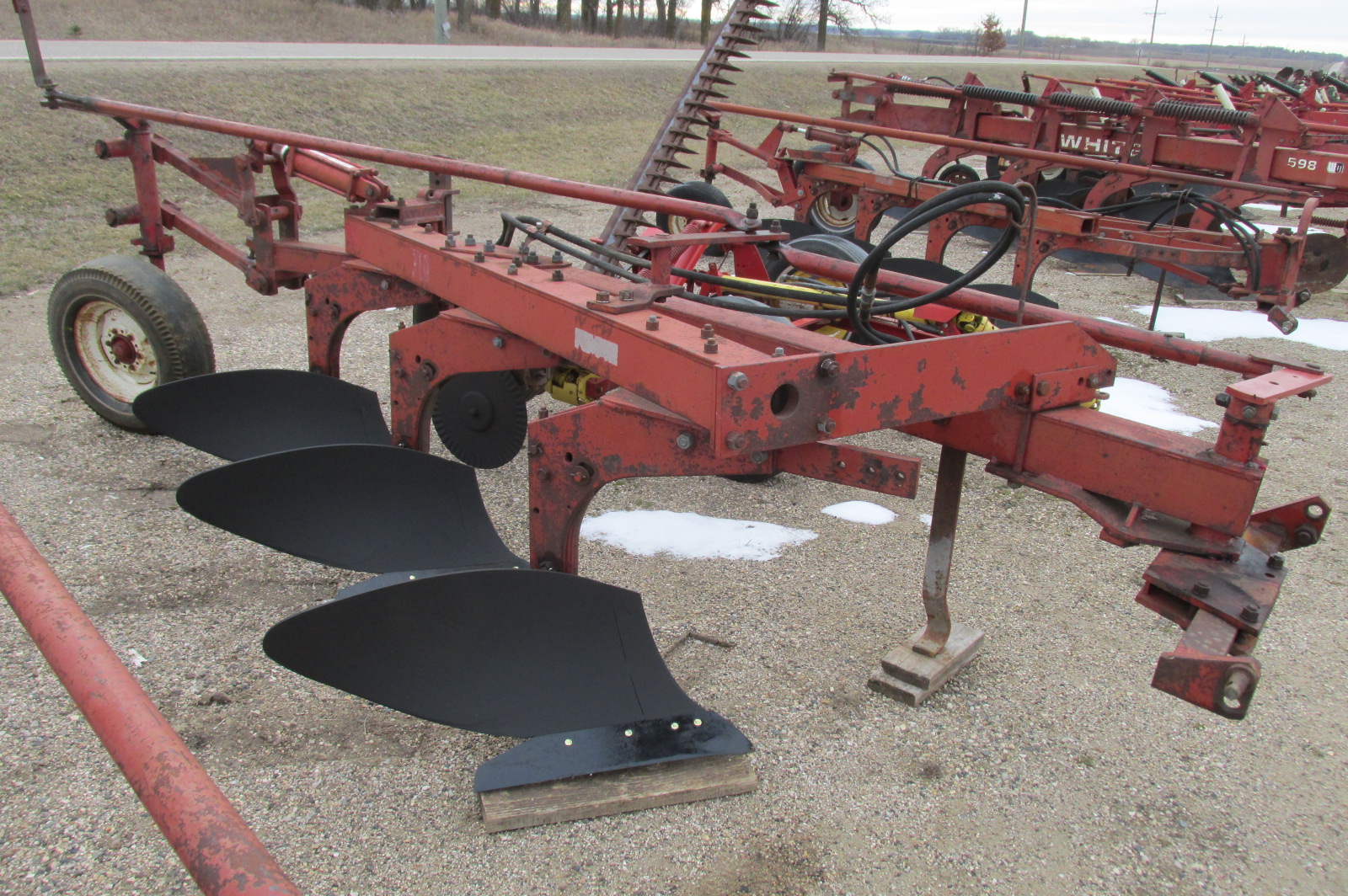 International model 710 3x18 trip bottom semi mounted plow with new shares. Greased and field ready. Hydraulic cylinder included.