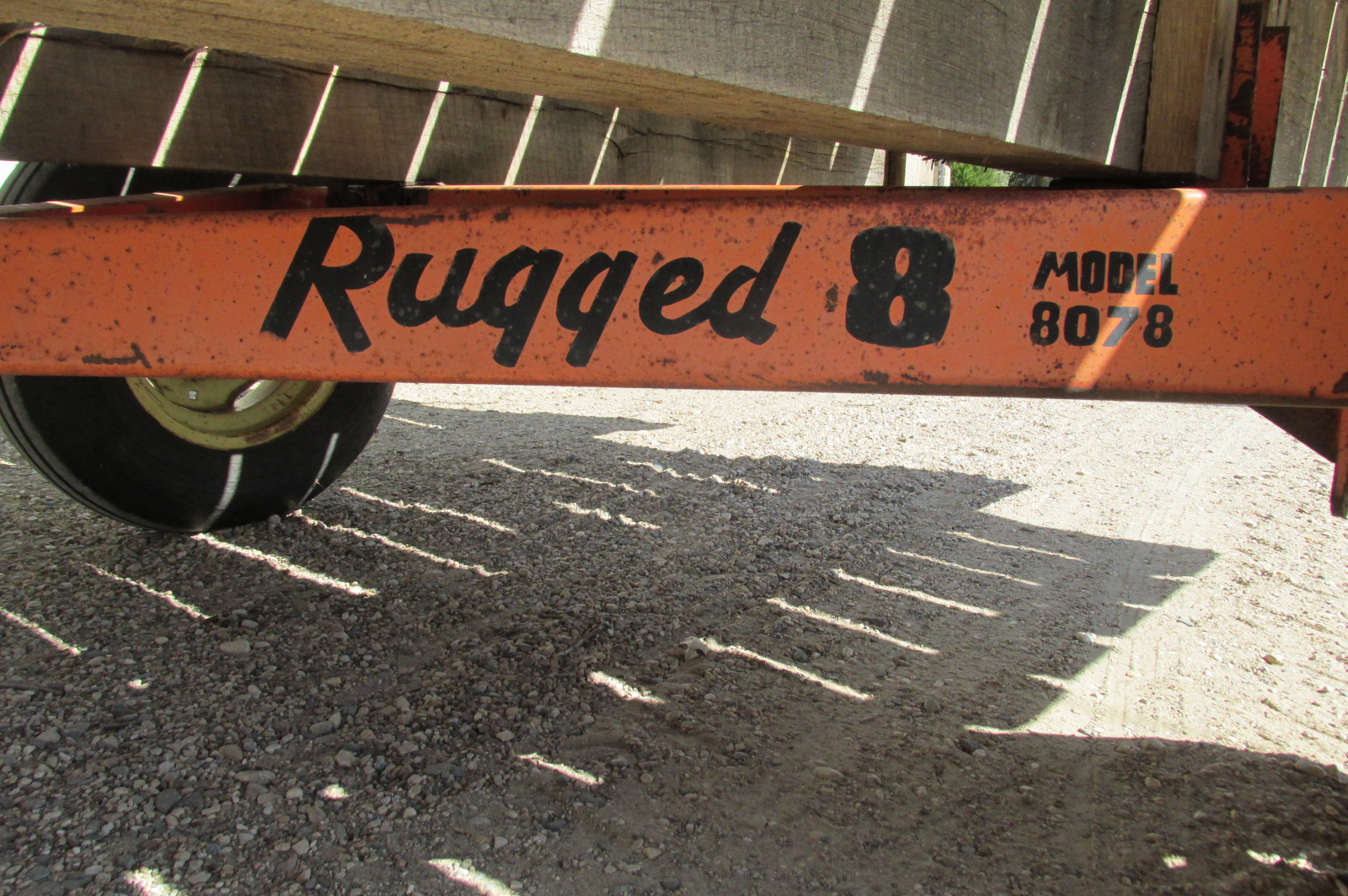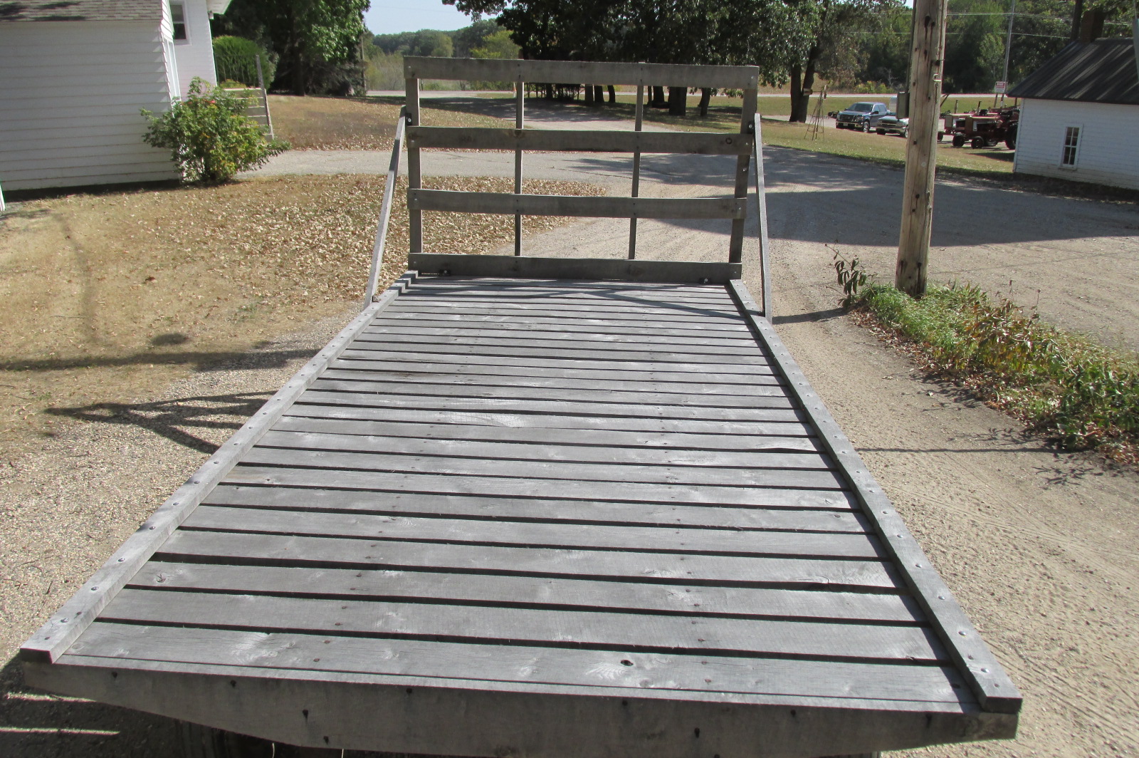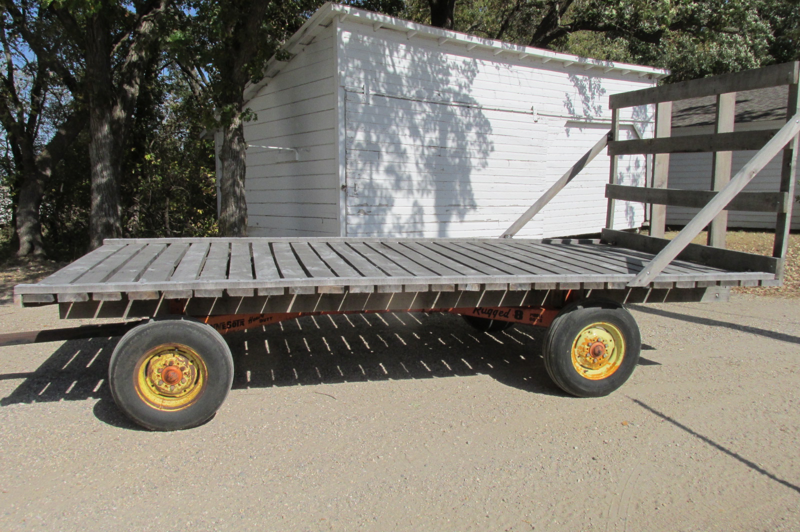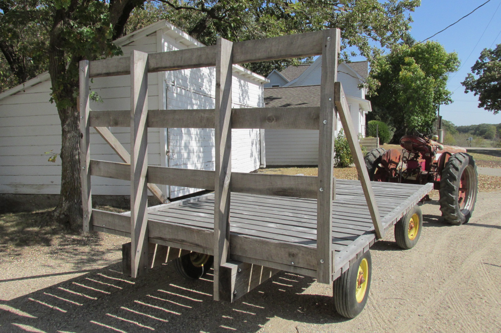 Unused 8ft x 16ft oak hay rack with Minnesota 8 ton wagon.