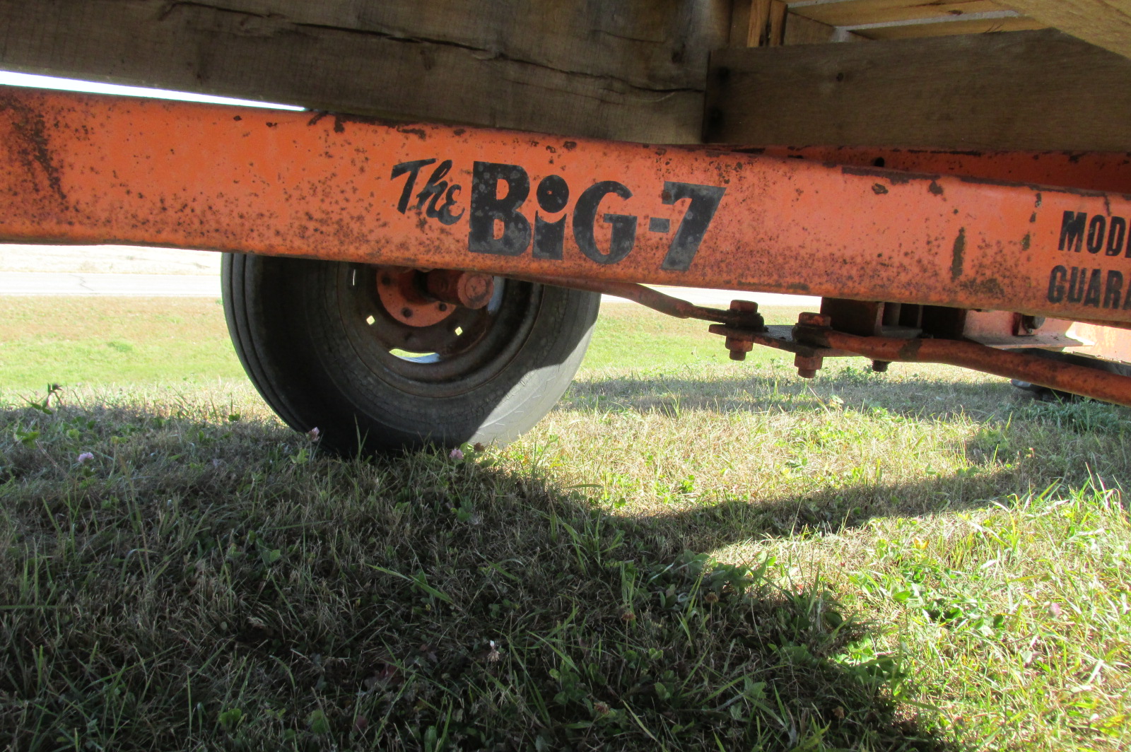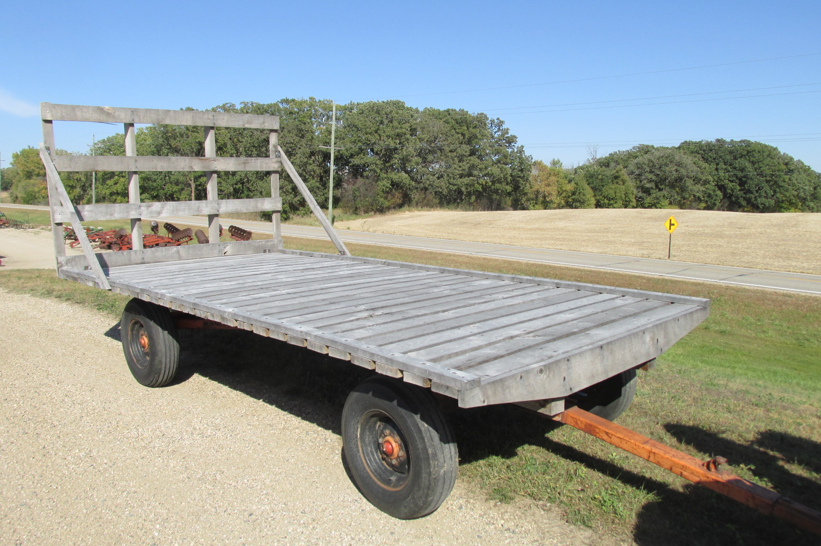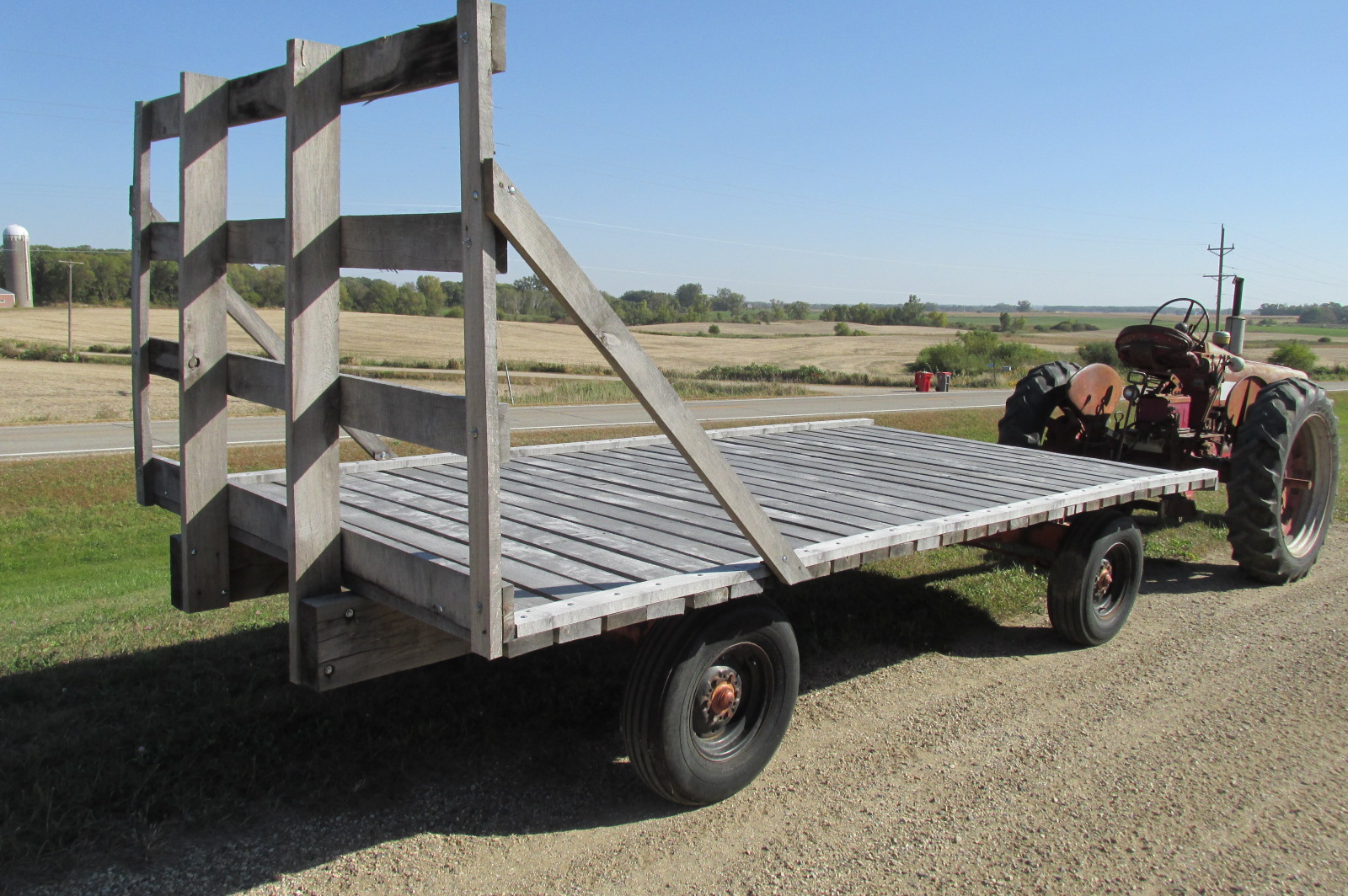 Unused 8ft x 16ft oak hay rack with Minnesota 7 ton wagon.