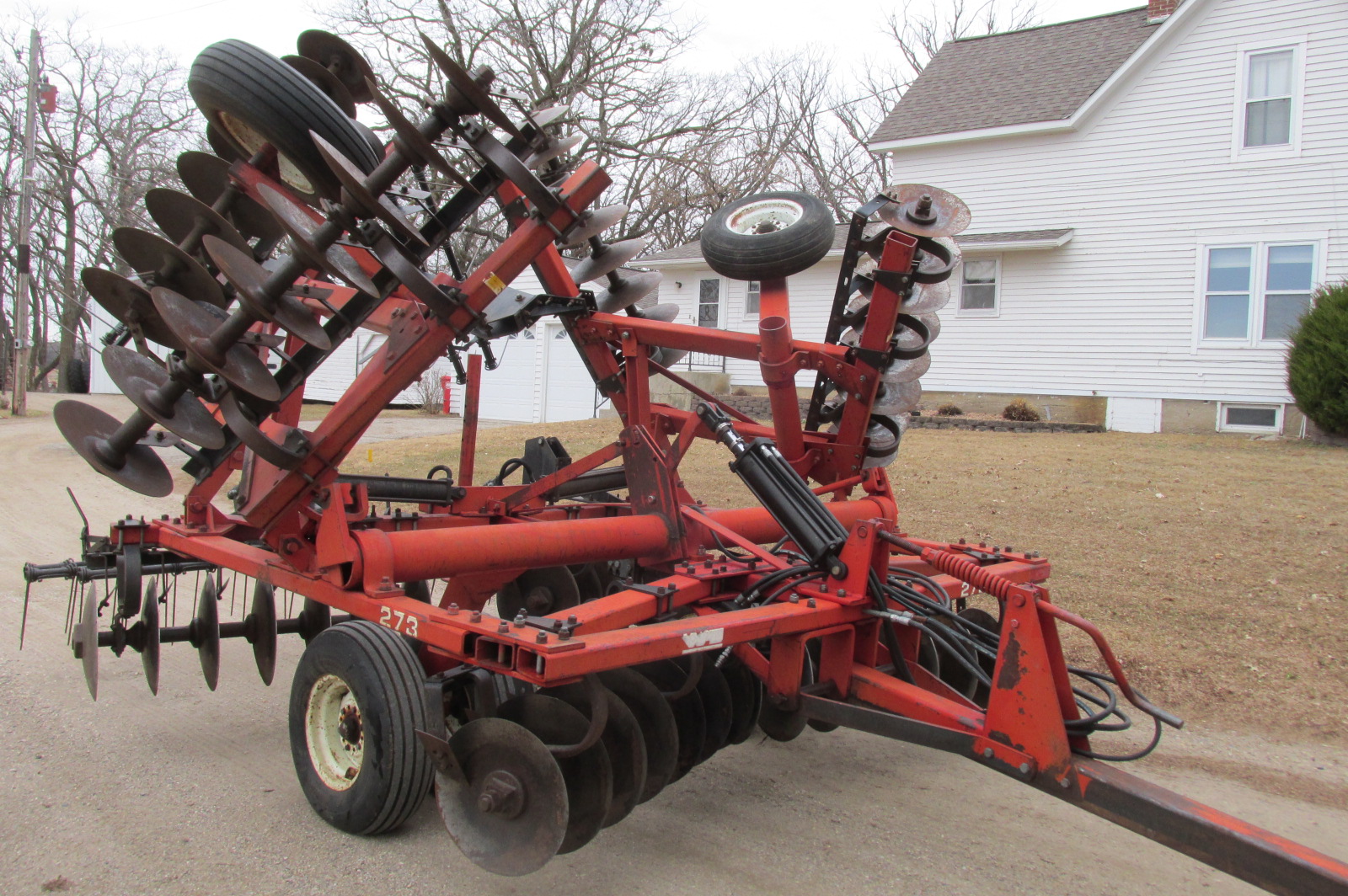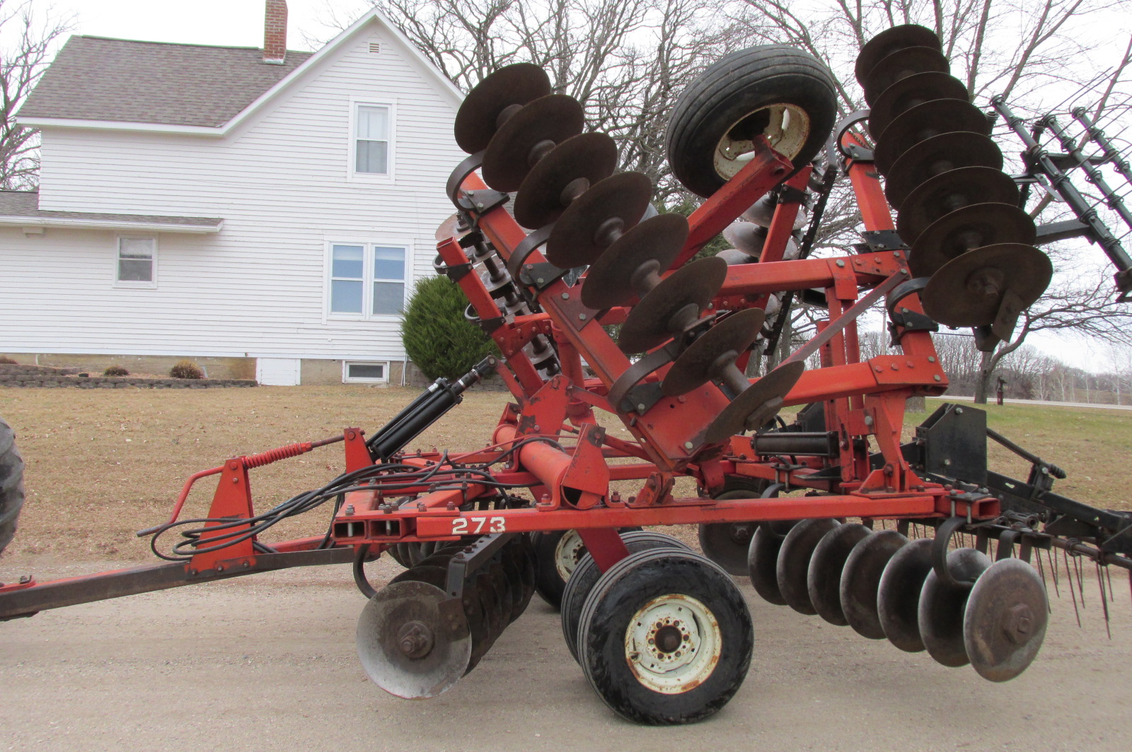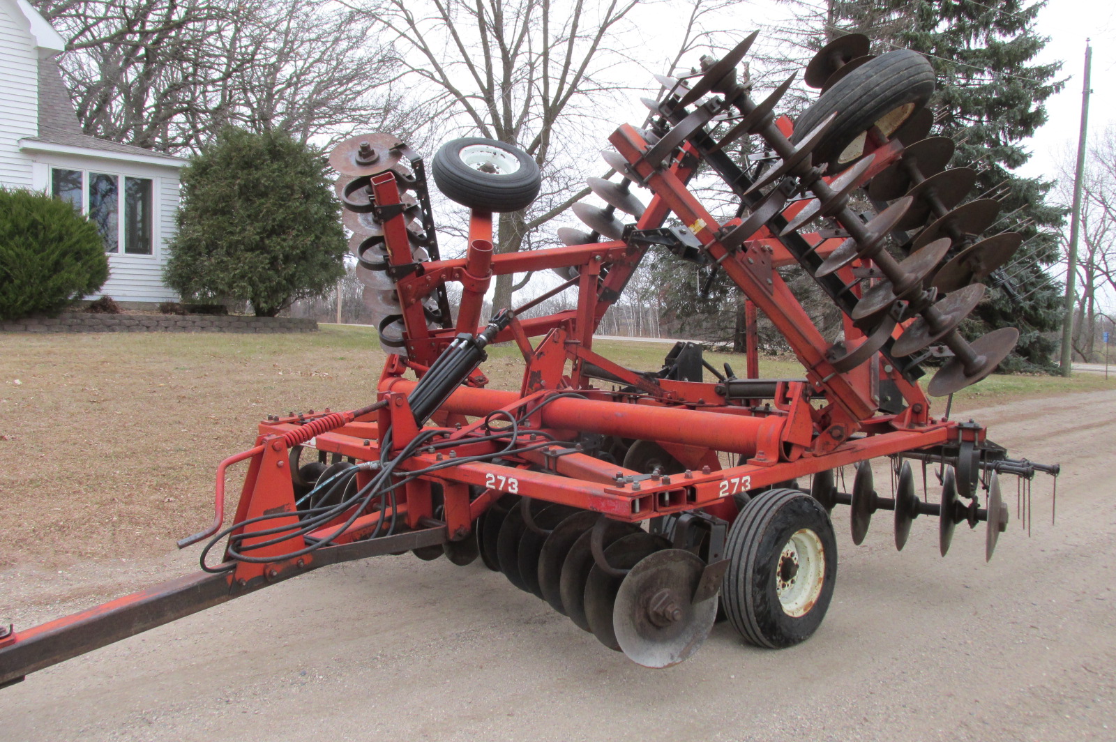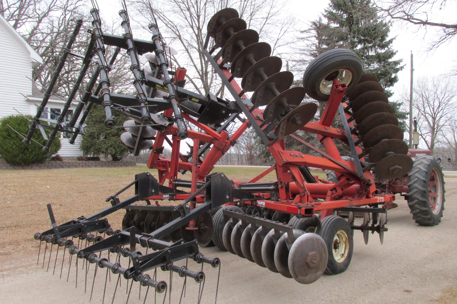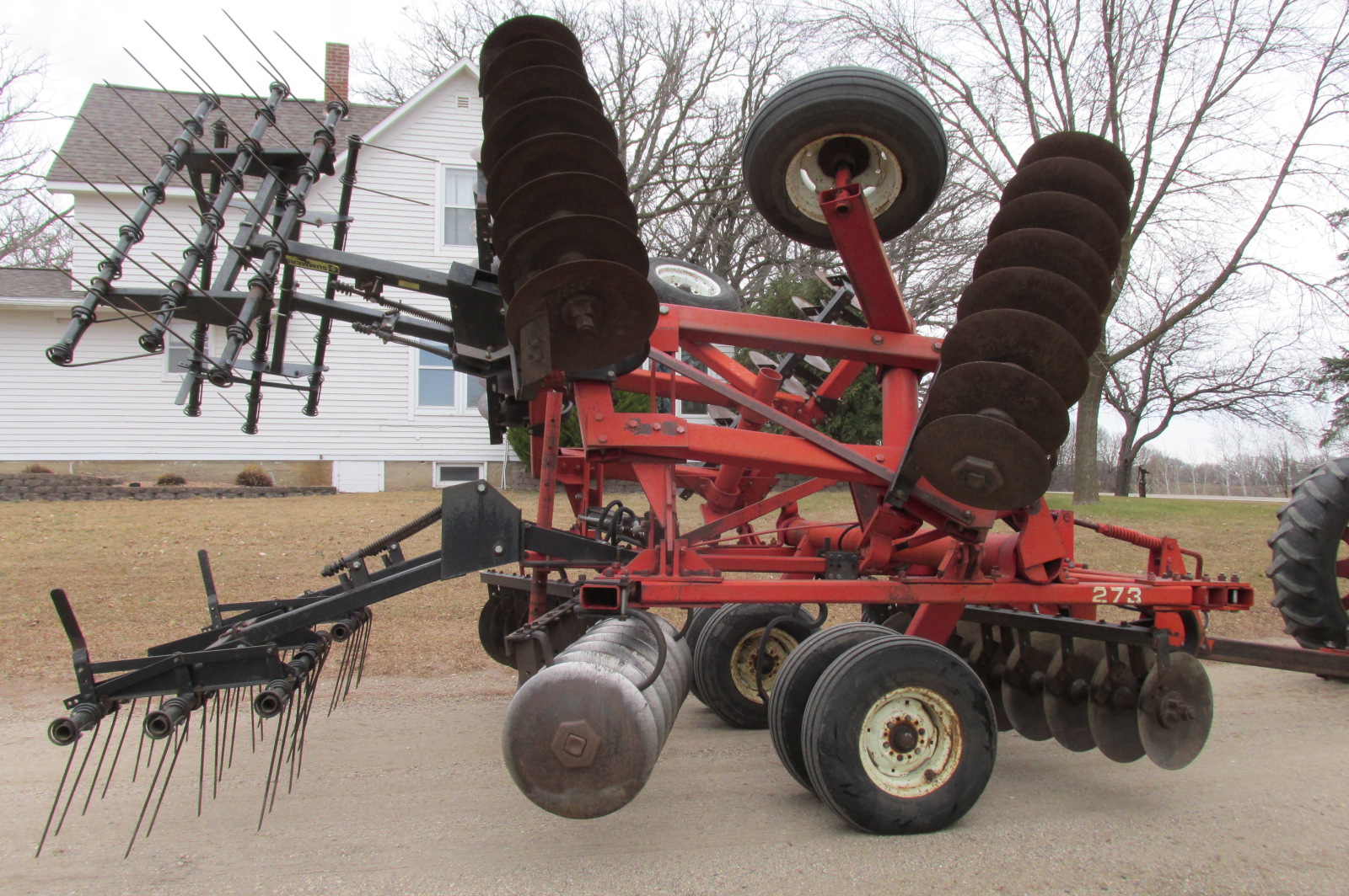 White model 273 21.6 foot rock cushion disc with 3 bar mounted mulcher harrow.