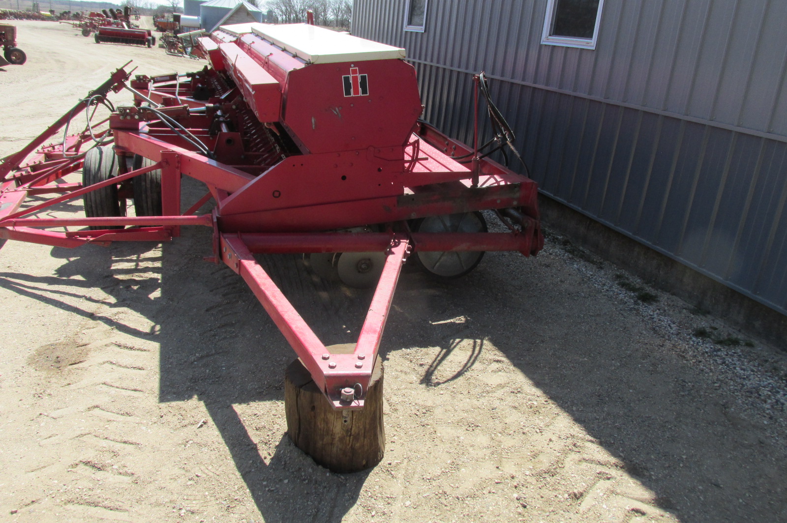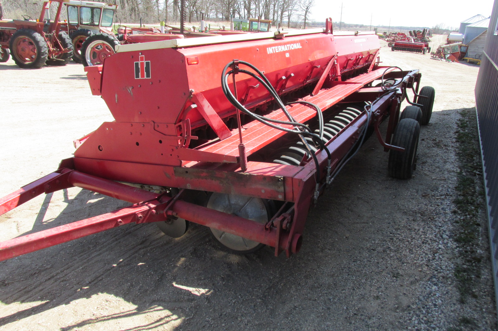 International model 620 20 foot (2-10fts) with rubber press wheels, six inch spacing, grass seeder attachment and end pull drill transport.