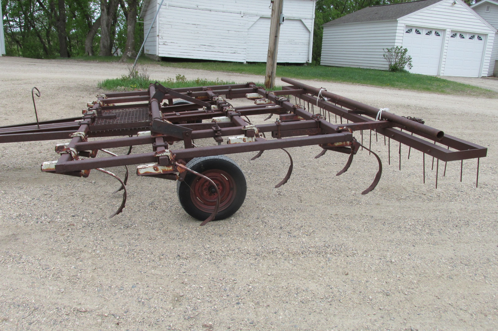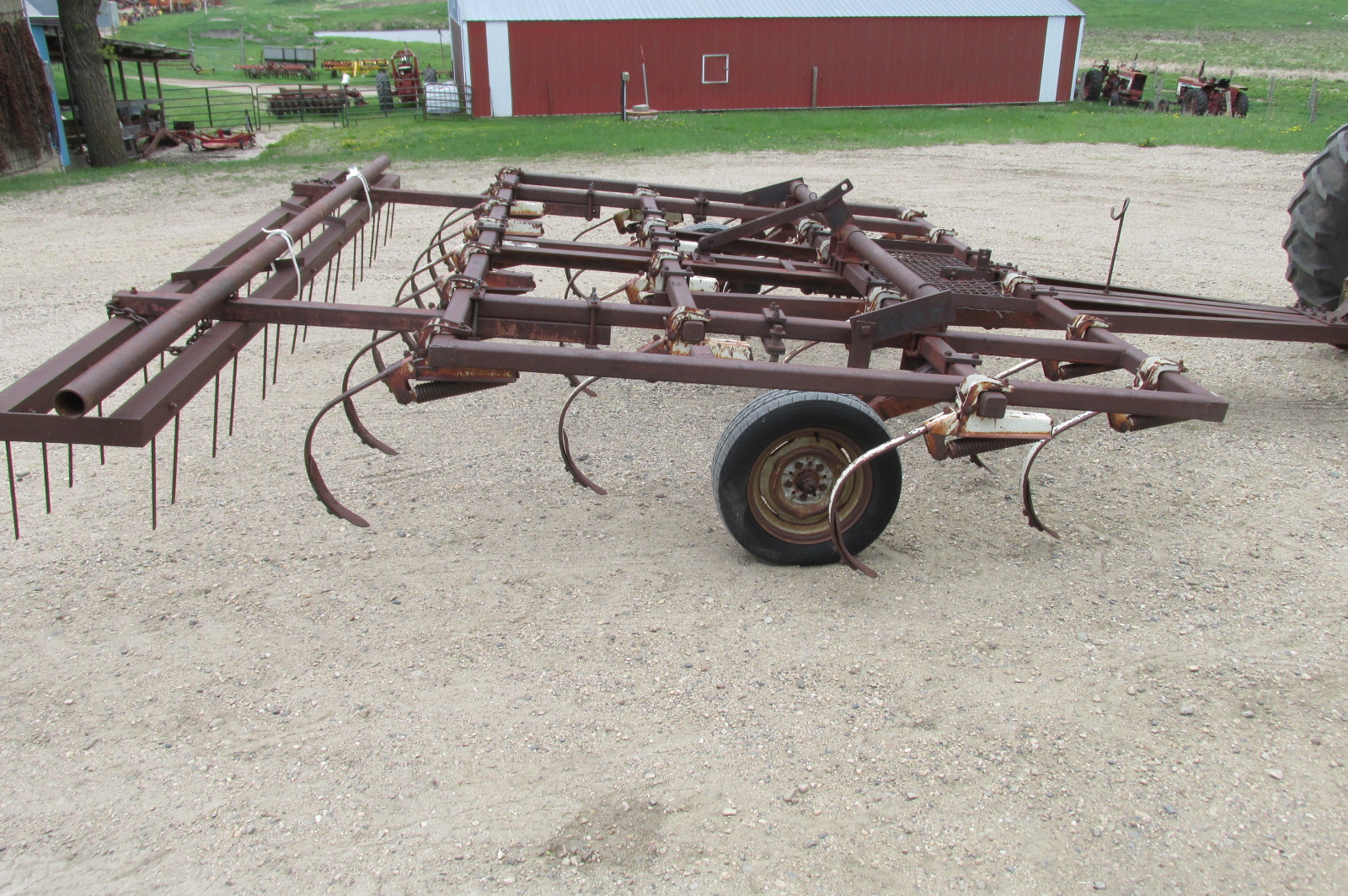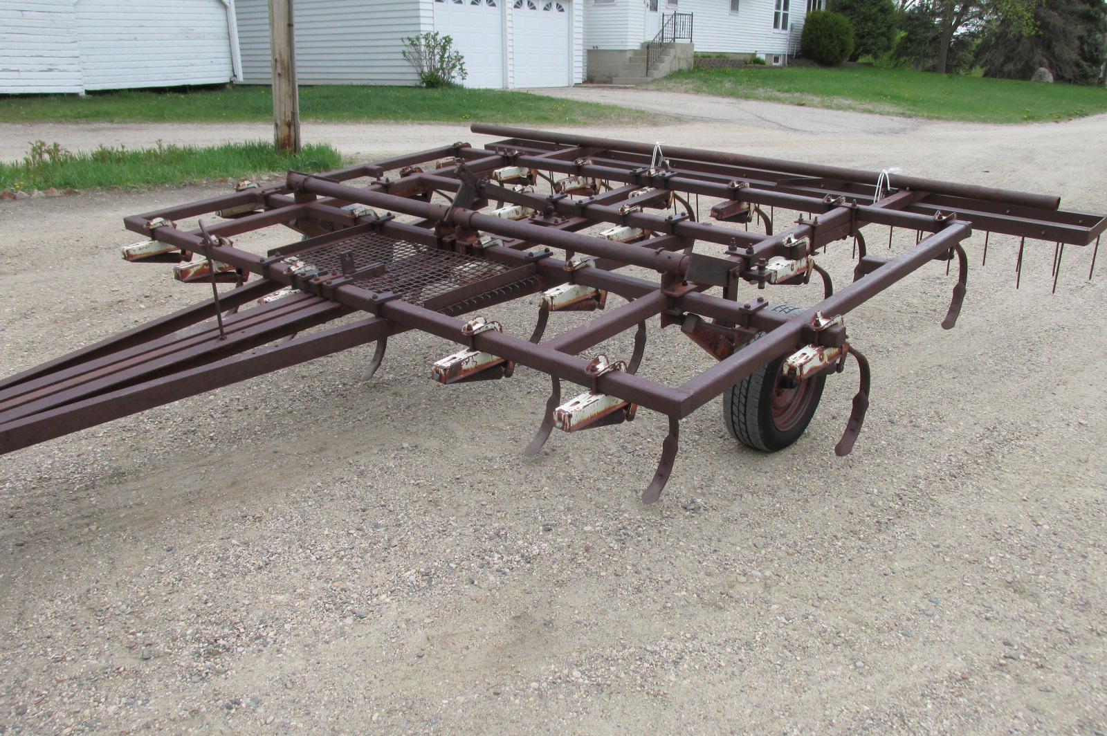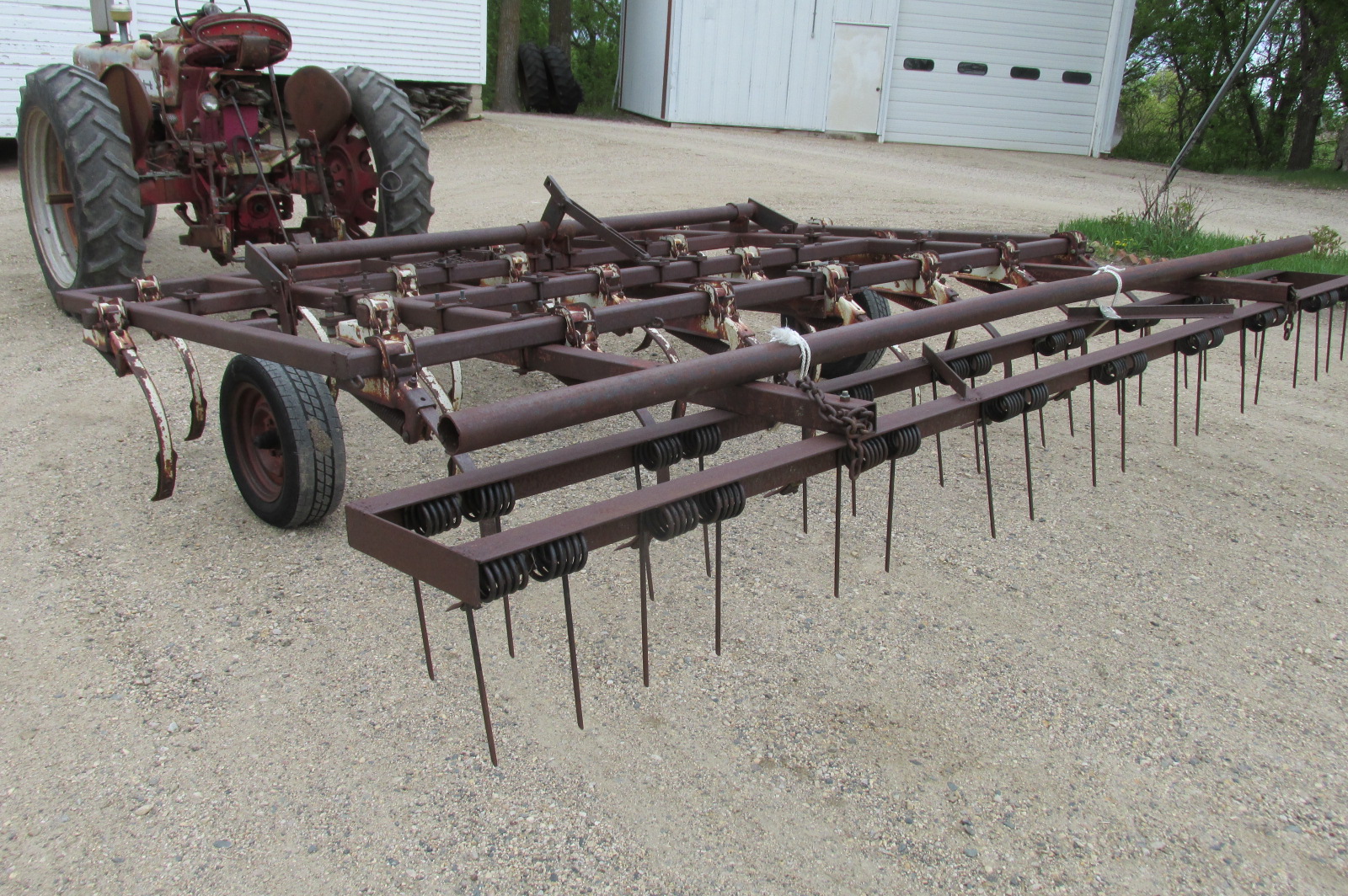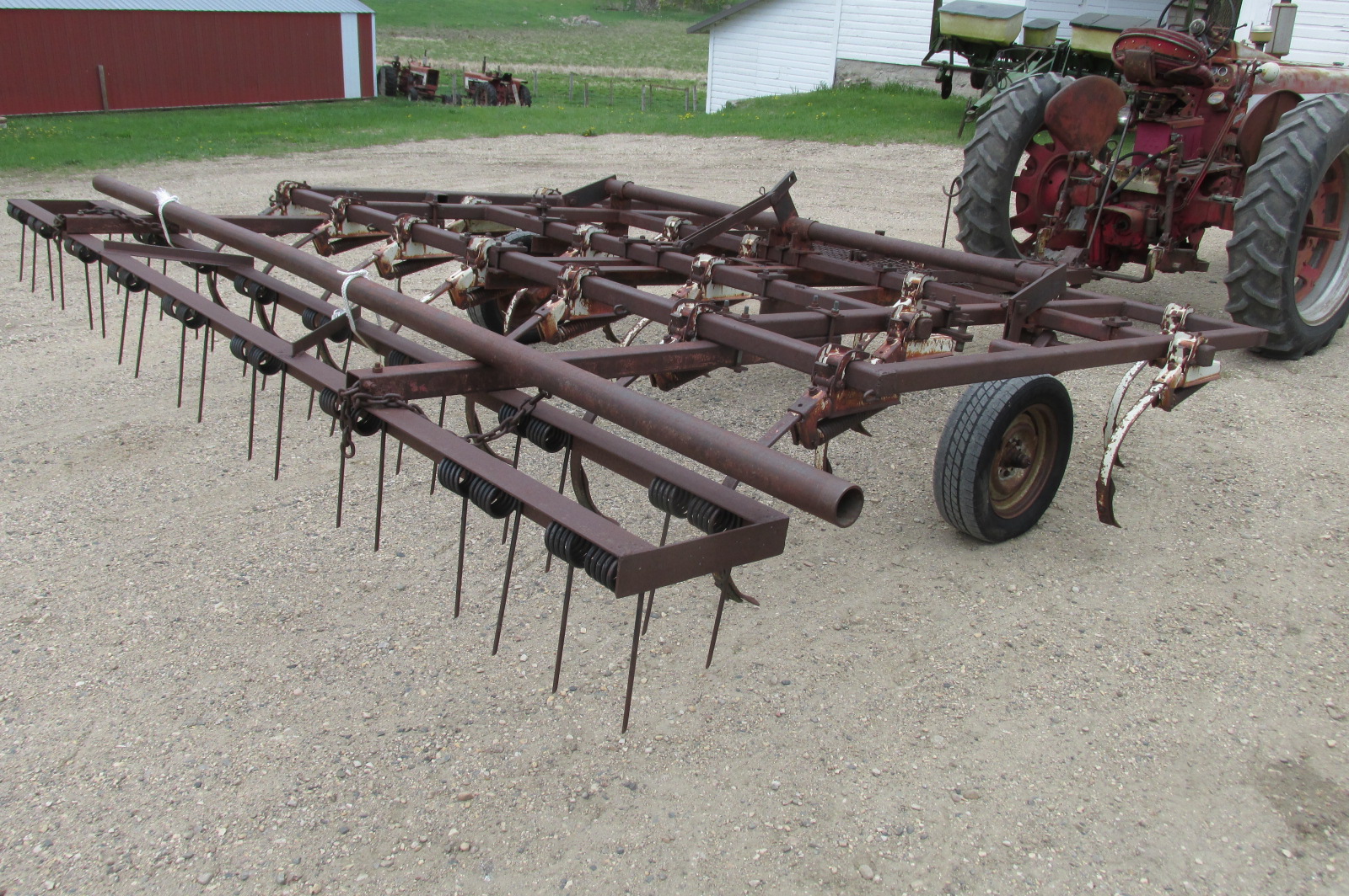 12.5 foot field cultivator with Vibrashank tines and 4 bar spacing. Includes mounted mulcher harrow.