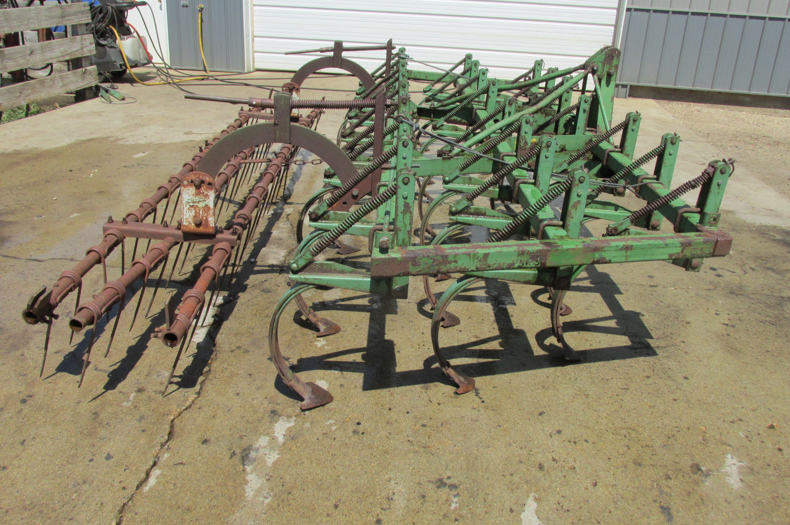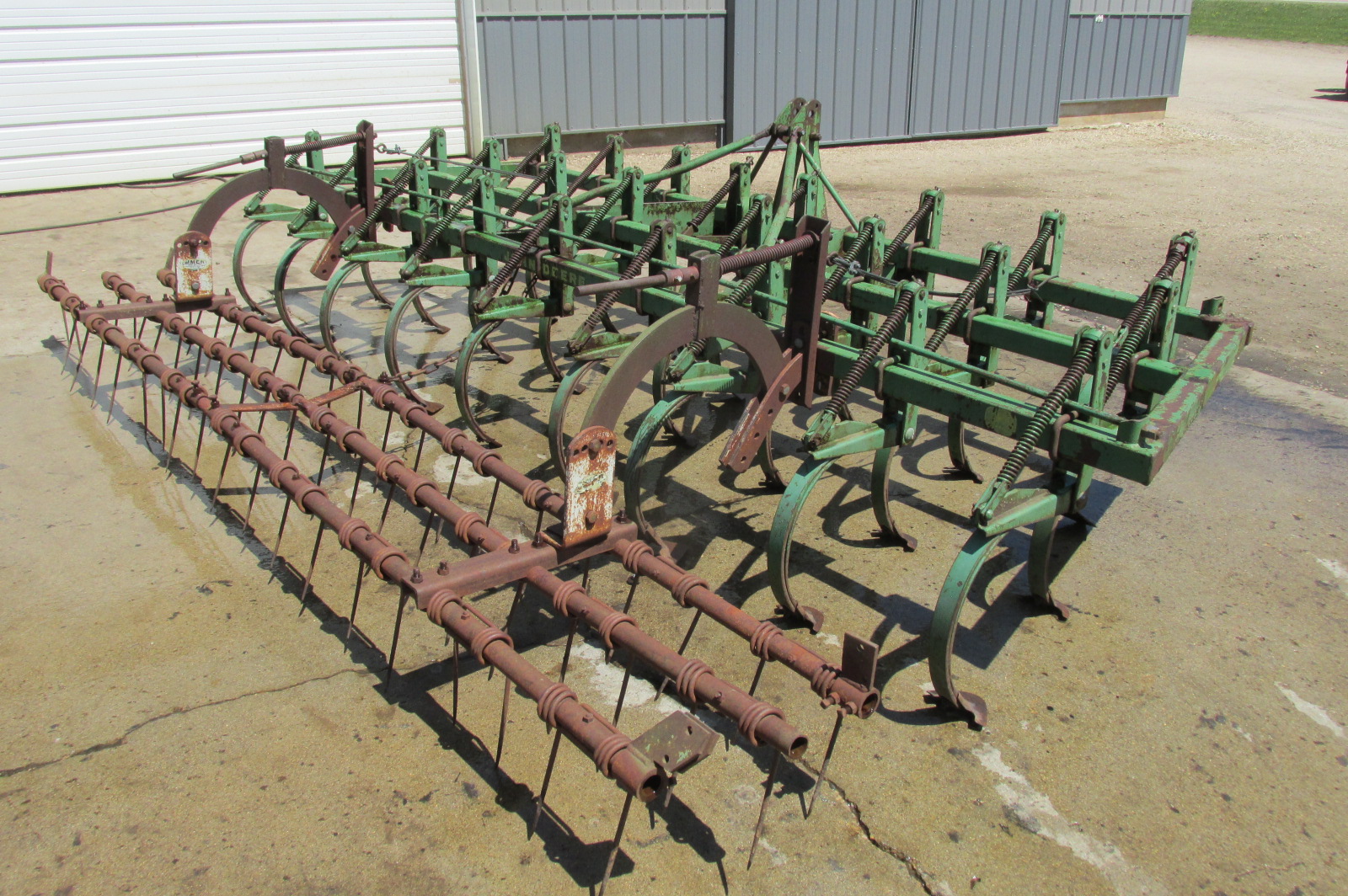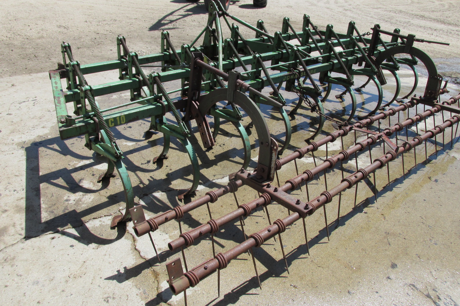 John Deere model C10 12.5 foot 3 point field cultivator with mounted mulcher harrow.