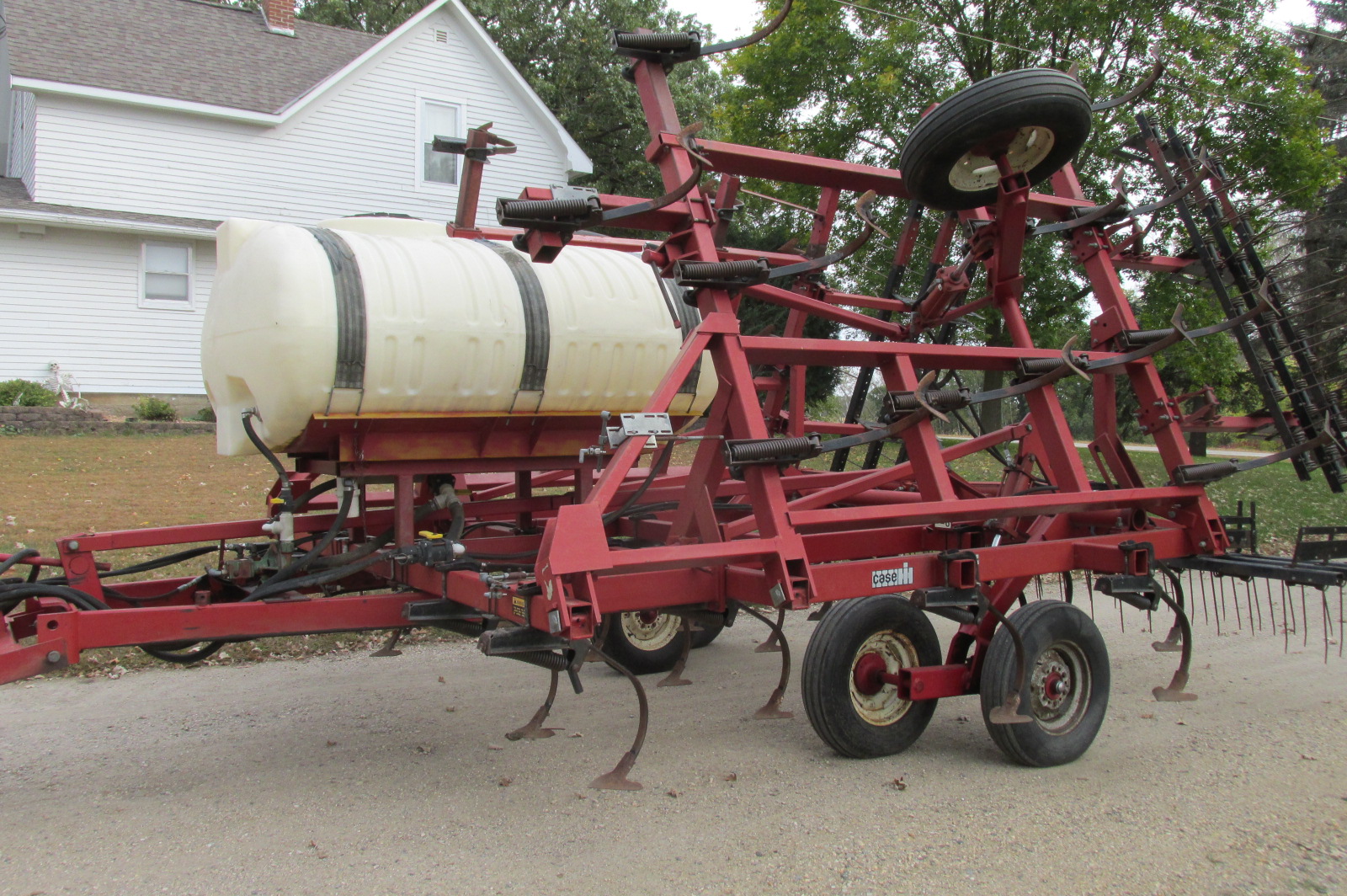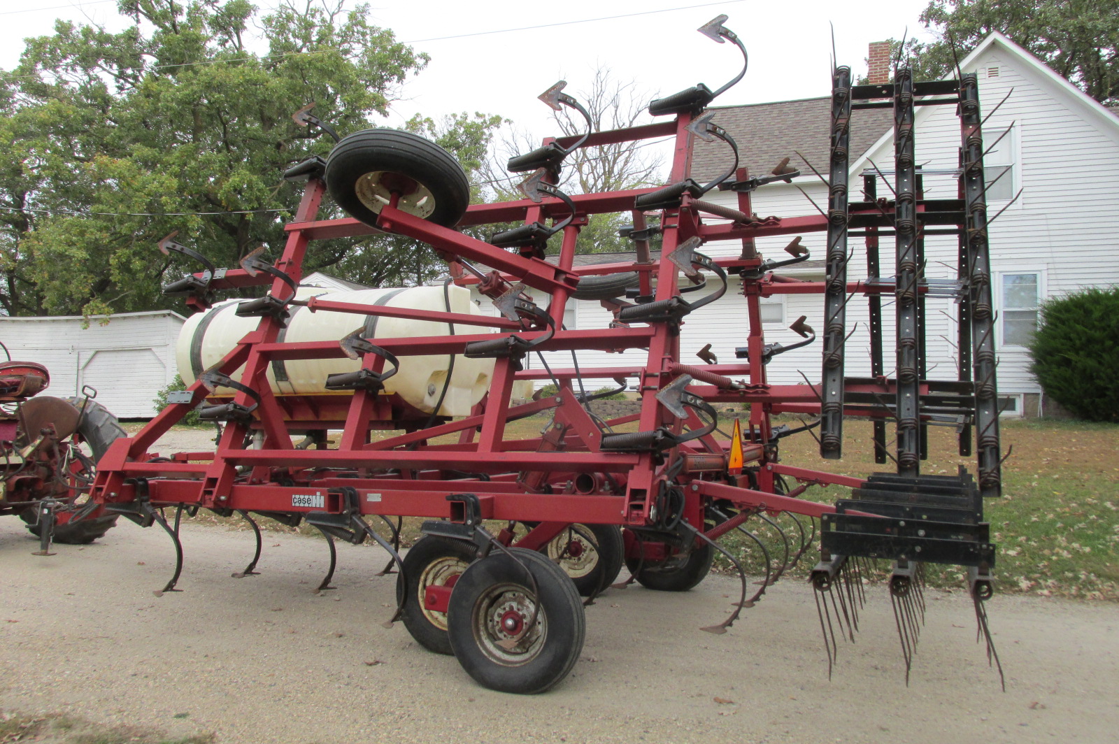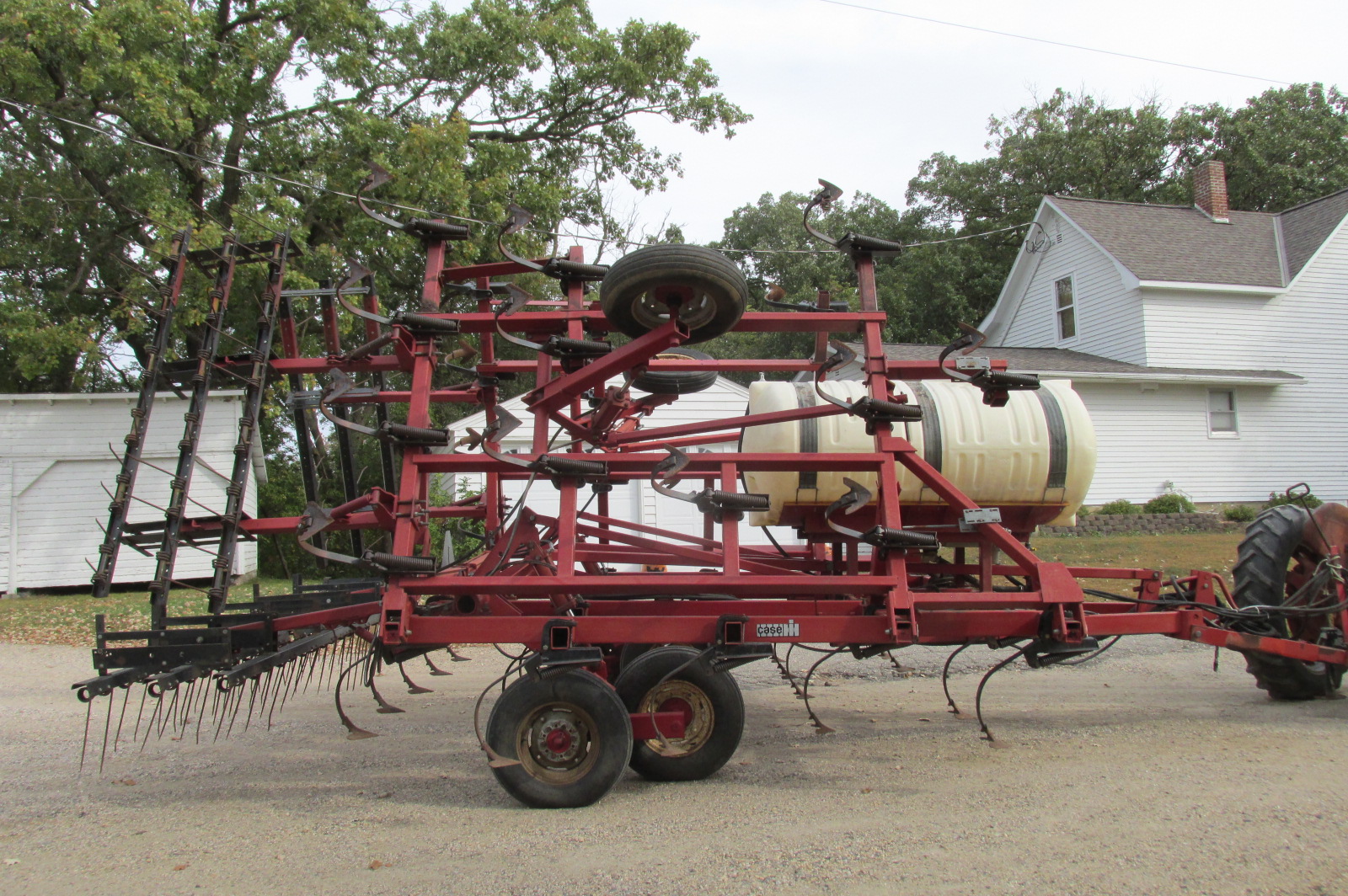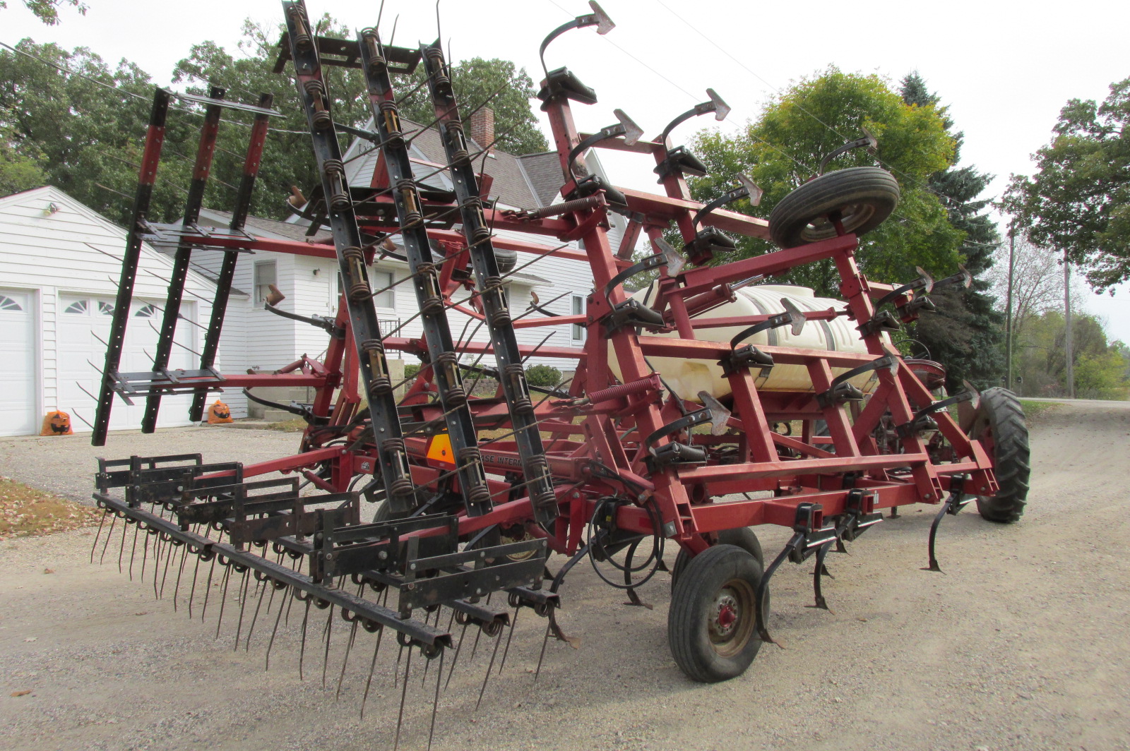 Case International model 4800 26.5 foot Vibrashank field cultivator with International 3 bar mounted mulcher harrow.