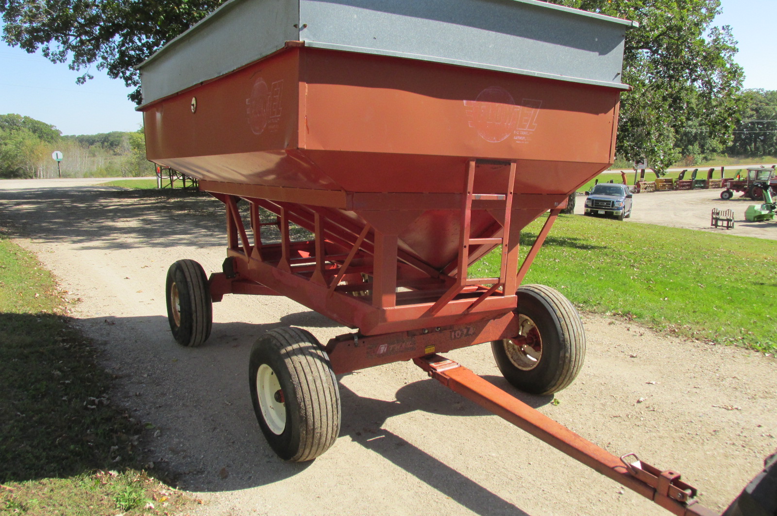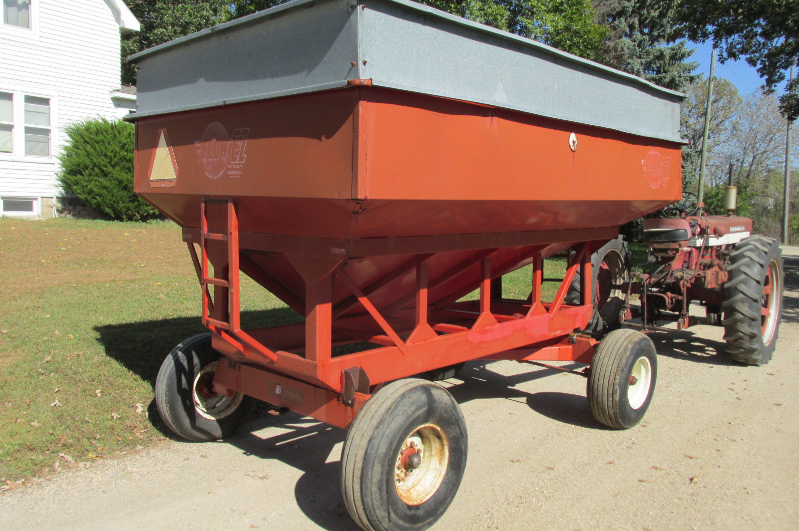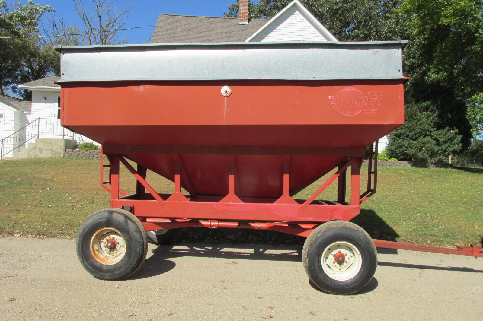 EZ Flow model 300 gravity box with extensions. Attached to a EZ Trail model 1072 10 ton wagon with 12.5Lx15 flotation tires.