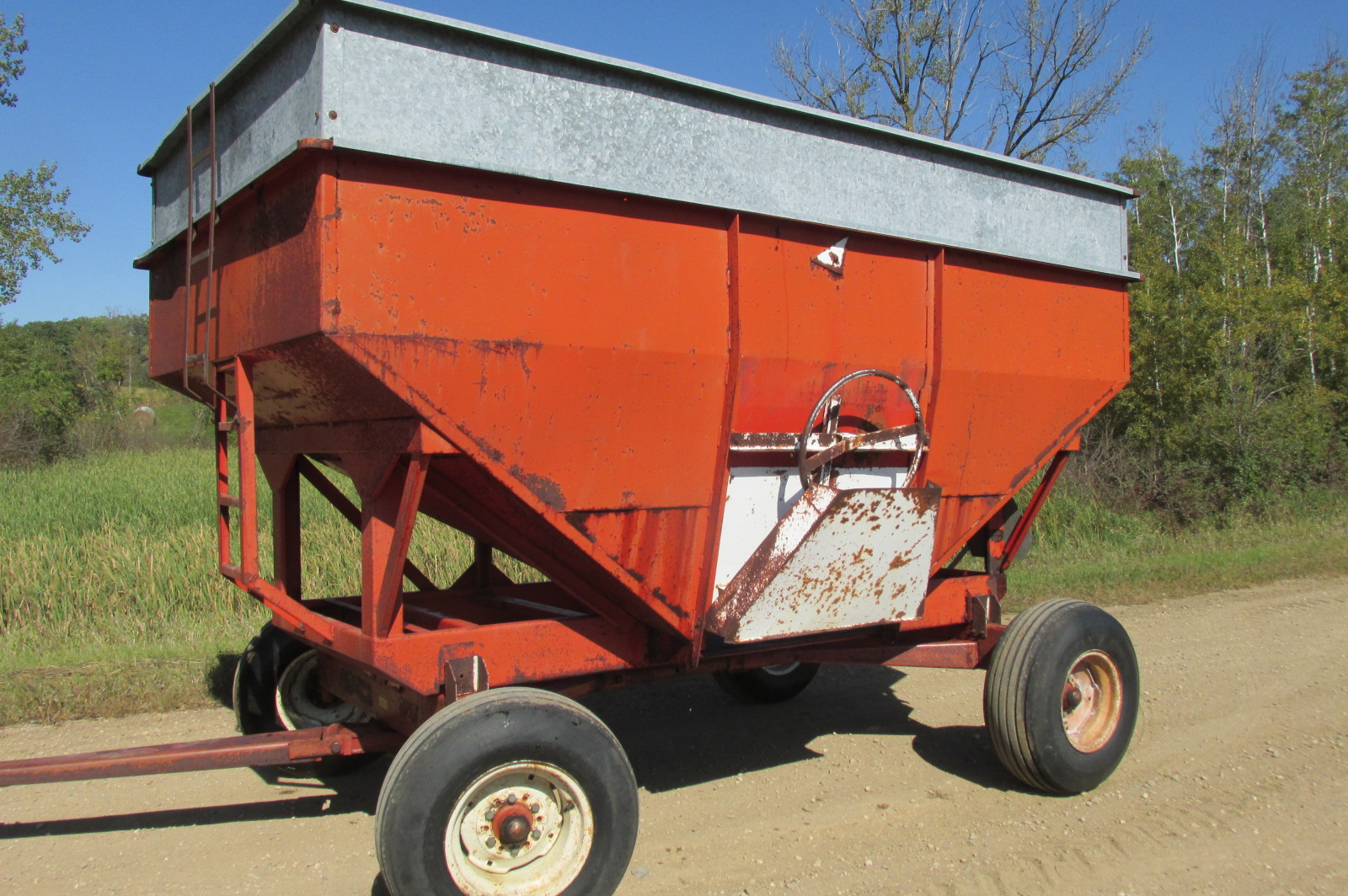 EZ Flow model 300 gravity box with extensions. Attached to a EZ Trail model 1072 10 ton wagon with flotation tires.