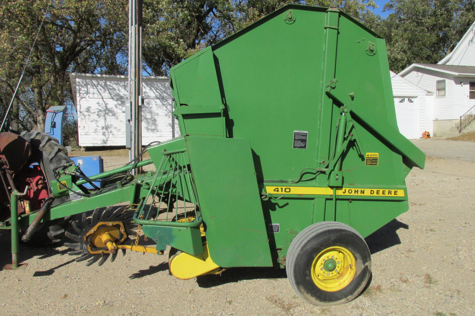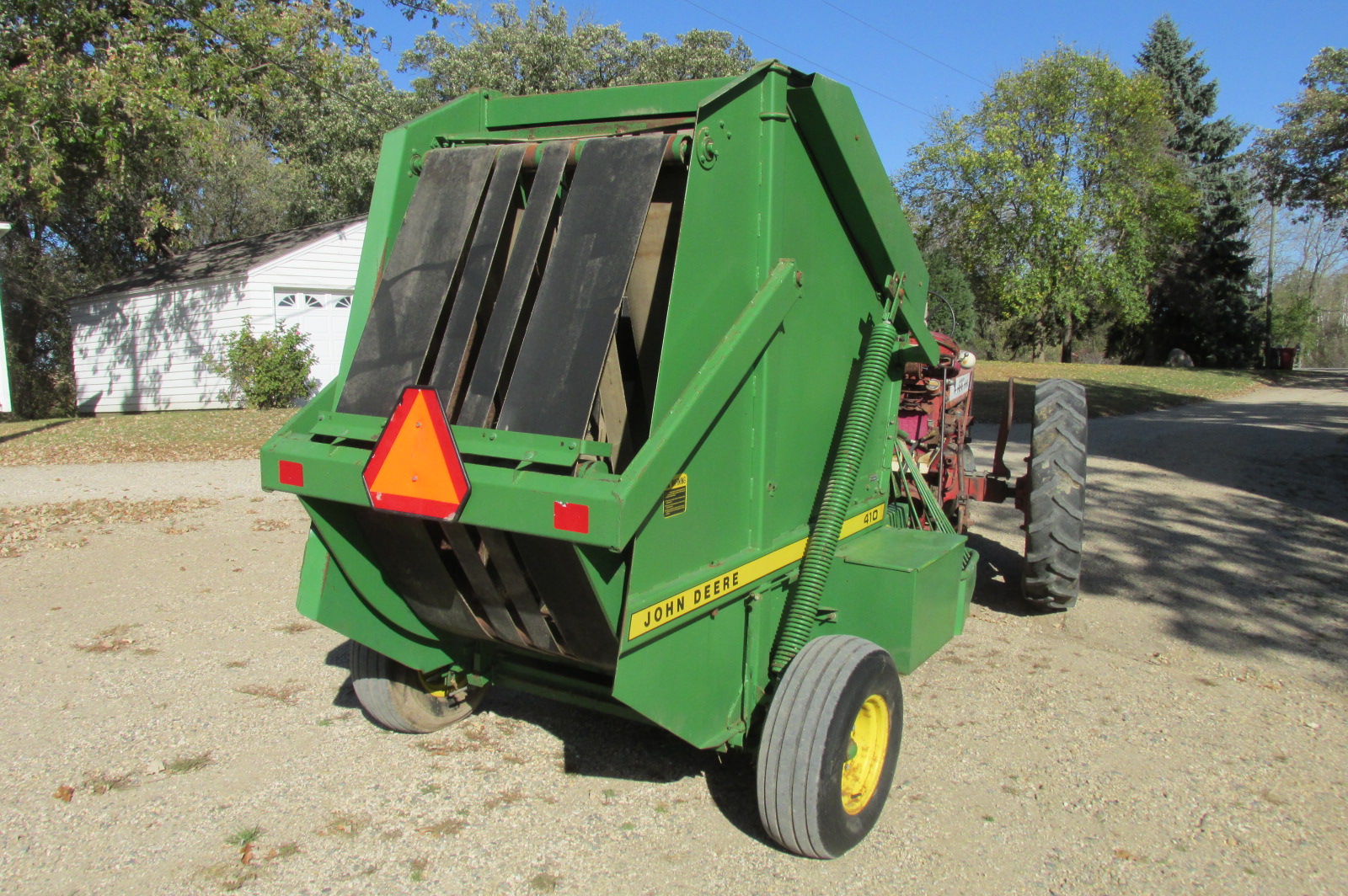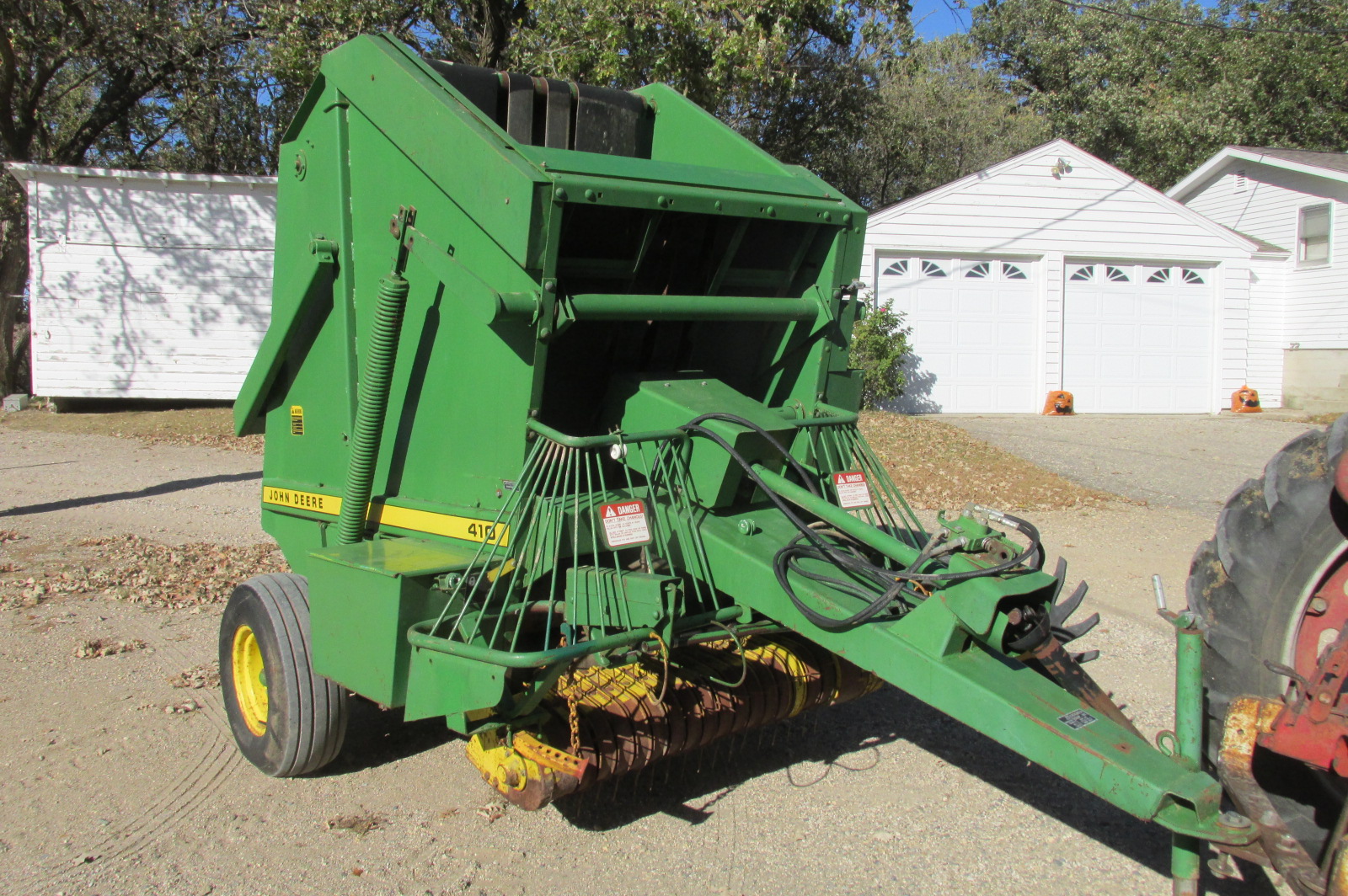 john deere model 410 round baler. Makes 4 foot wide bales up to 5 feet in diameter.