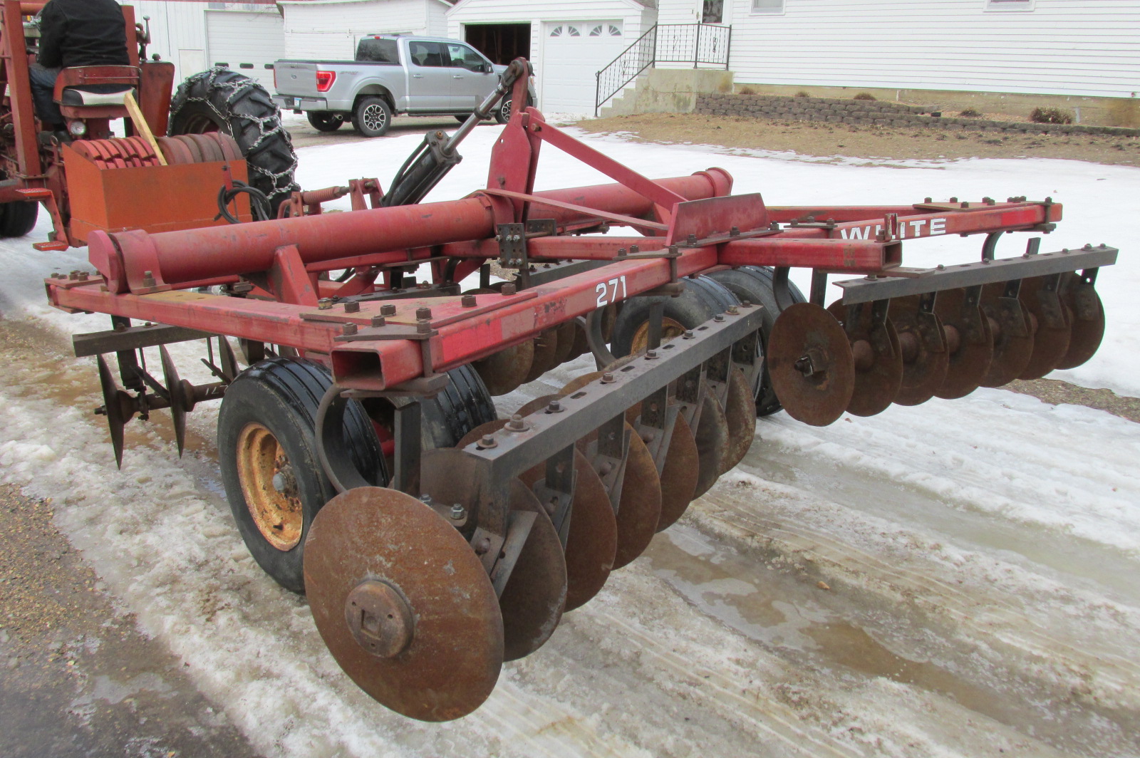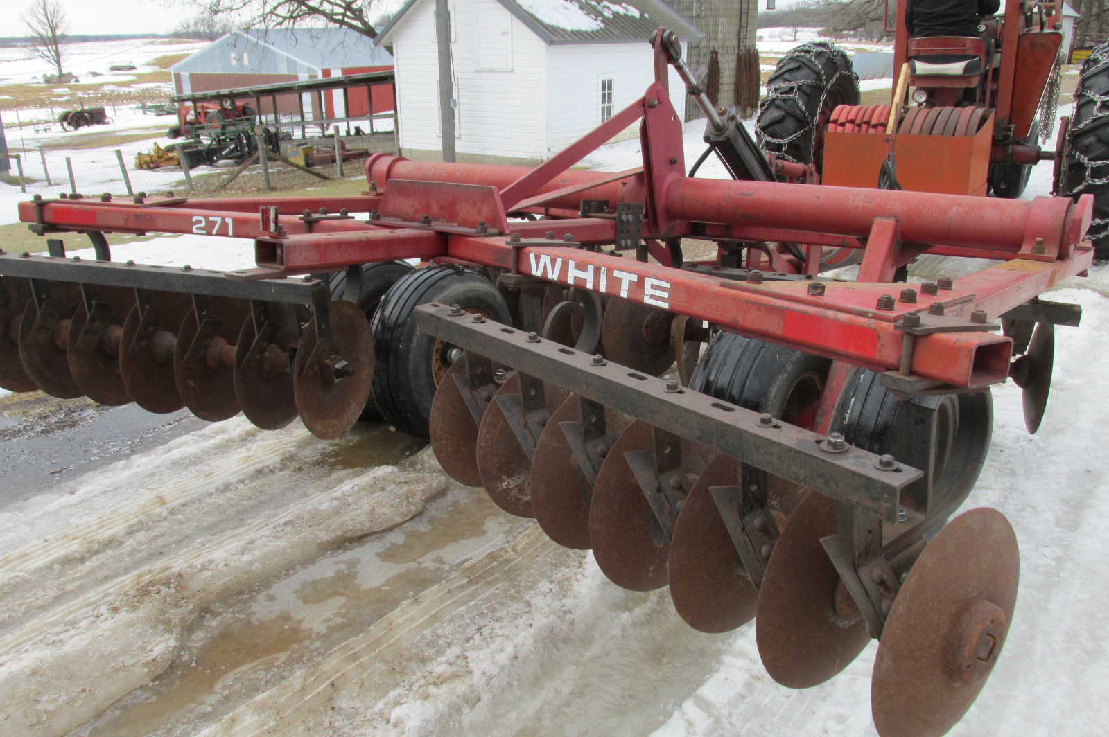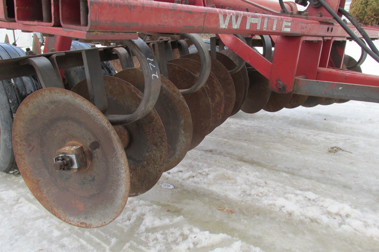 White model 271 11 foot rock cushion disc.Dual flotation wheels.Big blades (19" F / 18" R)Good bearings and scrapers.Includes hydraulic cylinder.Greased up and field ready.