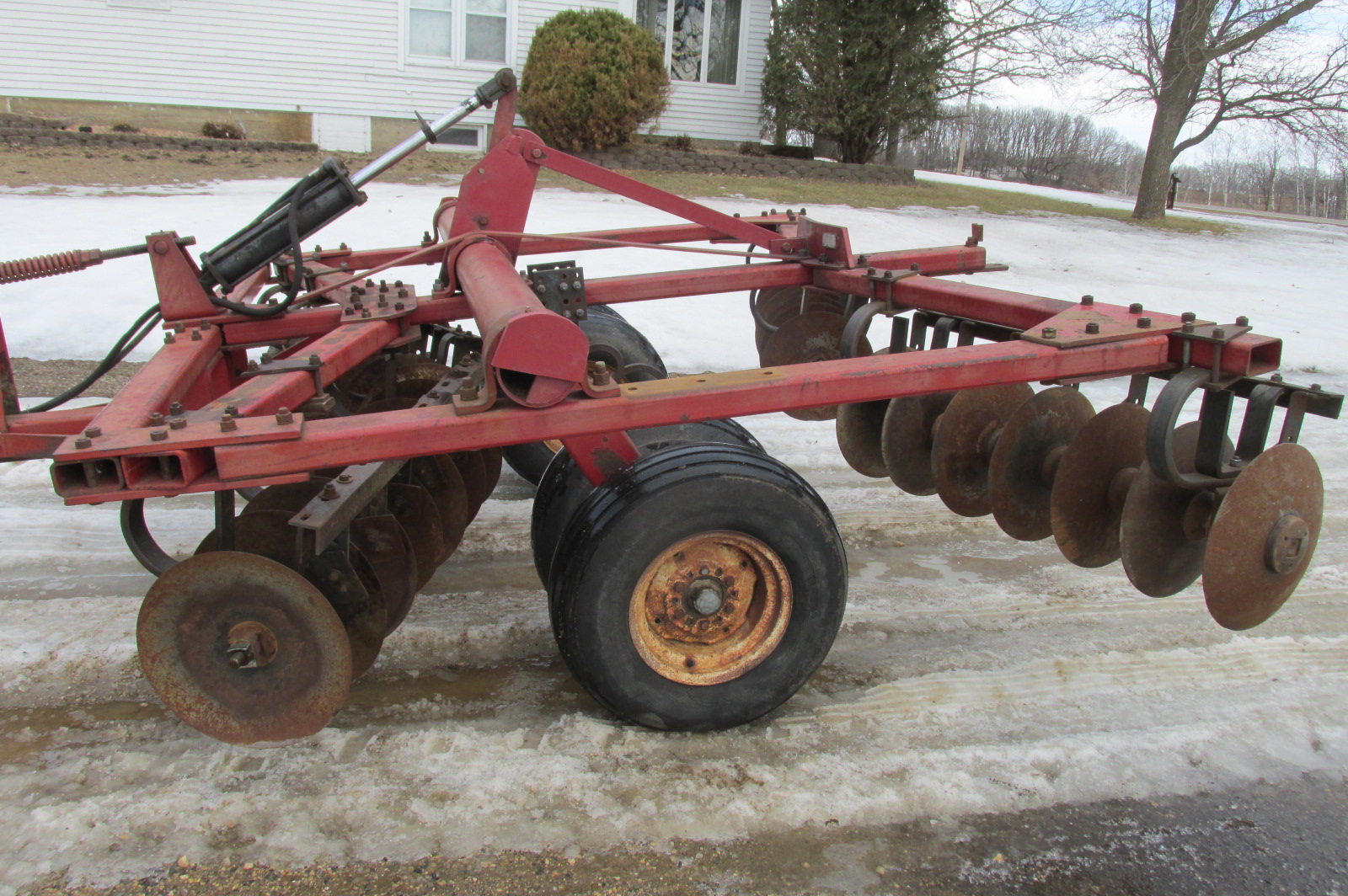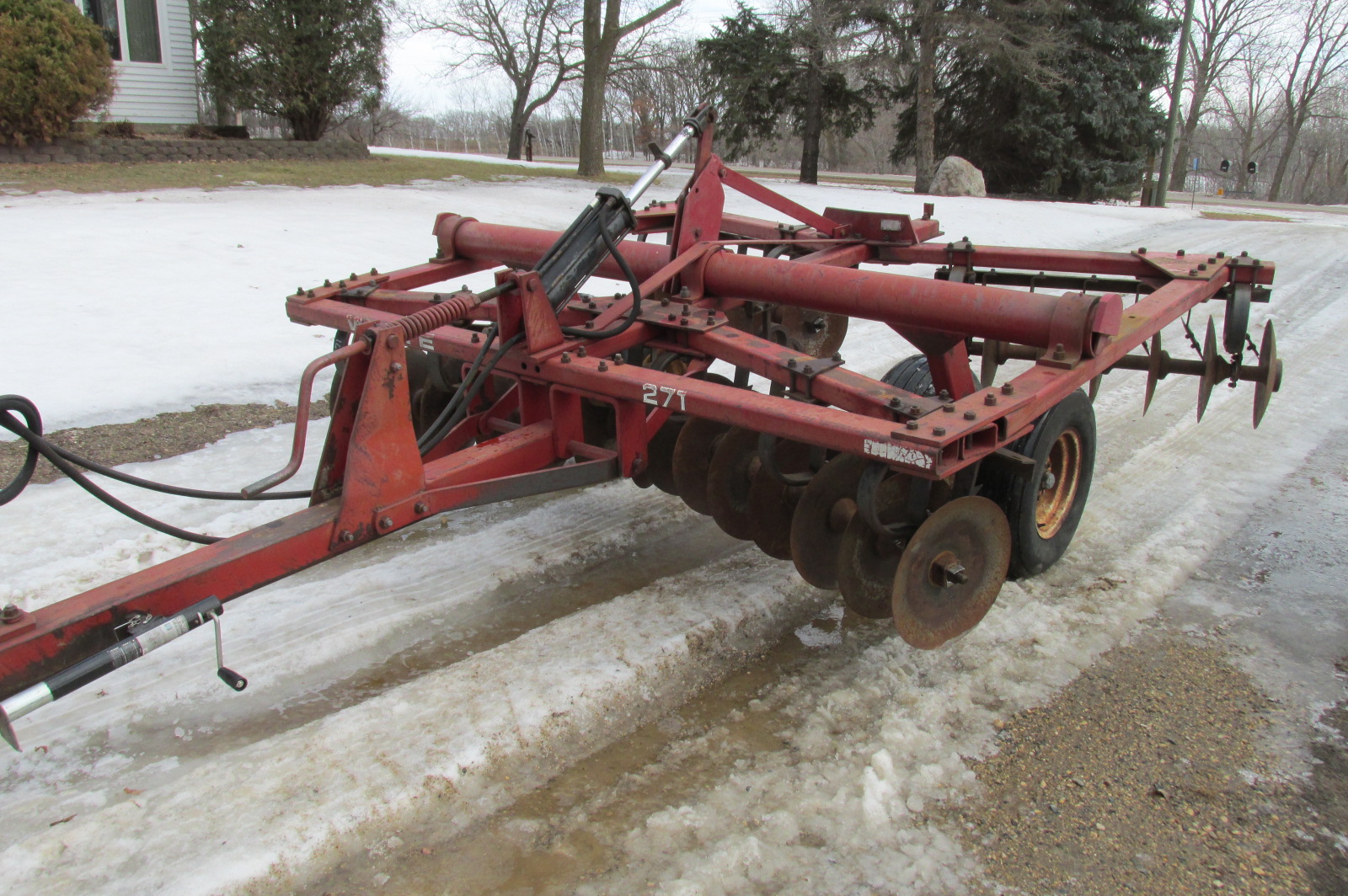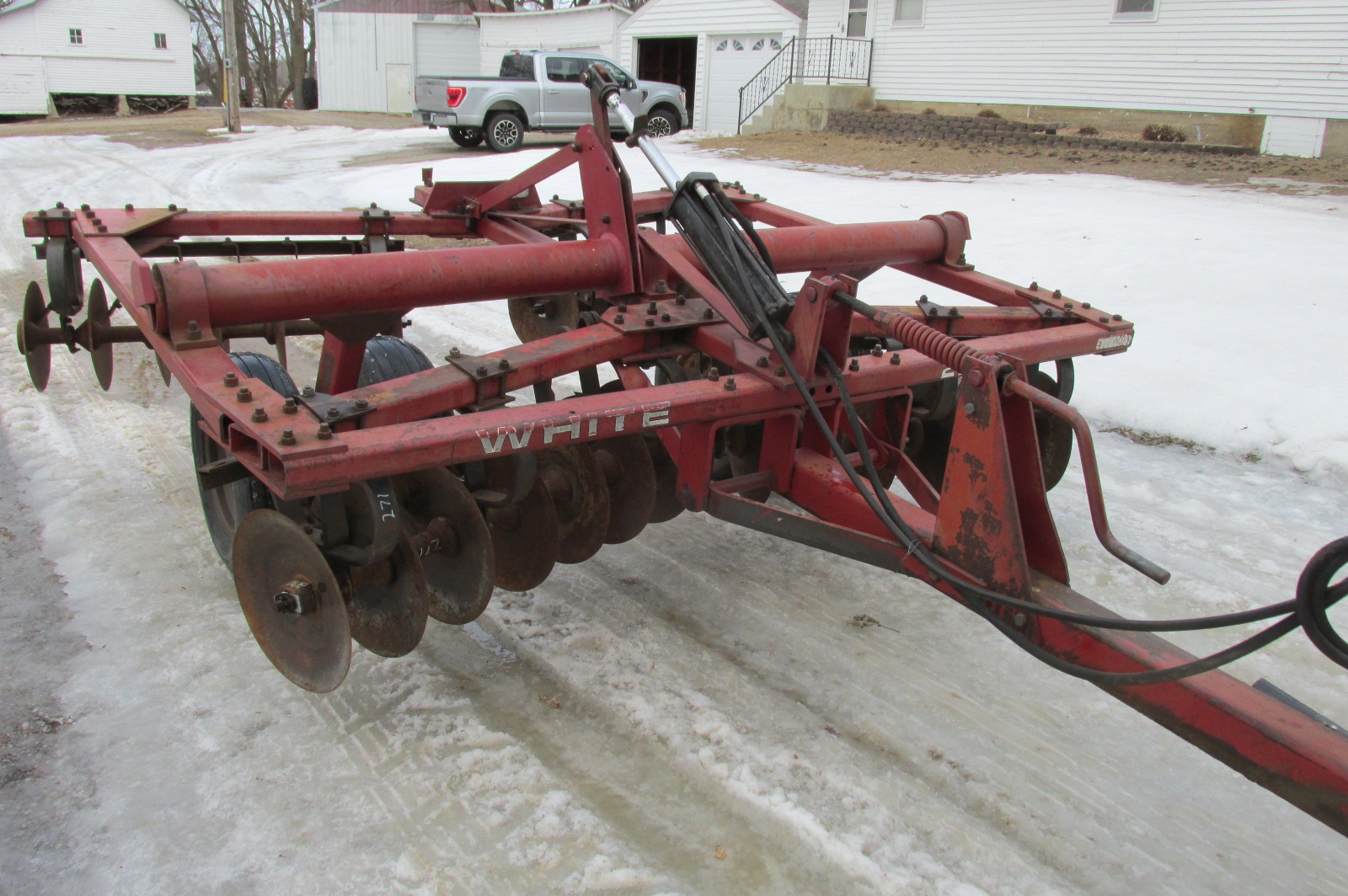 White model 271 11 foot rock cushion disc.Dual flotation wheels.Big blades (19" F / 18" R)Good bearings and scrapers.Includes hydraulic cylinder.Greased up and field ready.