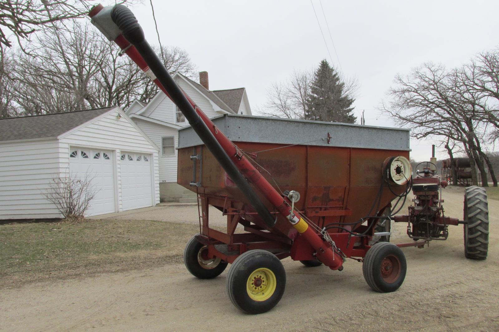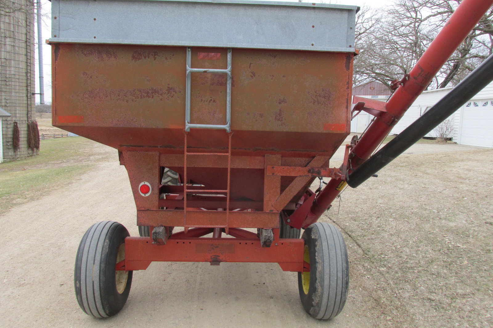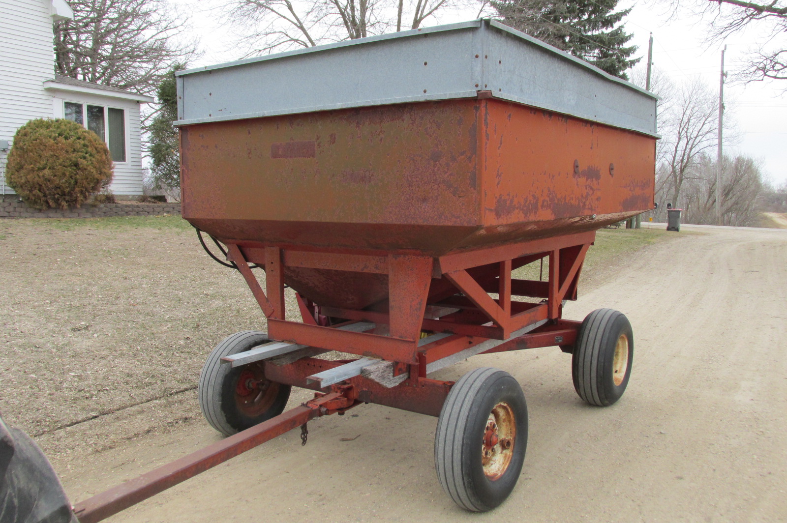 Nubilt Gravity box with 14 foot Sudenga hydraulic brush auger.Box has metal extensions.Wagon has flotation tires.