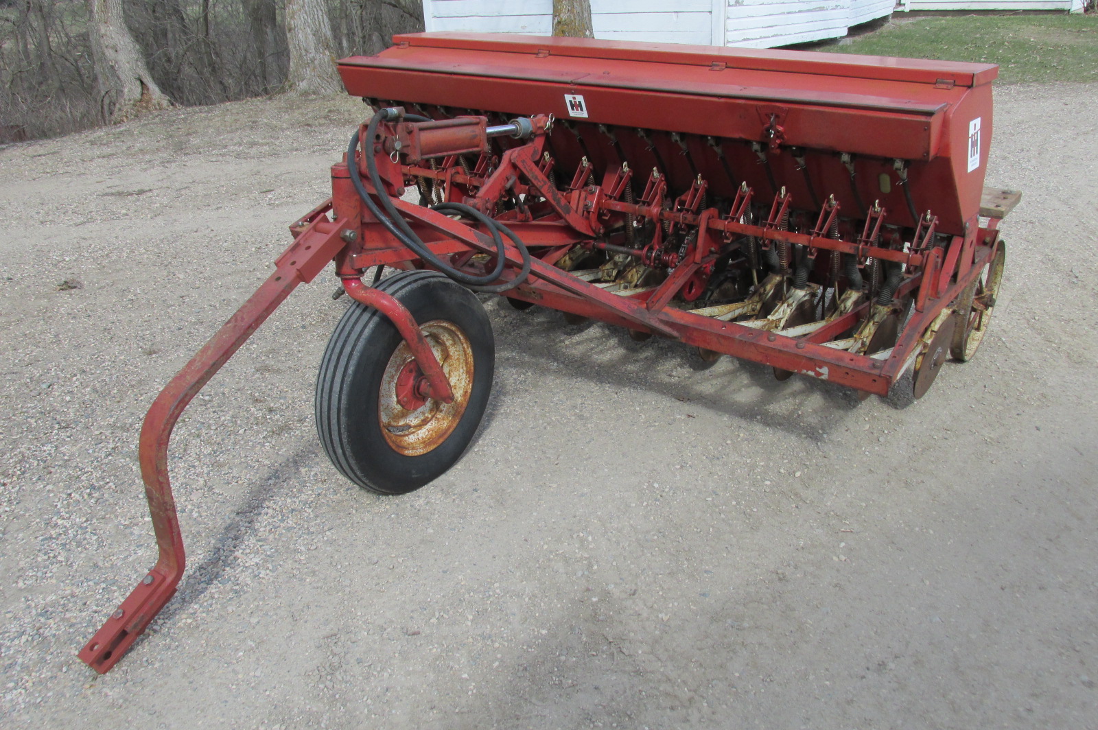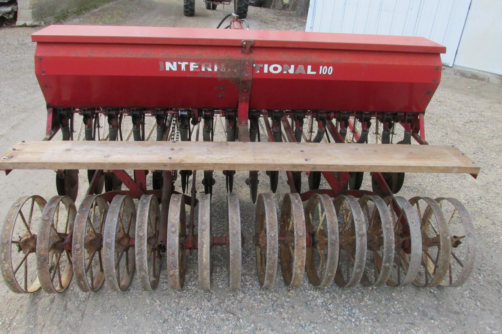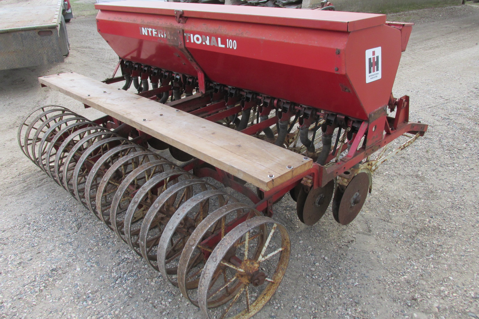 International model 100 8 foot (6"spacing) press grain drill with grass seeder attachment.Good blades, bearings, rock kickers and seed tubes.All rate adjustments move freely.Greased and field ready.Comes complete with hydraulic lift cylinder.Plants small grains, beans , alfalfa, clover and other small grass seeds.Great little drill for small acreage or wildlife plots.