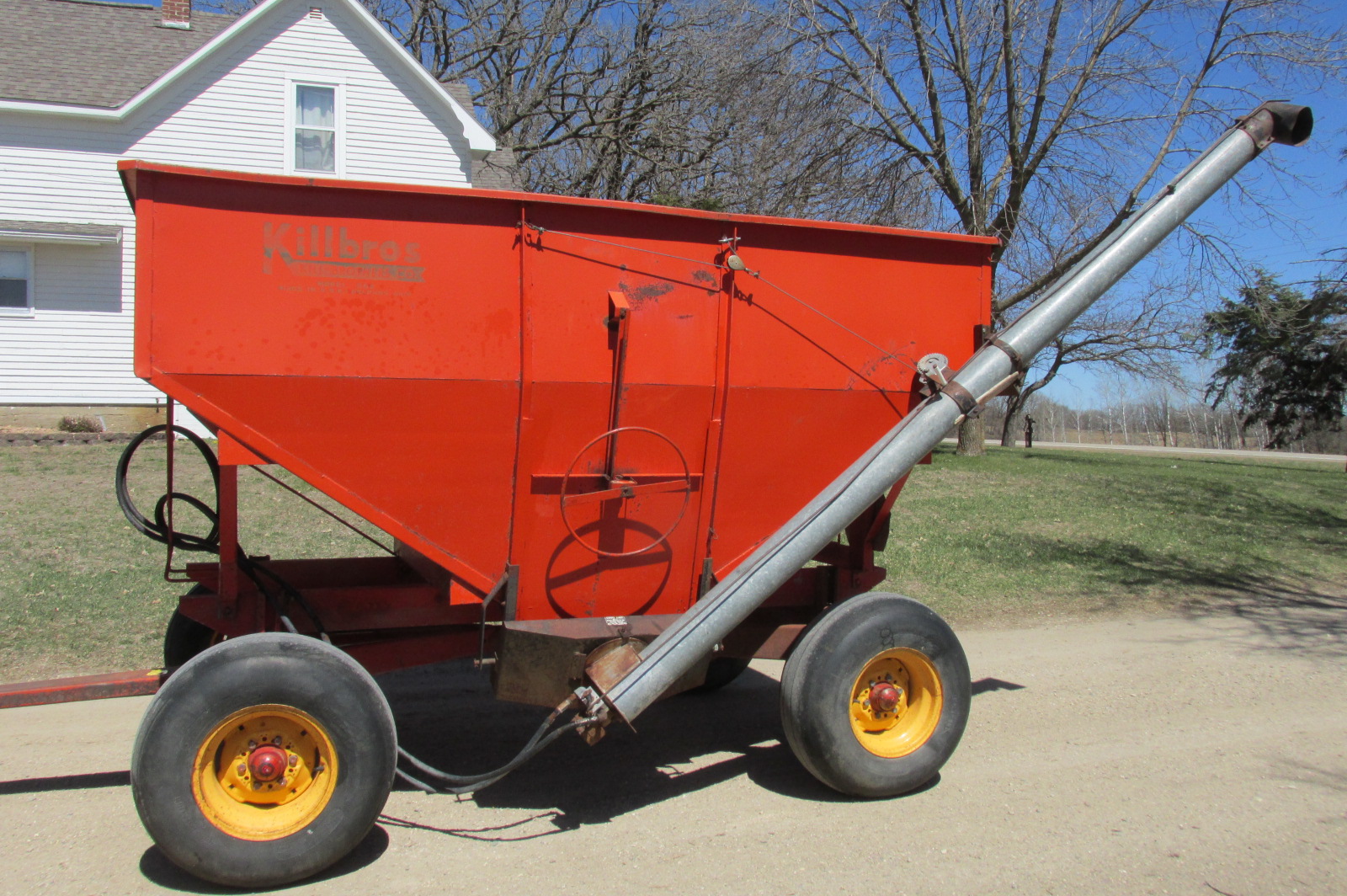 Killbros gravity box with 11ft Ficklin steel flighting hydraulic drill fill auger. Kewanee model 47 wagon with 12.5x15 flotation tires and extension hitch.